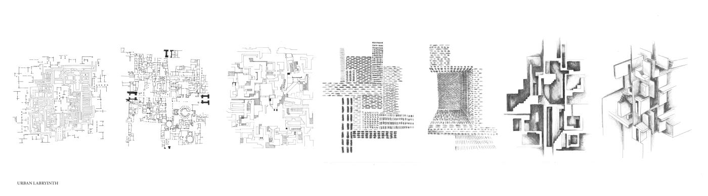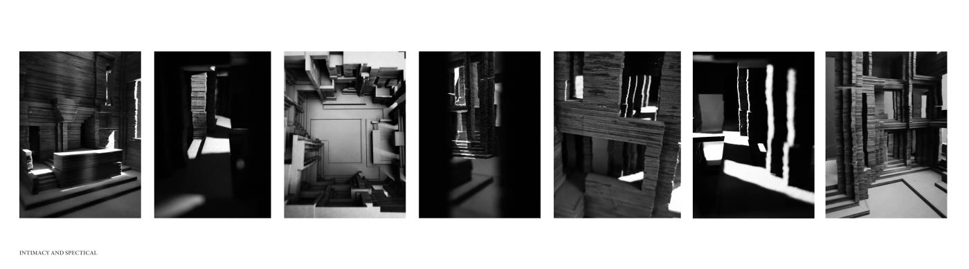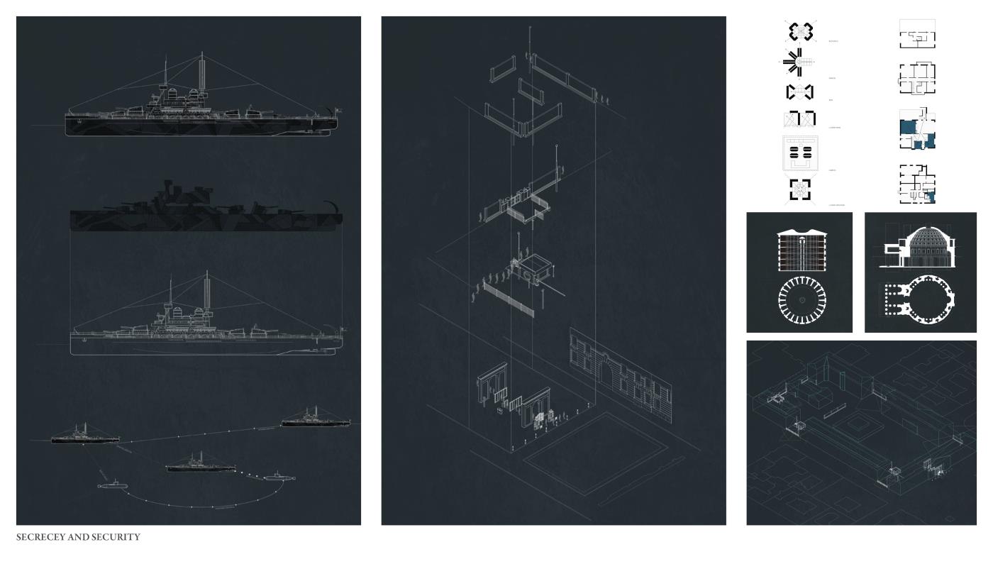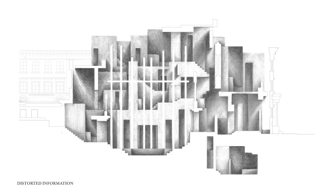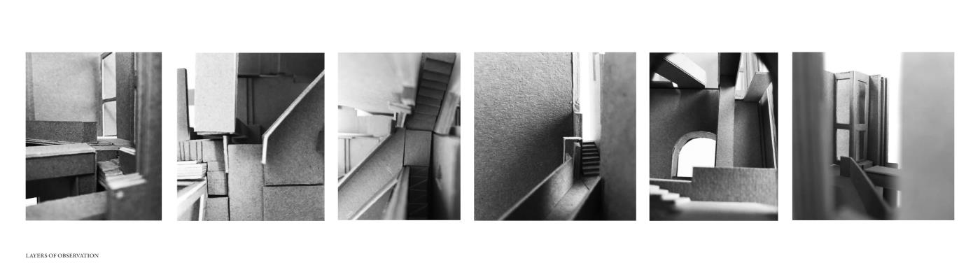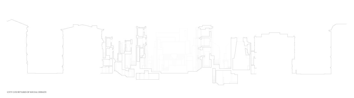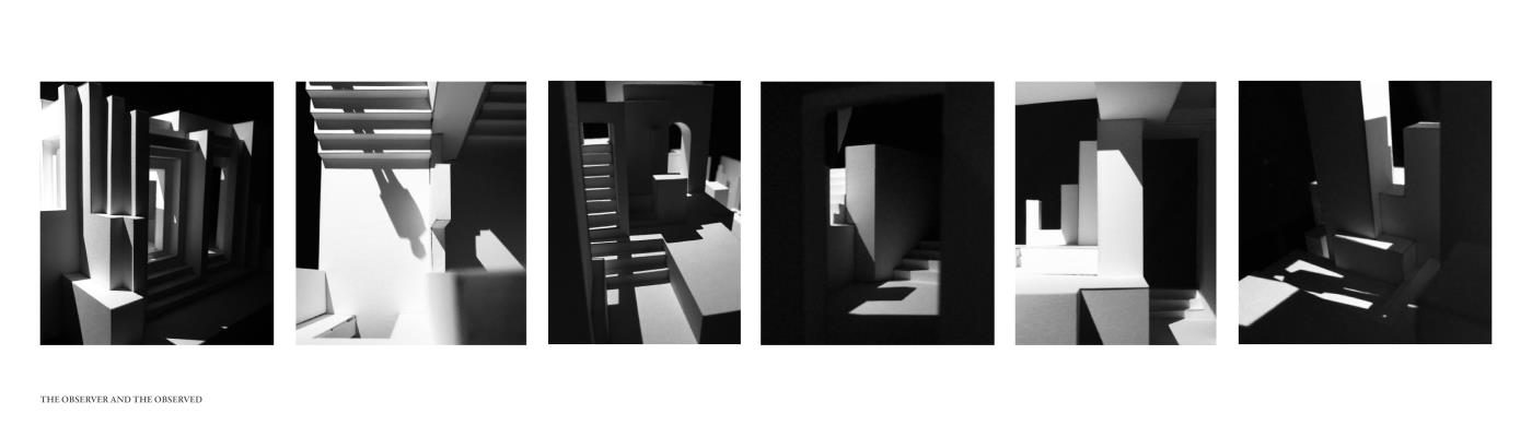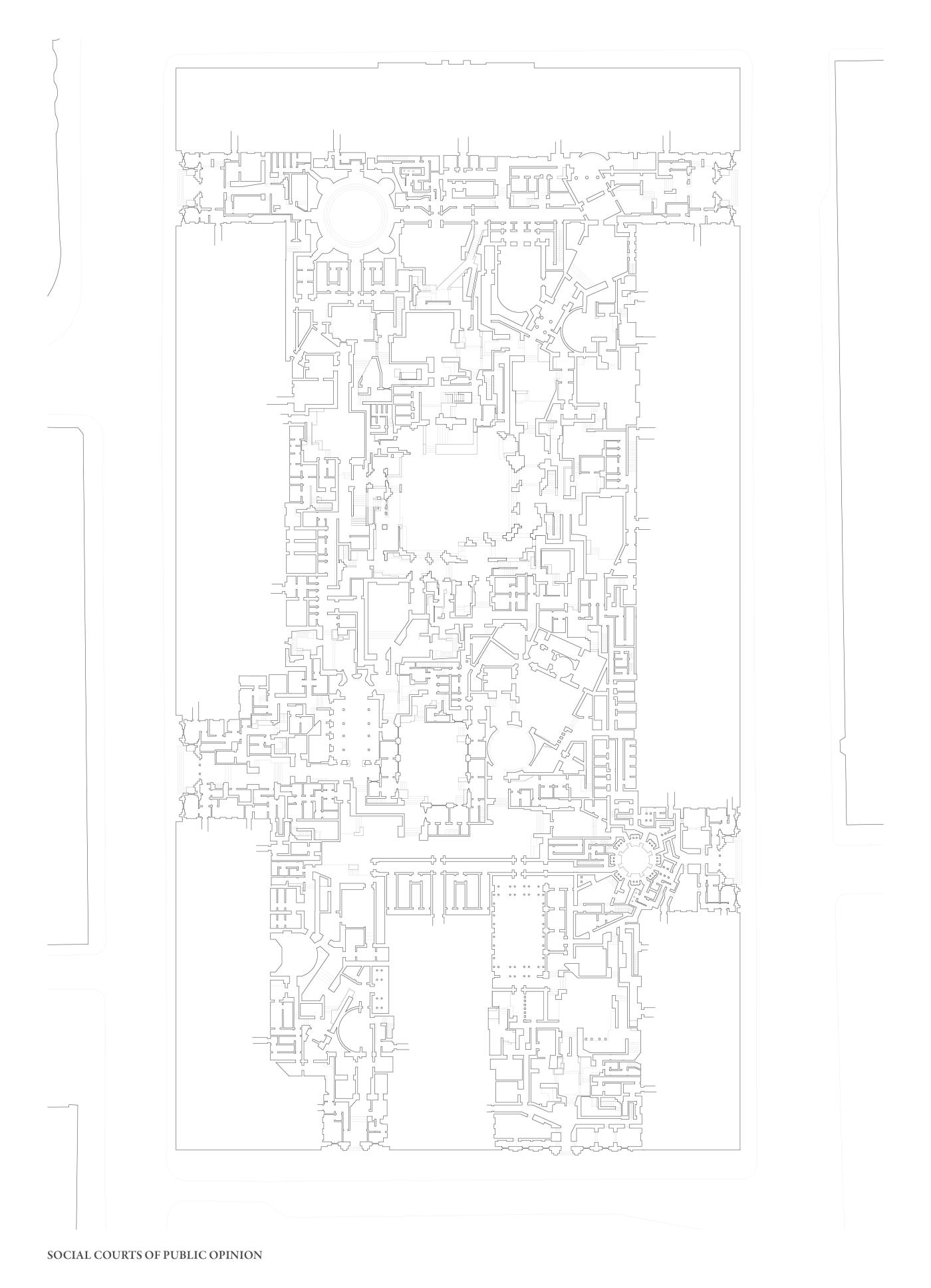 The Observer and The Observed Part 2 Project 2019 Roslyn Blackburn Queen's University Belfast | UK At a time of hyper-paranoia in a post industrialised society, there is a fear that is emergent in the social politics of our time; resulting in an economic order that structures our society that we have become subservient too.The program is a higher ‘court’ concerning the people, which monitors the judiciary through everyday social encounter and discussion. A deliberate tension between control and social democracy. By virtue of its organisation through the separation and overlapping of various routes by different users the social courts become complex by way of a labyrinthine theme. Utilising current and historic theories into physical spaces that are built around a set of stark spatial polarities set between public and private, observed and observer, accuser and accused. The interstitial spaces caught between the points of entry and routes of movement become inhabited by a network of ‘social courts’, being courtyards themselves, in the form of surrounded social programs such as a barber shop, a bar, a wine cellar, cafe and so on. Creating a public forum or small piece of city within the large, which in turn creates a form of social debate and order within a complexity of hierarchical state ruling. Tutor(s) Catherine Blaney Colm Moore