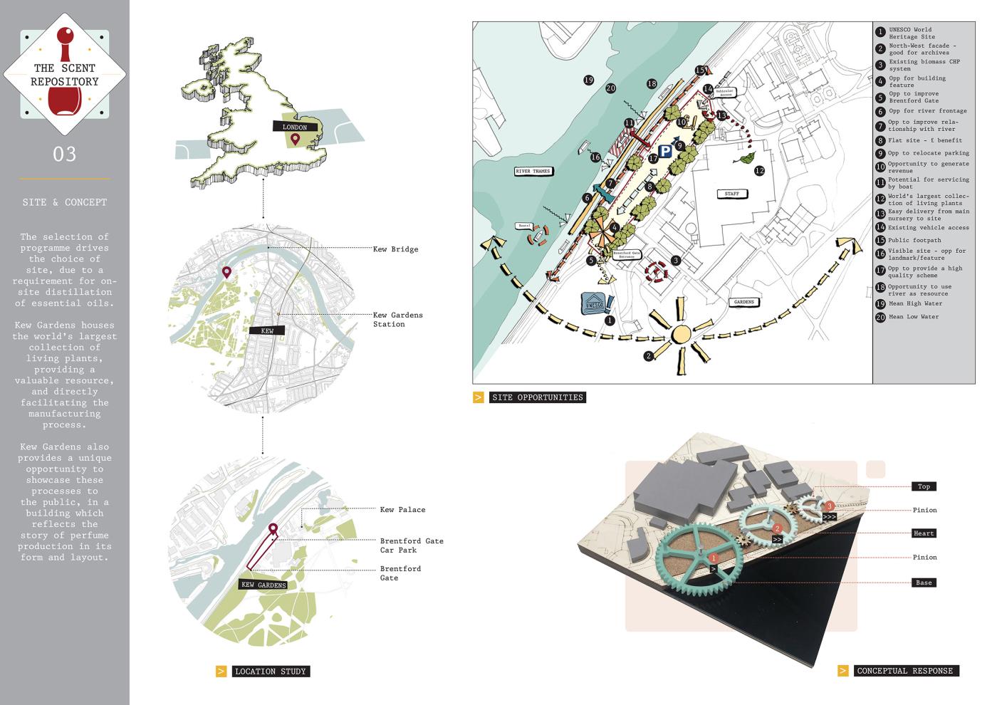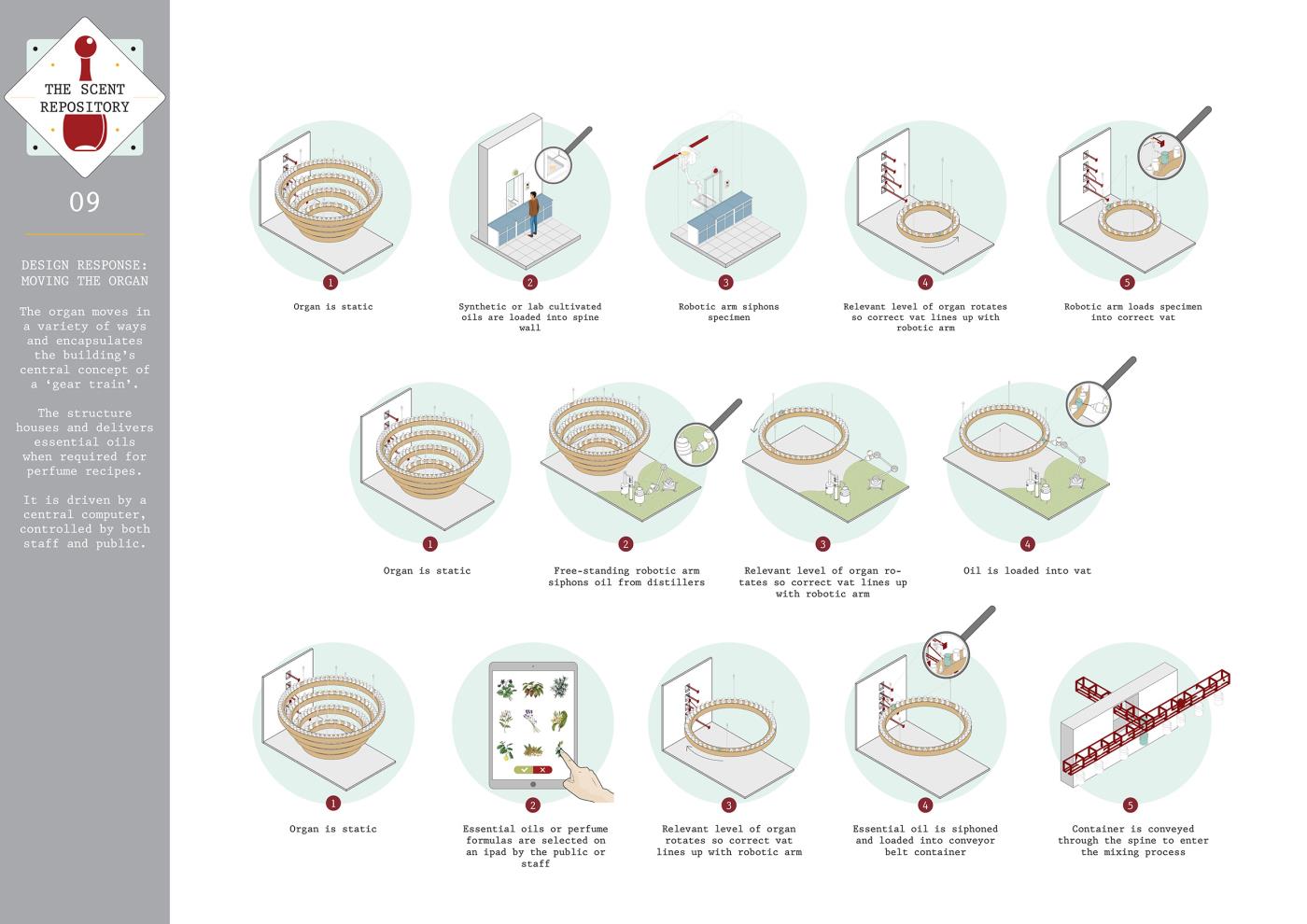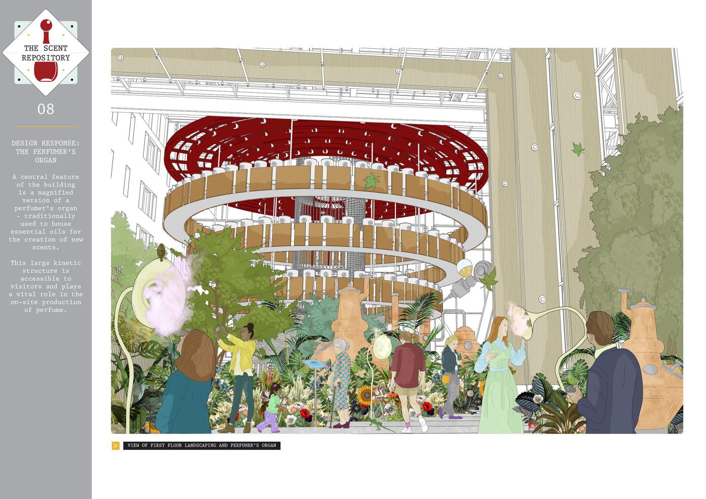 The Scent Repository: Performative Functionality Part 2 Project 2019 Alexandra Sims Cardiff University | UK This thesis project is concerned with investigating the idea of performative functionality and aims to achieve a truthful and engaging architecture through eliciting how a building and its components actually operate; knowledge which has become almost redundant in the existing technological age. The focus stems from early explorations of craft. Firstly, from an investigation into watchmaking and its componentry, and then subsequently from experimenting with kinetics, mechanics, gears and automata. The thesis manifested itself in the form of a perfume archive or ‘Scent Repository’ set in Kew Gardens, a UNESCO World Heritage Site. The proposal utilises kinetics and mechanics to unveil the perfume-making process to the user within the environment of a truthful and theatrical architecture. Tutor(s) Dr Steven Coombs