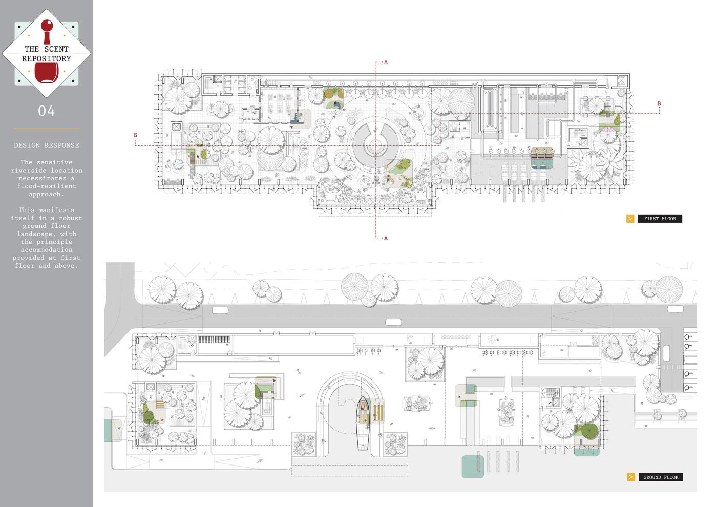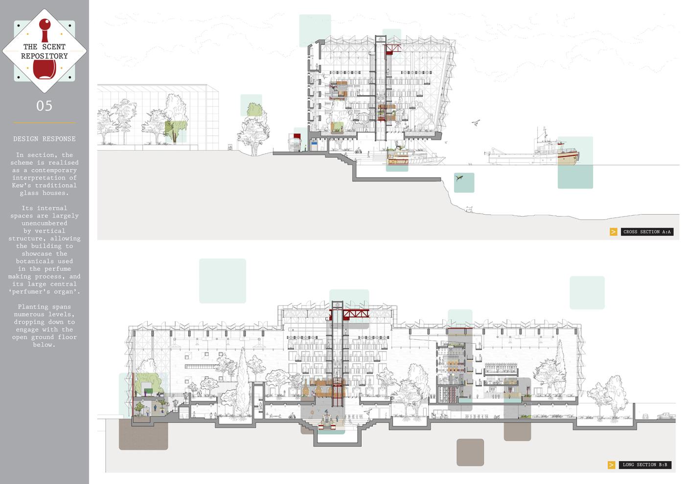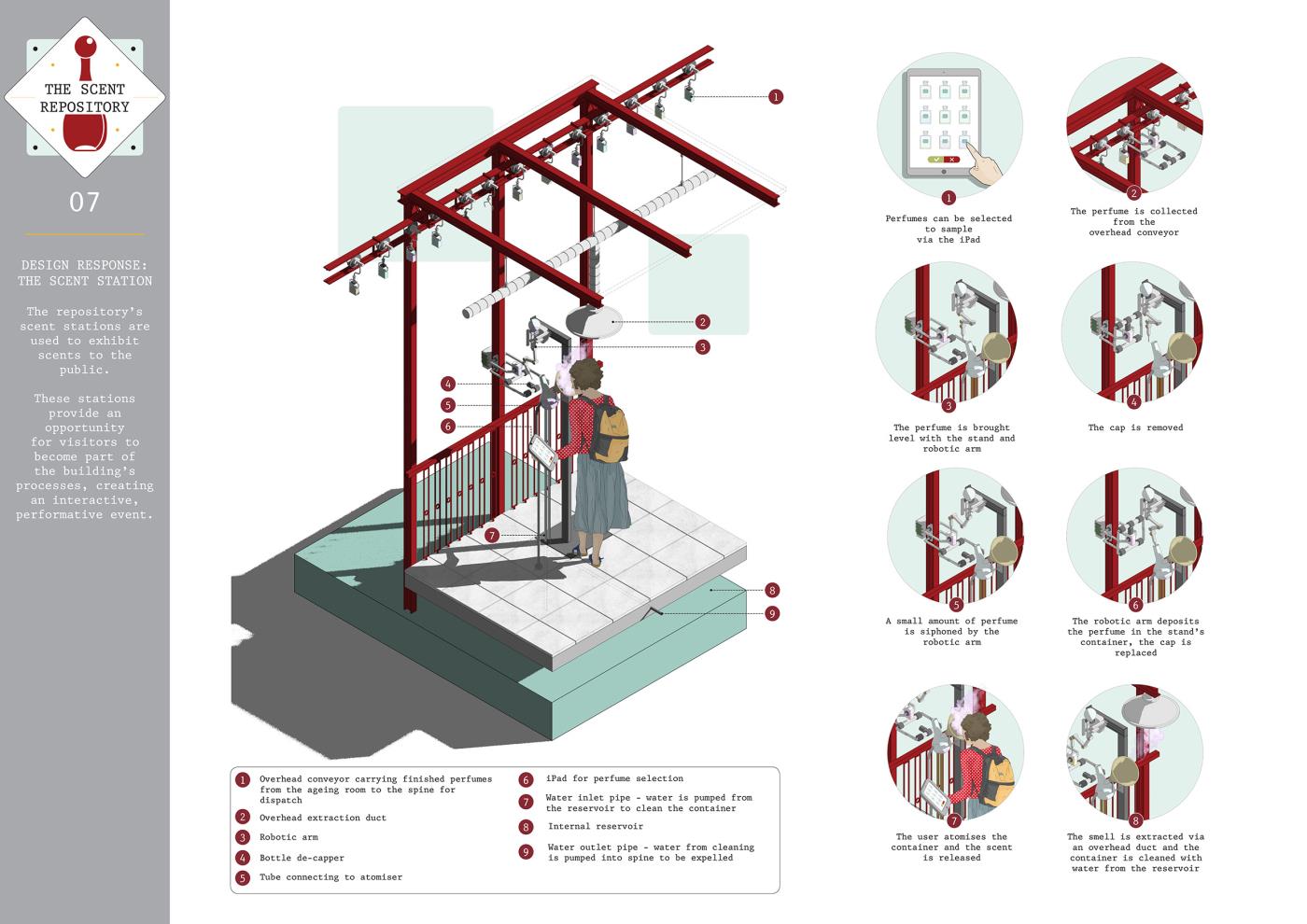 The Scent Repository: Performative Functionality Part 2 Project 2019 Alexandra Sims Cardiff University | UK This thesis project is concerned with investigating the idea of performative functionality and aims to achieve a truthful and engaging architecture through eliciting how a building and its components actually operate; knowledge which has become almost redundant in the existing technological age. The focus stems from early explorations of craft. Firstly, from an investigation into watchmaking and its componentry, and then subsequently from experimenting with kinetics, mechanics, gears and automata. The thesis manifested itself in the form of a perfume archive or ‘Scent Repository’ set in Kew Gardens, a UNESCO World Heritage Site. The proposal utilises kinetics and mechanics to unveil the perfume-making process to the user within the environment of a truthful and theatrical architecture. Tutor(s) Dr Steven Coombs