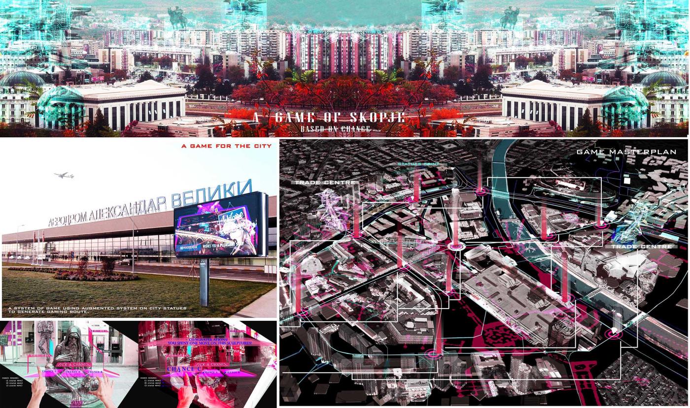 A Game of Skopje _ Based on Chance Part 2 Project 2019 Shook Yen Yap Oxford Brookes University Oxford | UK Based on the local gambling crisis and unsuccessful metabolist’s masterplan in Skopje, the game of Chance proposed a system of self-sustainable gaming route which allow visitors’ to trade for an ever changing hyped-reality space through the game. Envision of pushing the original ambition of the post-earthquake metabolist plan, the system reverse the crisis of “chance” into a self-growth plan to the city, masterplan as a game board, visitors as players, locals as dealer, city as winner. The idea of the project starts from the proposal of an augmented projection gaming system with the statues of Skopje 2014, the formation of networking across the city is controlled through the location of the statues, then predicts the urban growth of the city by overlaying the location of statues with the post-Earthquake masterplan route. Players will end up at the Trade Centre (Checkpoint) where their outcome of the game will be measured. Inspired from the metabolist, the Trade Centre offers a changeable Virtual Suite and underground Hyper-reality experience which can only be traded using Player’s outcome from the game. The Trade centre offers a pair of lens to the visitors to observe and critics the city, the gaming system ultimately hopes to reverse the real crisis of gambling in the city, by looping the virtual gaming system which will involve the city movement as its main generator. Tutor(s) Nicholas Boyarsky Louise Cann Jason Coleman