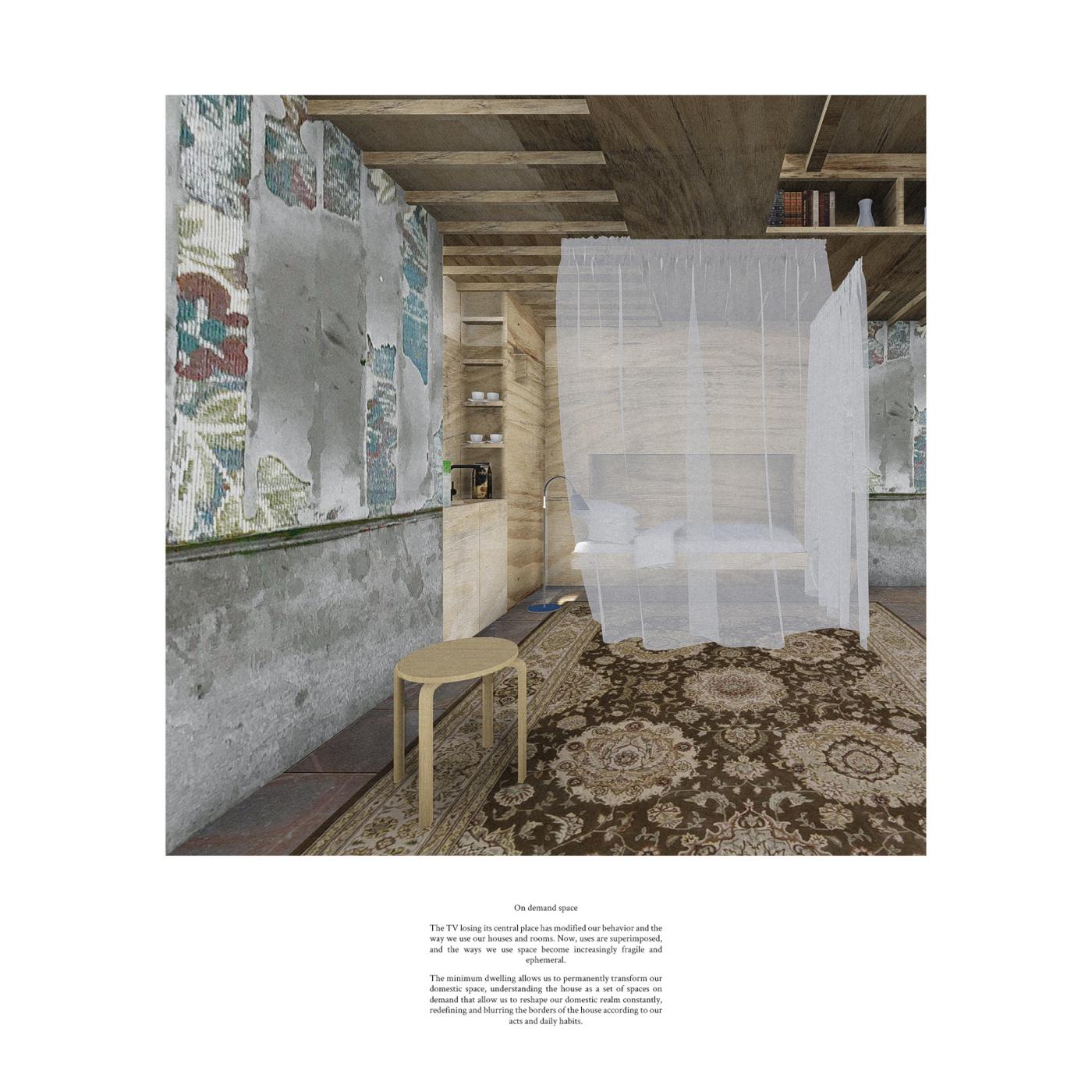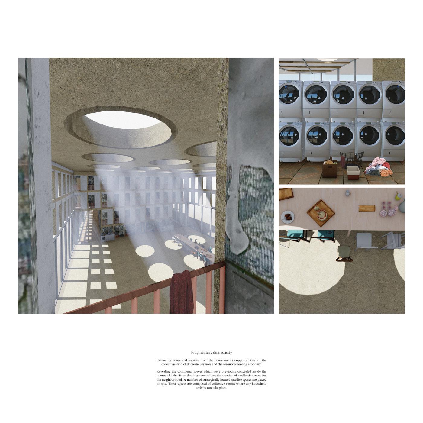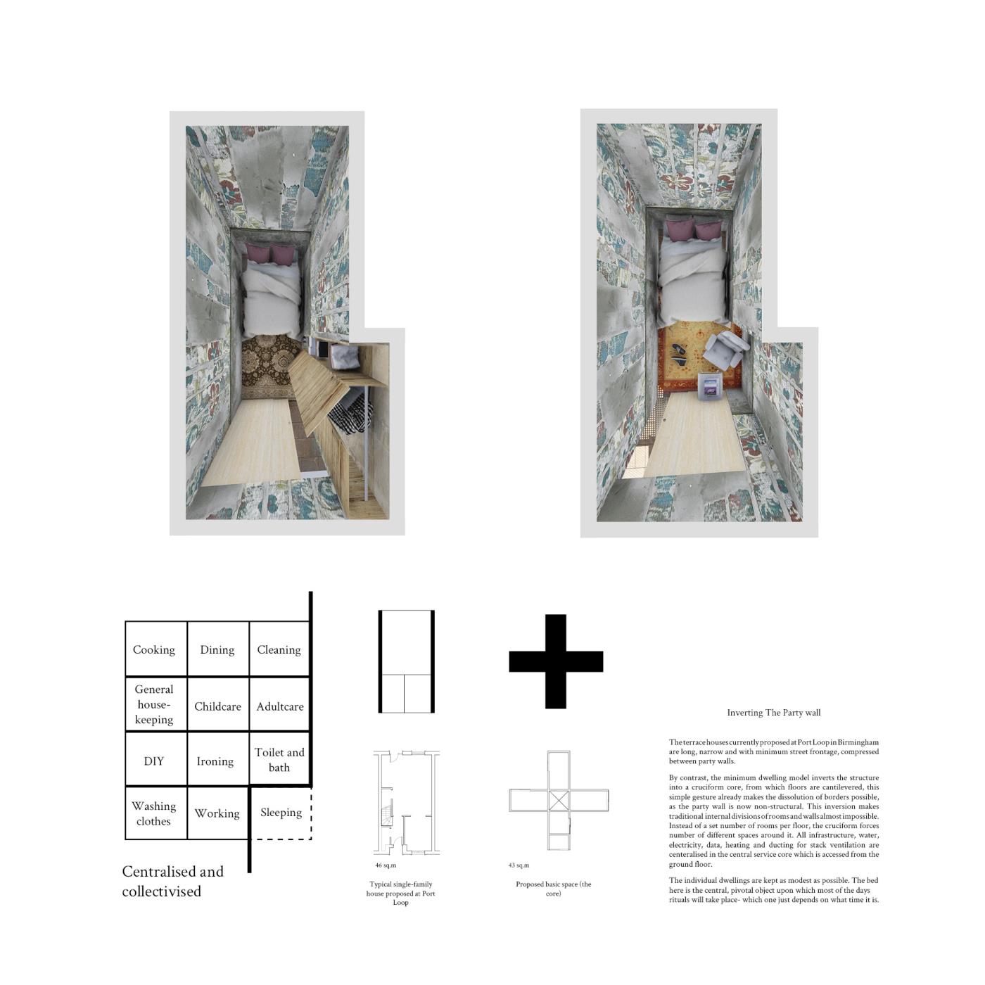 Living Together and Apart: An Exercise in Minimal Dwelling and Maximal Living Part 2 Project 2019 Maham Tahir Birmingham City University | UK The home is increasingly becoming an asset itself. With fast growing urban density, living space is shrinking as we enter a new era in which most urban dwellers cannot afford to own property. The standard single-family house is not only no longer suited to the budget, but also the needs and lifestyles of the majority. Social rituals, the demands of work and contemporary lifestyles in general have changed; domestic architecture has not. It only remains to determine how shifts in social habits and the dissolution of the nuclear family affects the domestic sphere. Challenging the dynamics of private developer-led housing at Port Loop in Birmingham, this project explores the origins and the ideology of the modernist Existenzminimum and presents a speculative proposal for the contemporary ‘universal basic space’- a housing typology against individualisation and ownership.The project challenges the patriarchal nature of the household and ideas around property and debt, and questions the role of domestic space as ‘private’ sphere. What happens if the ‘home’ is no longer a commodity but a universal basic right that can be granted to anyone in the form of a universal basic room, regardless of class, gender and age. Tutor(s) Robert Annable Michael Dring