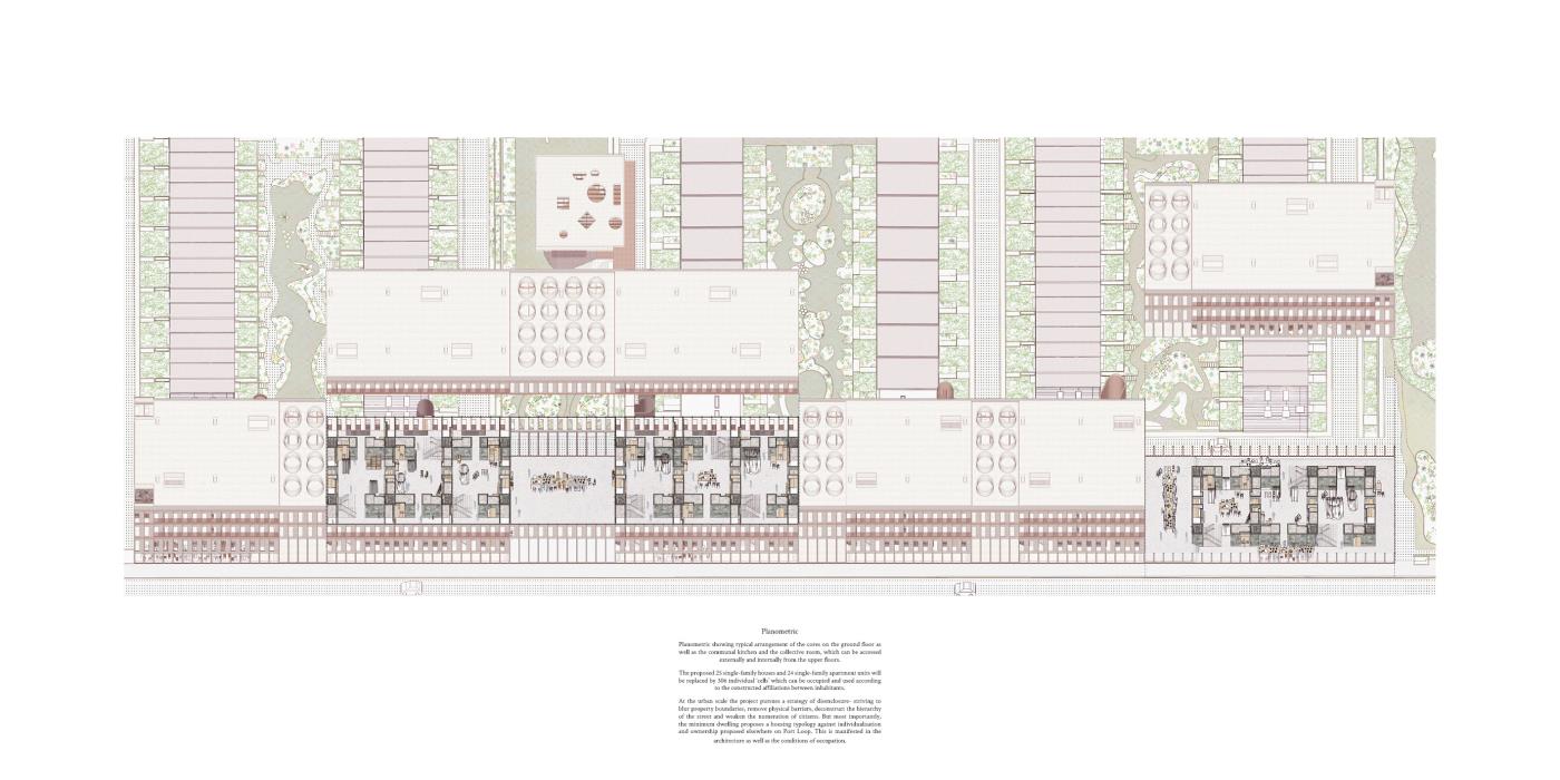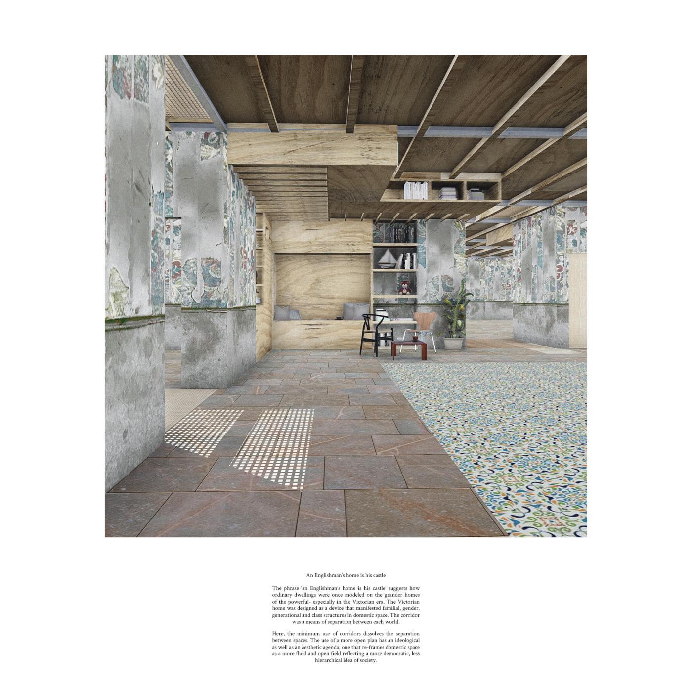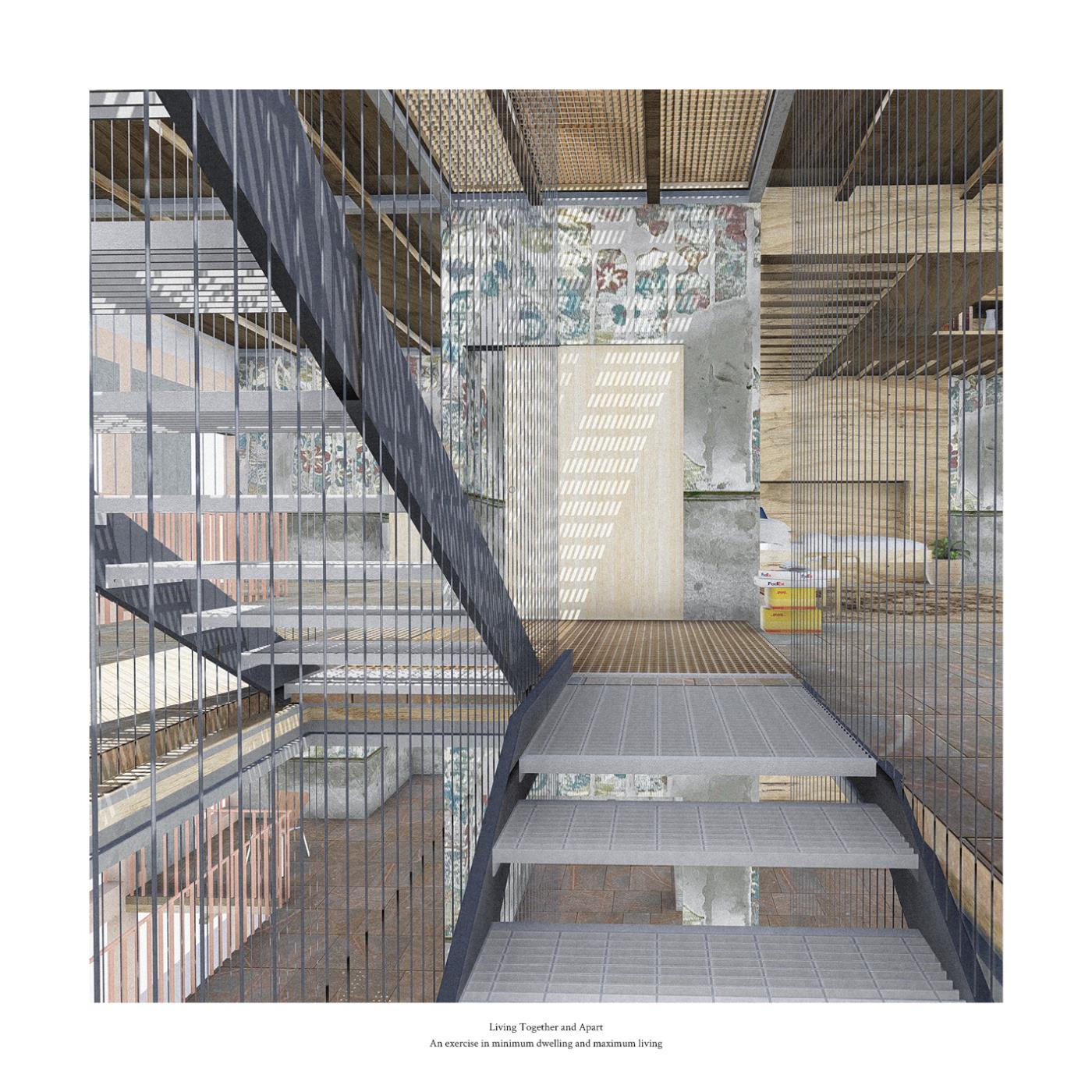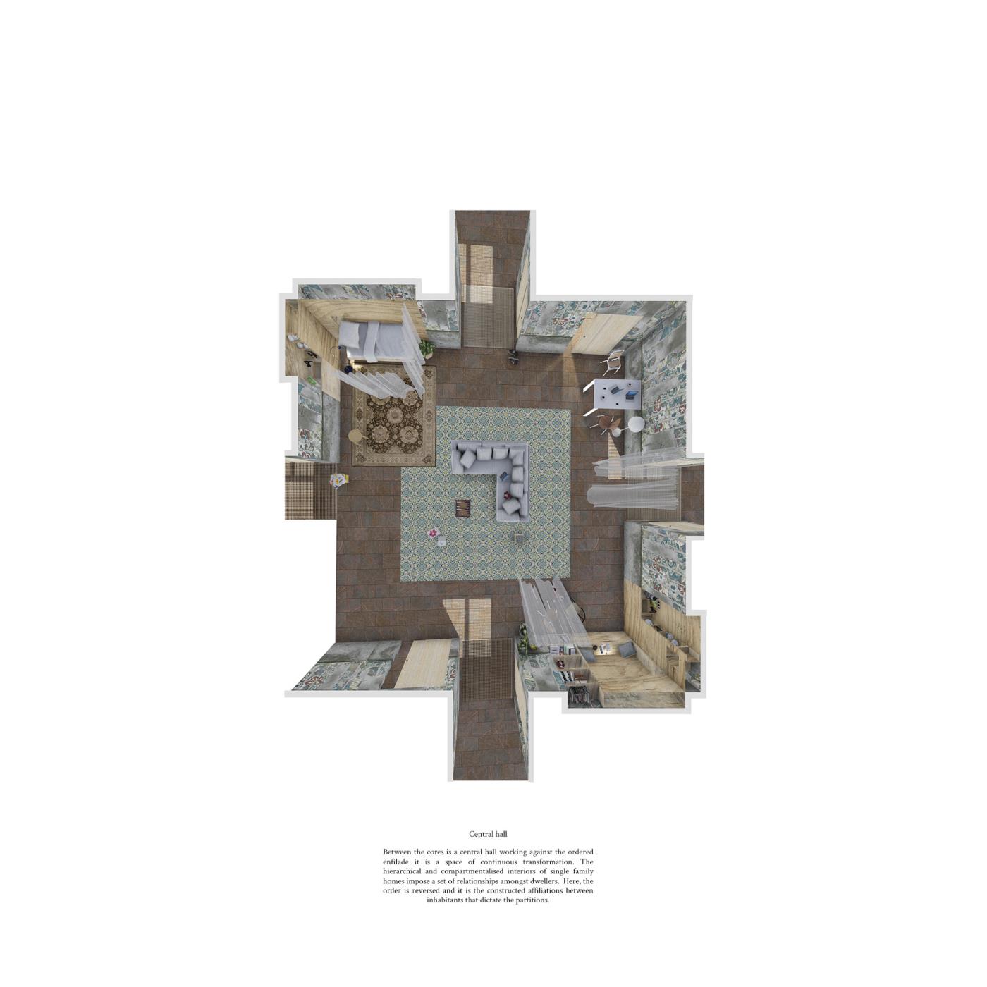 Living Together and Apart: An Exercise in Minimal Dwelling and Maximal Living Part 2 Project 2019 Maham Tahir Birmingham City University | UK The home is increasingly becoming an asset itself. With fast growing urban density, living space is shrinking as we enter a new era in which most urban dwellers cannot afford to own property. The standard single-family house is not only no longer suited to the budget, but also the needs and lifestyles of the majority. Social rituals, the demands of work and contemporary lifestyles in general have changed; domestic architecture has not. It only remains to determine how shifts in social habits and the dissolution of the nuclear family affects the domestic sphere. Challenging the dynamics of private developer-led housing at Port Loop in Birmingham, this project explores the origins and the ideology of the modernist Existenzminimum and presents a speculative proposal for the contemporary ‘universal basic space’- a housing typology against individualisation and ownership.The project challenges the patriarchal nature of the household and ideas around property and debt, and questions the role of domestic space as ‘private’ sphere. What happens if the ‘home’ is no longer a commodity but a universal basic right that can be granted to anyone in the form of a universal basic room, regardless of class, gender and age. Tutor(s) Robert Annable Michael Dring