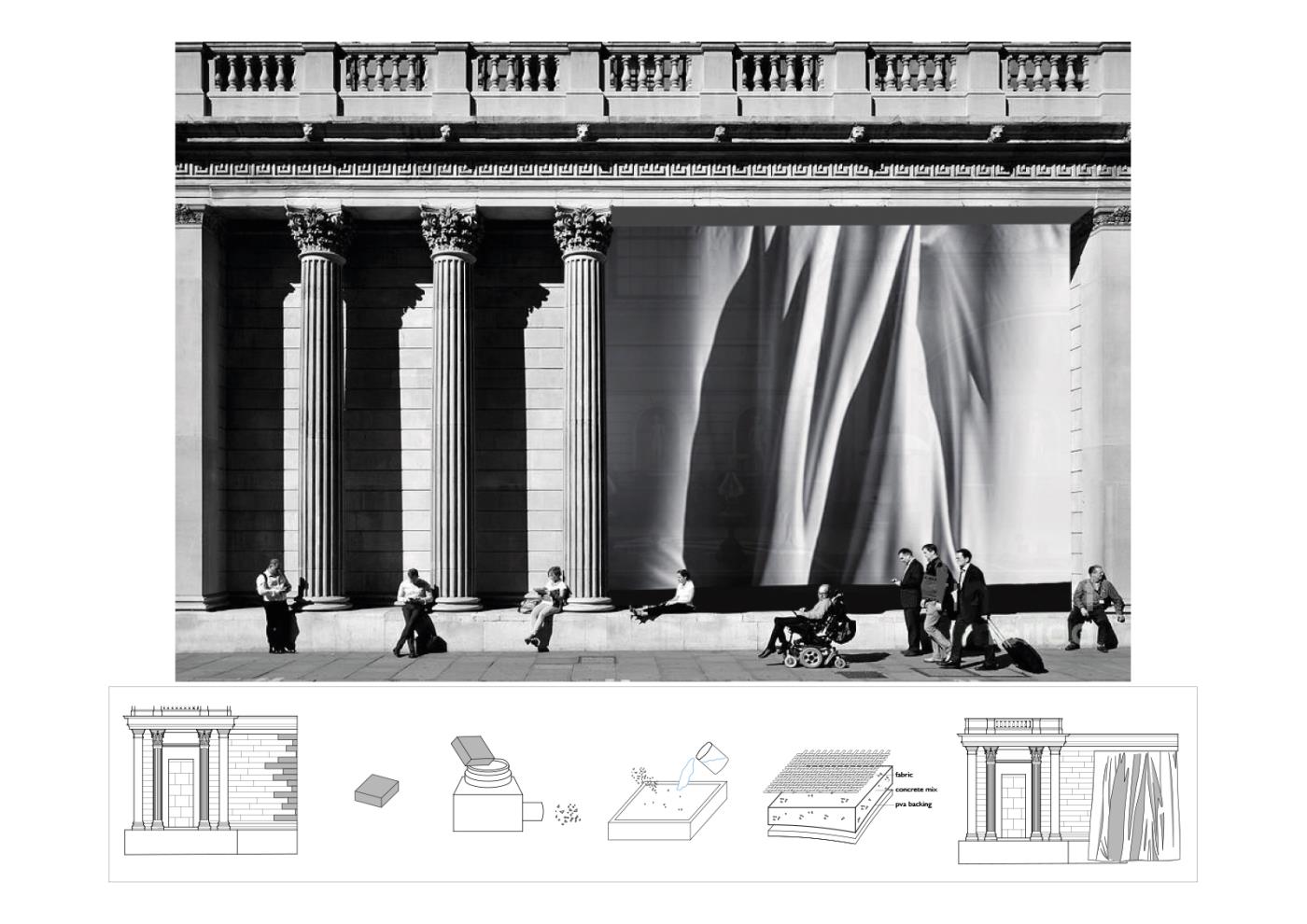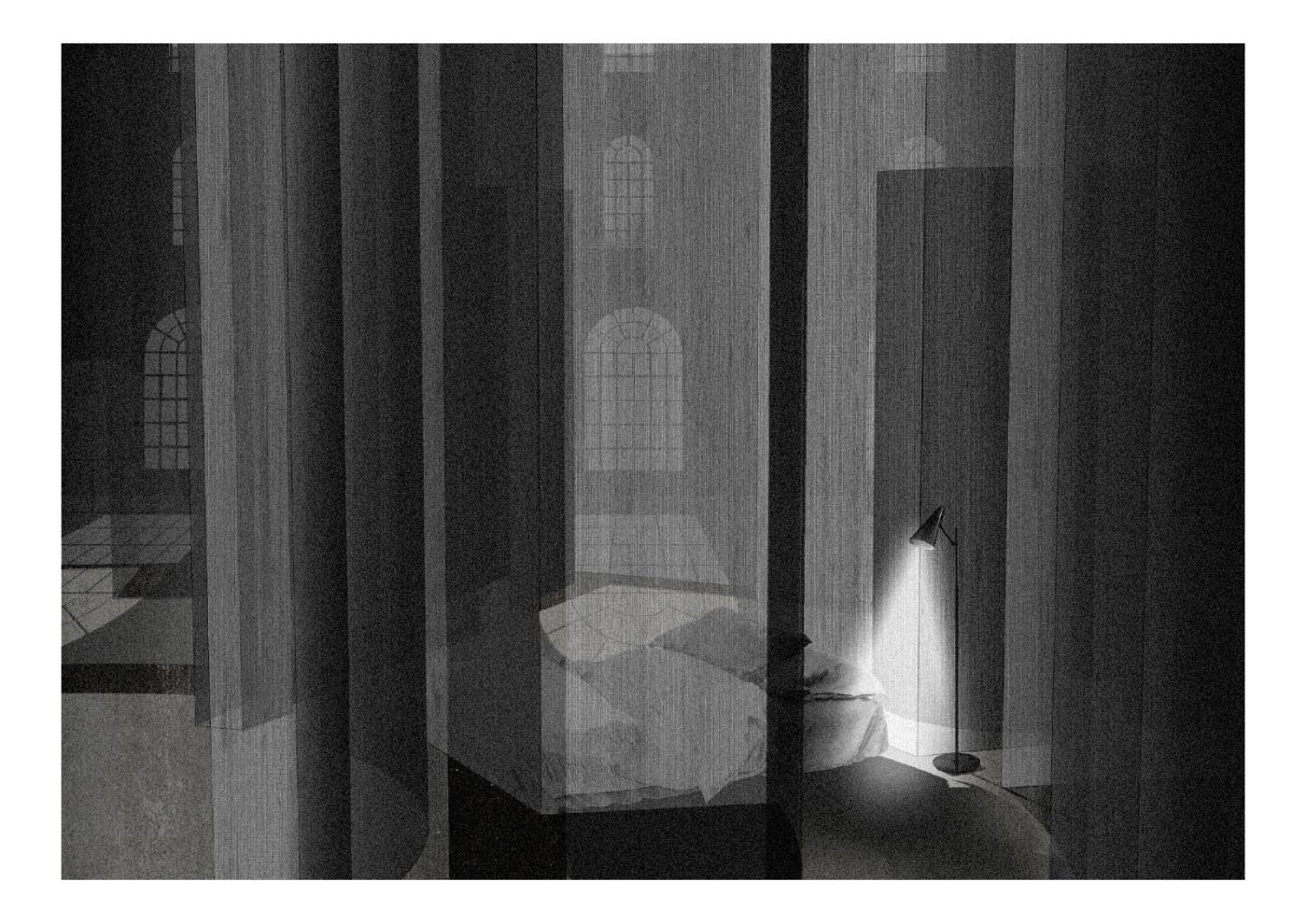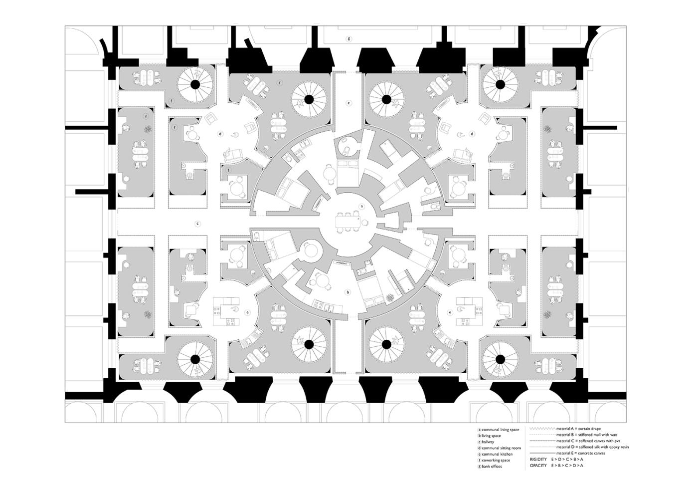 Bank of Collaboration Part 1 Project 2019 Da Gyung Lee Architectural Association London | UK The Bank of Collaboration infiltrates and dissolves the solidified walls of power, occupying them with a new co-living / learning ‘academy’ in the heart of the City of London.The project is a self-build system that metabolises Sir John Soane’s original Bank of England curtain walls to create stone-dust hardened fabric that the resident students use to construct the academy. This series of structural and soft curtain enclosures creates translucent living/learning zones that penetrate the bank as accessible courtyards, referencing Soane’s original design.The fabric structures diffuse the traditional visual and acoustic boundaries of public / private and living / learning spaces. The interlocked poche zones of program create an intimacy of domesticity and education. Spatial and political hierarchies can no longer exist here.While the Bank tries to continue ‘business as usual’ the trading telephone call is disrupted by the student’s lecture on the Medici Palace. A visit to the gold vaults is disturbed by the smell of fermenting kimchi, and manifesto chanting. Slowly the segregation that is created and represented by the fortress of the Bank of England starts to disintegrate, leaving a ruin of our current patriarchal society, and hope for a more collaborative future. Tutor(s) Alexandra Butterworth Lily Jencks Jessica Reynolds