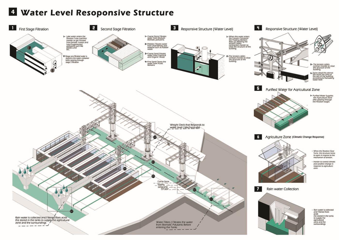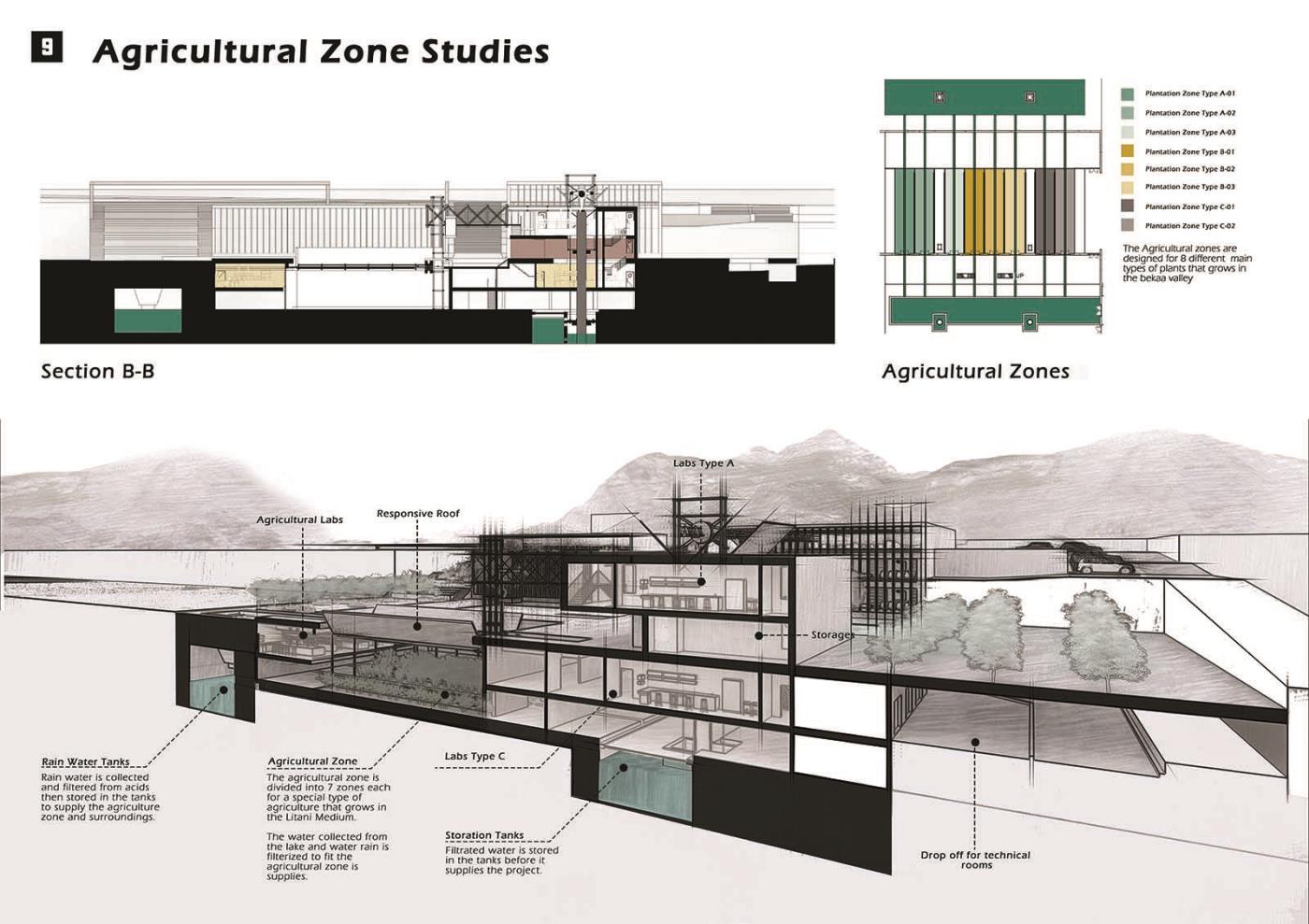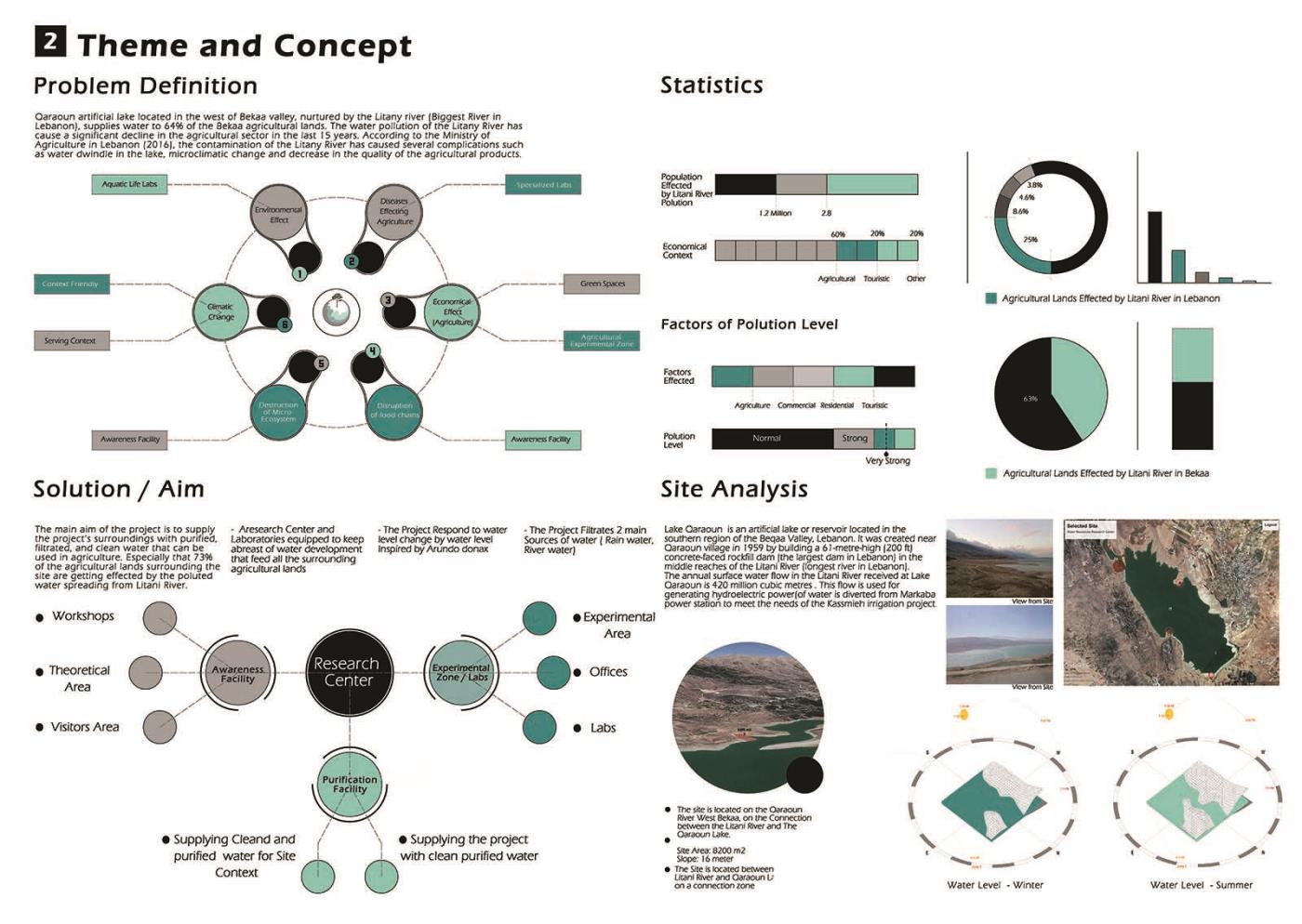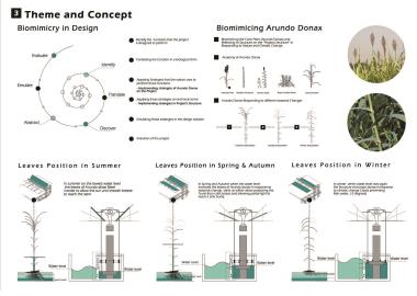 The main aim of the project is Achieving sustainable built environments with low impacts on the natural environment and supplying its surrounding with purified, filtered, and clean water that can be used in Bekaa’s agricultural field. This is implemented in the design by mimicking the Cane Plant which grows on the banks of the Litany River, and applying its responses to water level, climatic change, water filtration and purification. The responsive mechanisms are applied in the structural systems, which in return correspond to the water level changes. By exploring nature’s design and introducing biomimicry (the act of mimicking or copying biology) the obvious clues in nature can be applied to architecture which will ultimately result in the creation of a hybrid building- a building self-sustaining and adaptive to its surroundings. Accordingly, the project naturally reacts to micro-climatic changes ensuring balanced environmental control inspired by nature and designed on environmental guidelines. The whole structure of the project shown and explained on board 2 and 3 on a one main guideline nothing can respond to nature better than nature itself.