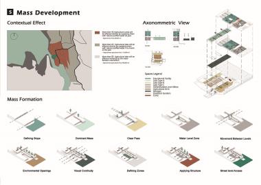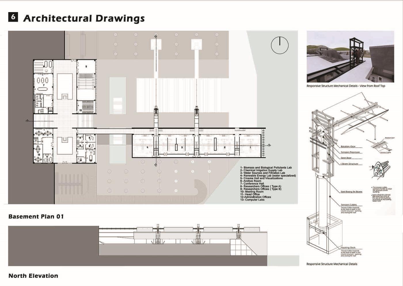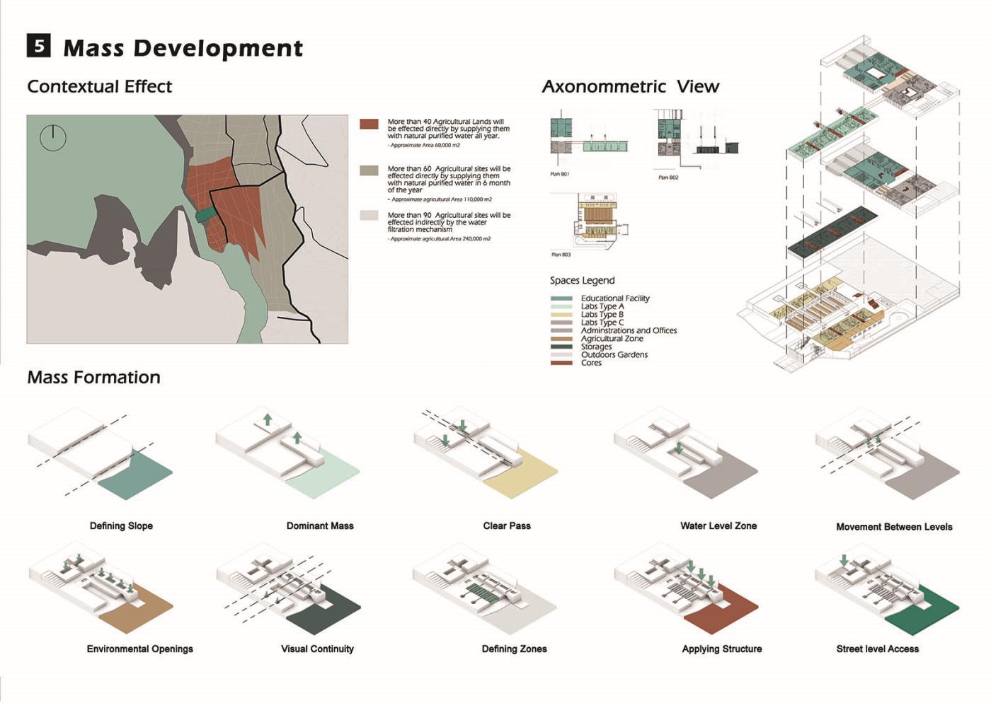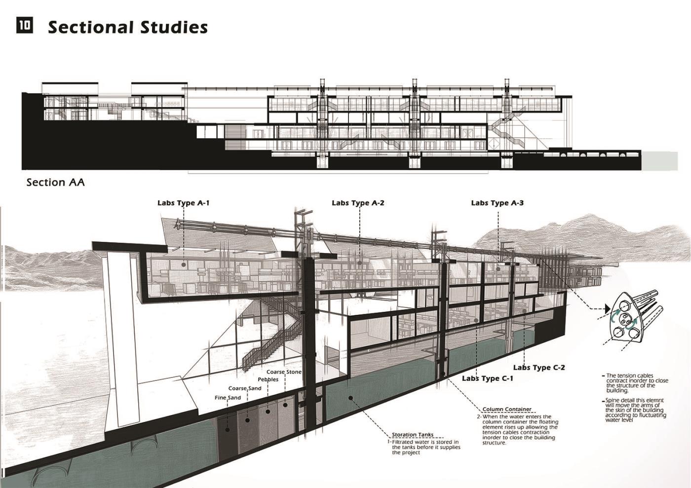 The main aim of the project is Achieving sustainable built environments with low impacts on the natural environment and supplying its surrounding with purified, filtered, and clean water that can be used in Bekaa’s agricultural field. This is implemented in the design by mimicking the Cane Plant which grows on the banks of the Litany River, and applying its responses to water level, climatic change, water filtration and purification. The responsive mechanisms are applied in the structural systems, which in return correspond to the water level changes. By exploring nature’s design and introducing biomimicry (the act of mimicking or copying biology) the obvious clues in nature can be applied to architecture which will ultimately result in the creation of a hybrid building- a building self-sustaining and adaptive to its surroundings. Accordingly, the project naturally reacts to micro-climatic changes ensuring balanced environmental control inspired by nature and designed on environmental guidelines. The whole structure of the project shown and explained on board 2 and 3 on a one main guideline nothing can respond to nature better than nature itself.