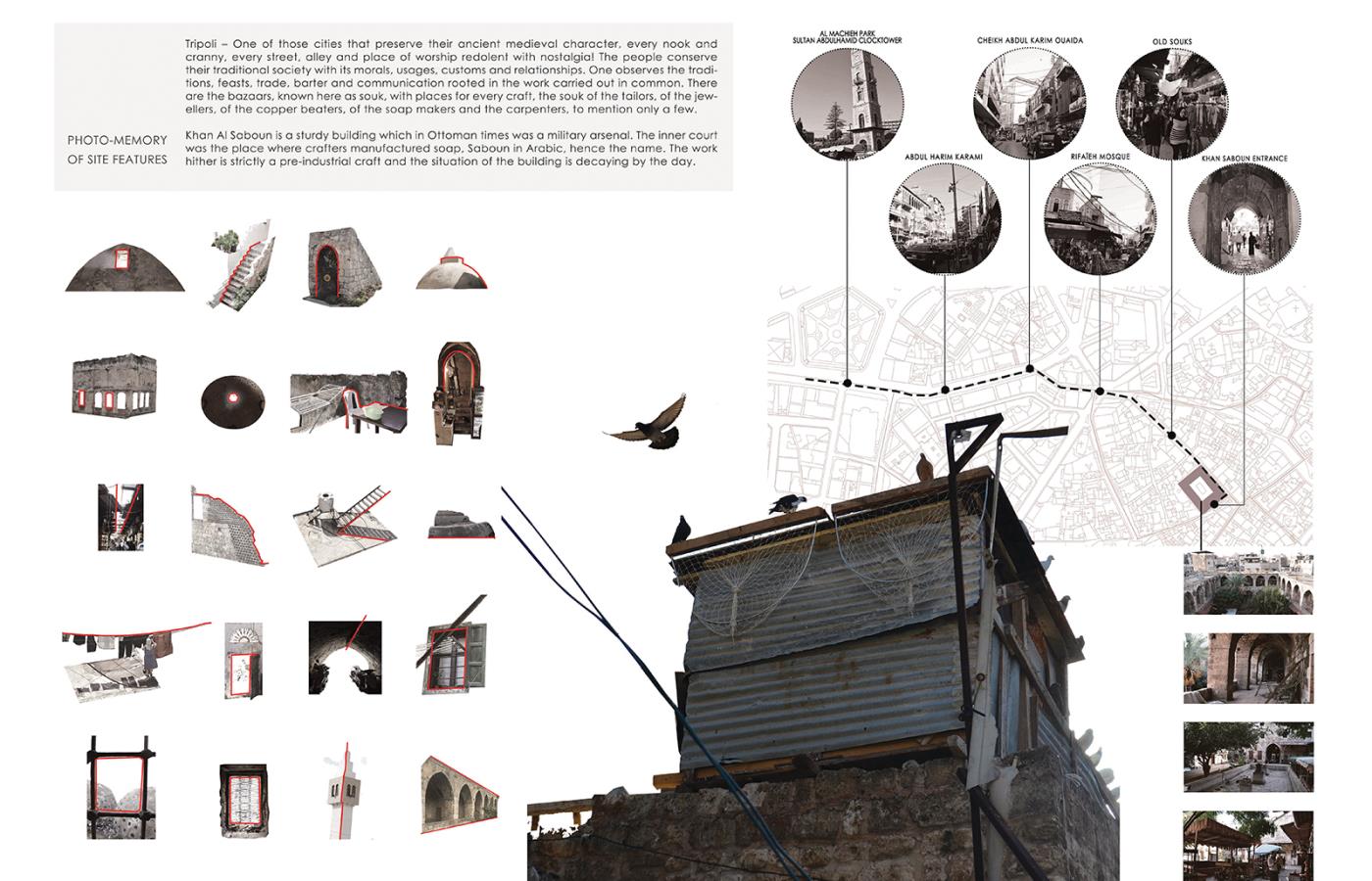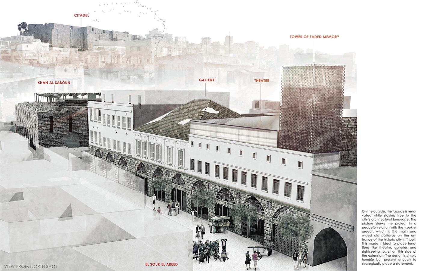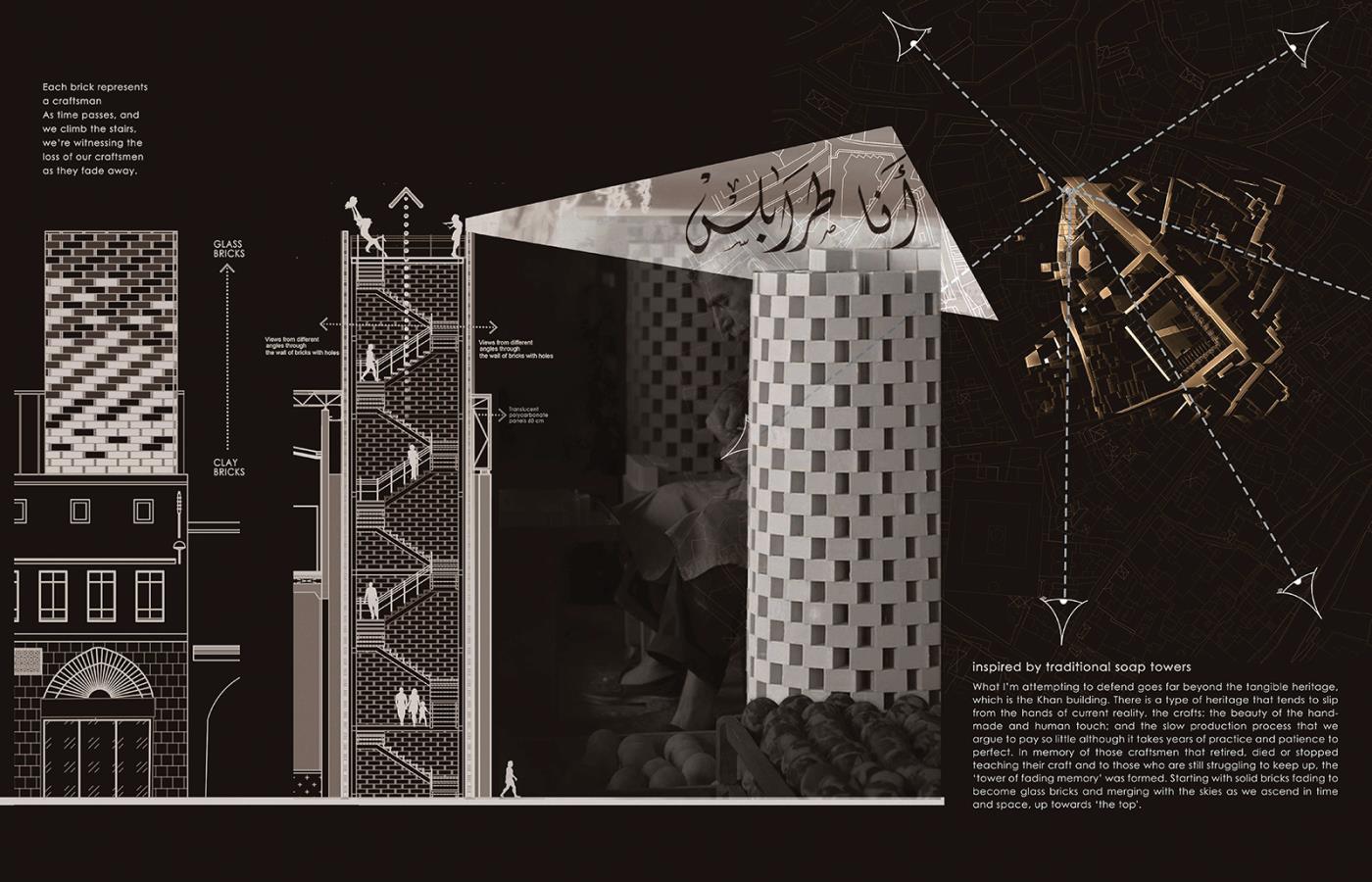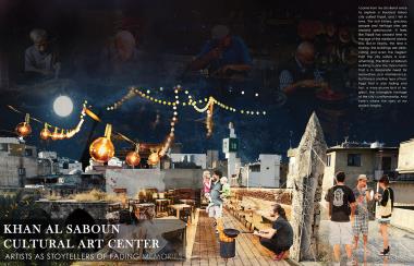 Artists as Storytellers of Fading Memories. Khan Al Saboun Cultural Art Center, Tripoli Part 2 Project 2019 Mounira El Halabi Beirut Arab University - Tripoli campus | Lebanon What is a memory? According to Halbwachs (1976), memory is "a reconstruction of the past using data from the present". Monuments and performances serving this kind of collective memory are located at highly symbolic places. They are primarily supposed to educate, or re-educate the observer to create national identity and unity, and to foster commonly shared interpretations of history. My project reflects the spirit of Tripoli's Old City to be seen, for the first time, repeatedly discovering this hidden gem.The main concept is experiencing the old city in all 'her' states. To be able to interact with the city's architectural features and social structure from above (roofs and flying platforms) and below (streets and ground exhibitions). The project exists in a subtle way to serve its purpose in total harmony from the outside. But from the inside, the project comes to life with vibrant and playful spaces reviving traditions of the old city’s history of art and craftsmanship. I come from Beirut, a war-torn city that was destructed and rebuilt with no character and no memory. I am desperately trying to prevent Tripoli from becoming the second Beirut. This project is an alarming call. Tutor(s) Ahmed El Husseini Eslam El Samahy Walid Makkouk