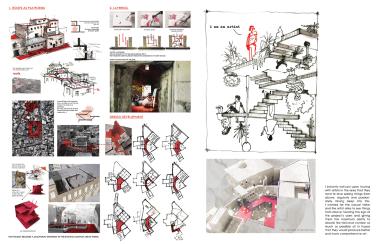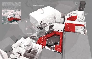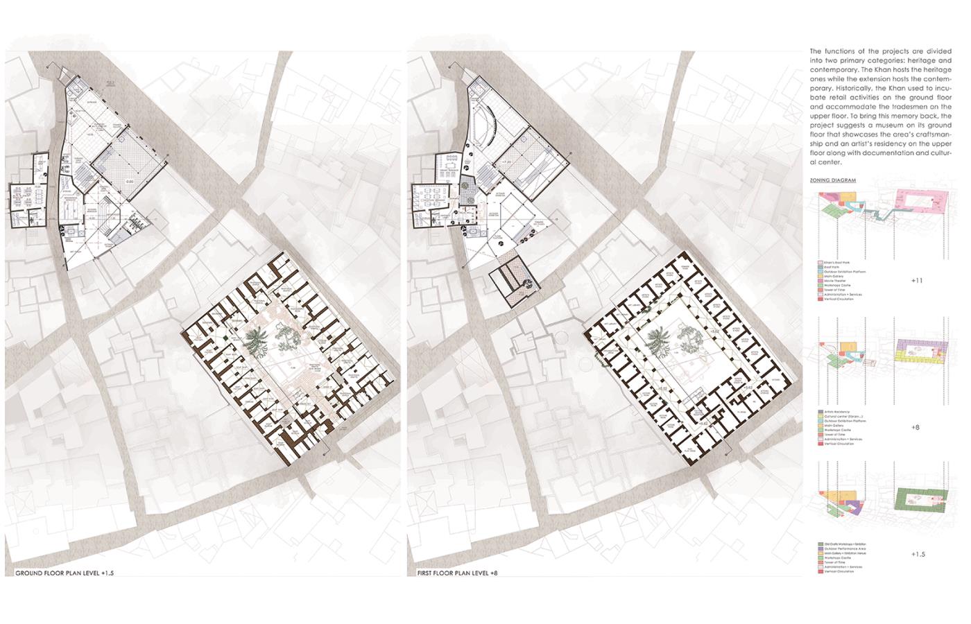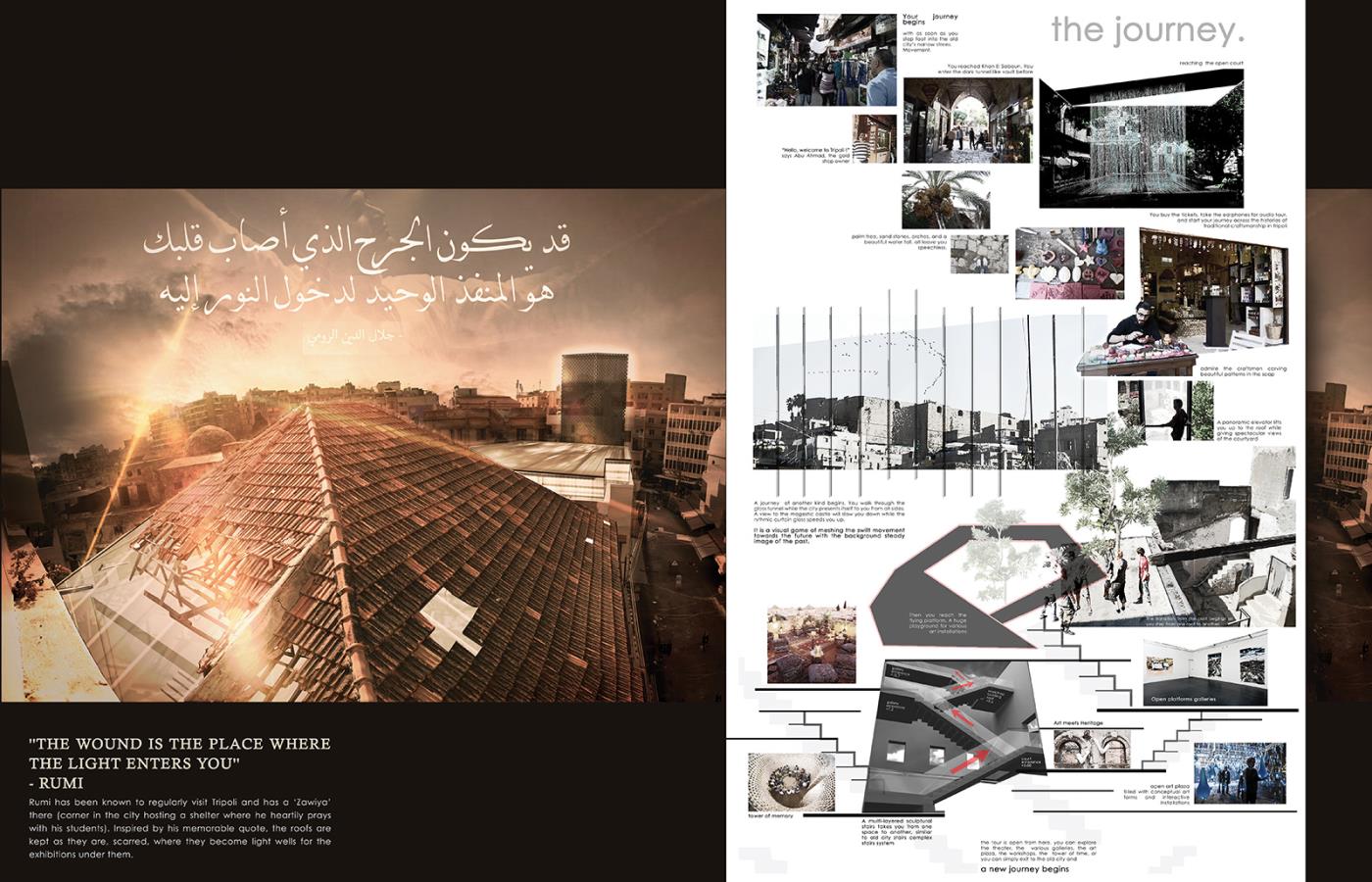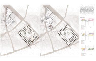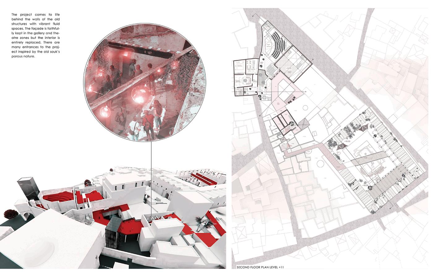 Artists as Storytellers of Fading Memories. Khan Al Saboun Cultural Art Center, Tripoli Part 2 Project 2019 Mounira El Halabi Beirut Arab University - Tripoli campus | Lebanon What is a memory? According to Halbwachs (1976), memory is "a reconstruction of the past using data from the present". Monuments and performances serving this kind of collective memory are located at highly symbolic places. They are primarily supposed to educate, or re-educate the observer to create national identity and unity, and to foster commonly shared interpretations of history. My project reflects the spirit of Tripoli's Old City to be seen, for the first time, repeatedly discovering this hidden gem.The main concept is experiencing the old city in all 'her' states. To be able to interact with the city's architectural features and social structure from above (roofs and flying platforms) and below (streets and ground exhibitions). The project exists in a subtle way to serve its purpose in total harmony from the outside. But from the inside, the project comes to life with vibrant and playful spaces reviving traditions of the old city’s history of art and craftsmanship. I come from Beirut, a war-torn city that was destructed and rebuilt with no character and no memory. I am desperately trying to prevent Tripoli from becoming the second Beirut. This project is an alarming call. Tutor(s) Ahmed El Husseini Eslam El Samahy Walid Makkouk