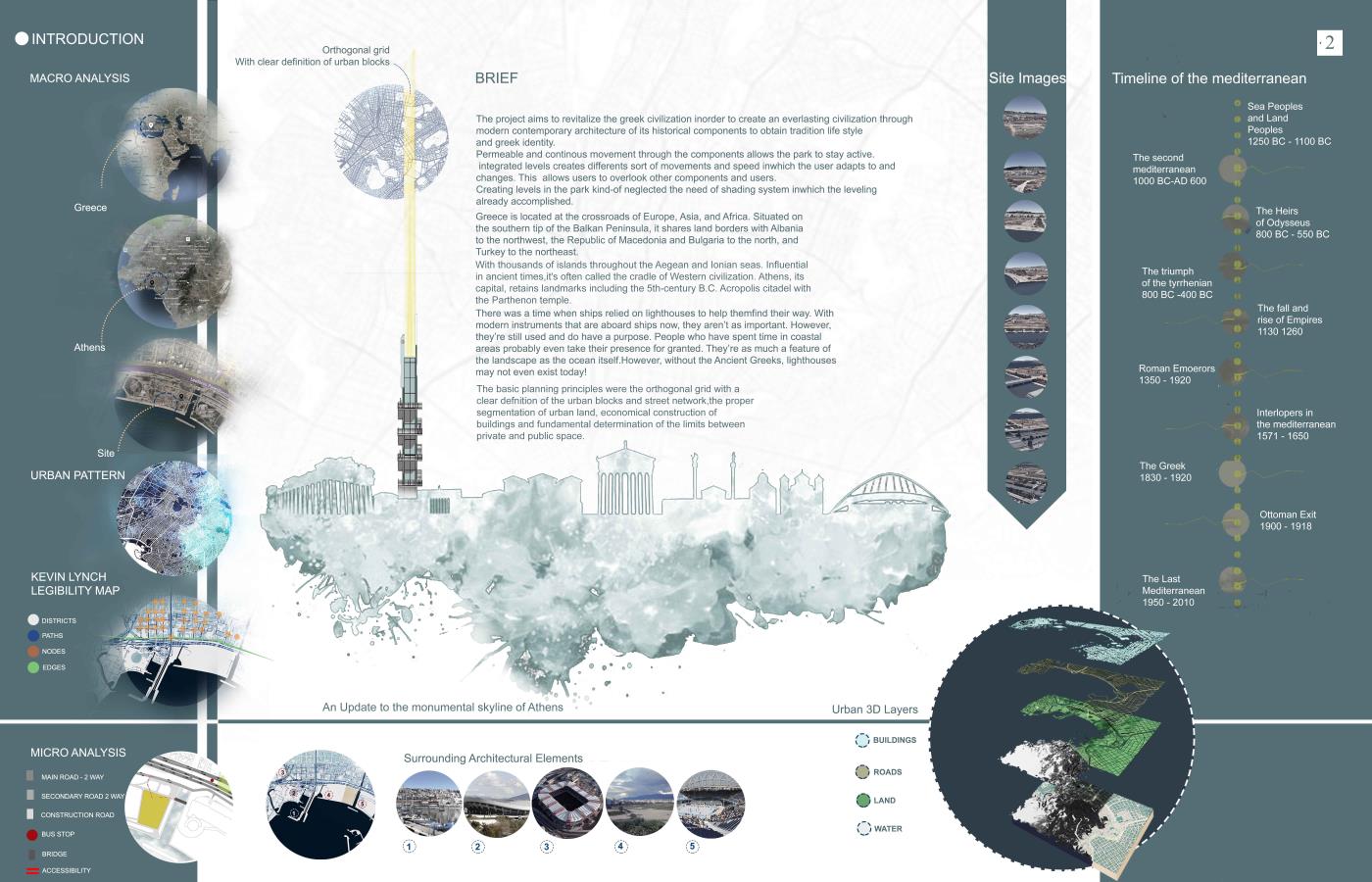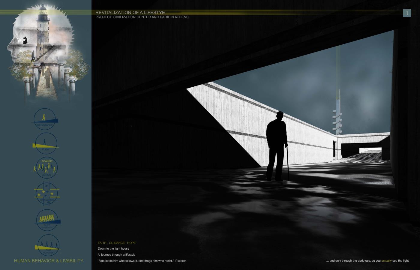 Revitalisation of a Life Style Part 1 Project 2019 Master Ali Sulayman Beirut Arab University - Debbieh campus | Lebanon Despite the fact that the land of Greece went through a lot of influential changes and diversities in history, it has maintained its identity, character and strength. The Greek civilisation is well nourished and influential, beholds the core of the greatest philosophers which has shed light upon us across the Aegean and Ionian Sea, to the world by Land and Sea.Plutarch a Greek philosopher once said “Fate leads him who follows it, and drags him who resist”. Human behaviour is well influenced by our decisions. This is respectively translated in a simple way, upward movement represents resistance due to the effort one makes and vice versa, with both ways leading to the same destination, both ways are the journey to the light house, the light house serving as the icon of hope, guidance, and faith. The journey through the lifestyle of the Greek civilisation and philosophy.Axality and proportions deeply reflect on human perception and scale of spaces, this is reflected through centralising and connecting elements and nodes with respect to the relation between vertical and horizontal proportions on a 3-Dimensional perspective.The project consists of a cultural park and a mix between research, arts and culture Center, while dealing with the project elements as one. In order to keep the project well-functioning, it is essential to keep the elements well integrated which therefore strengthen each other and reflect the complexity of its civilisation." Tutor(s) Ayman Afifi Kareem Jalal