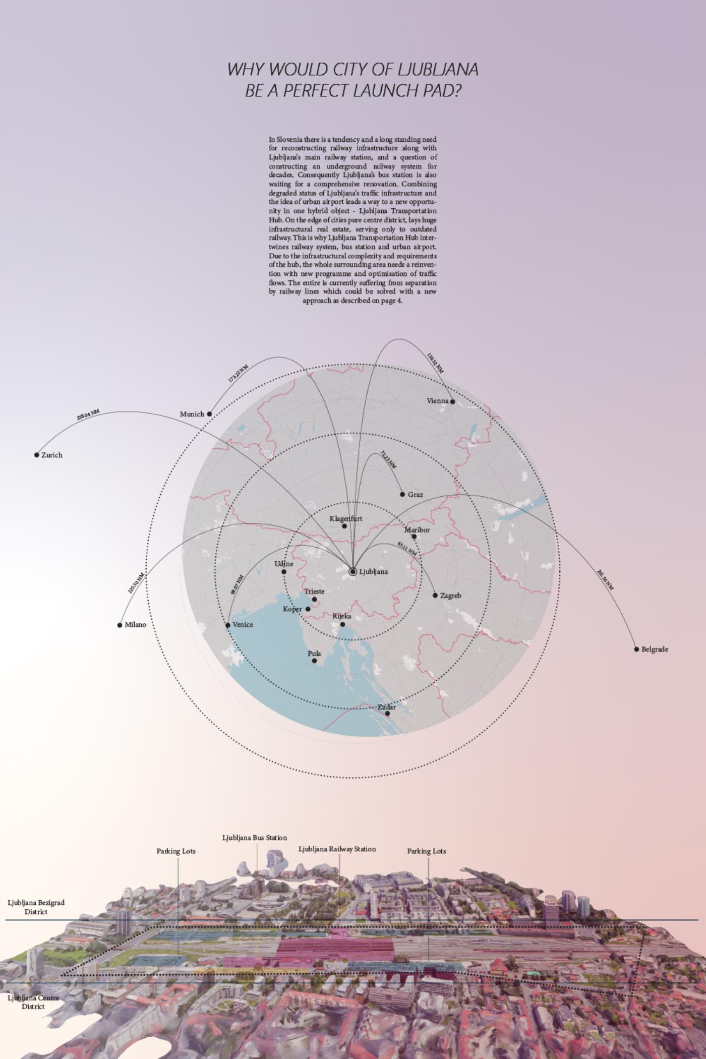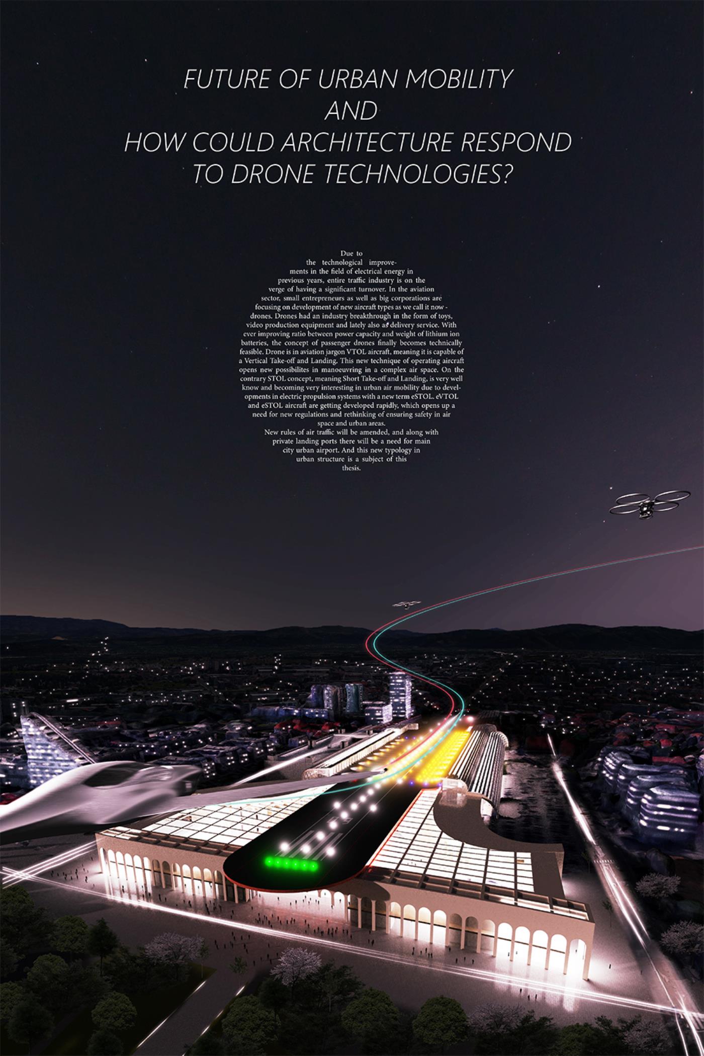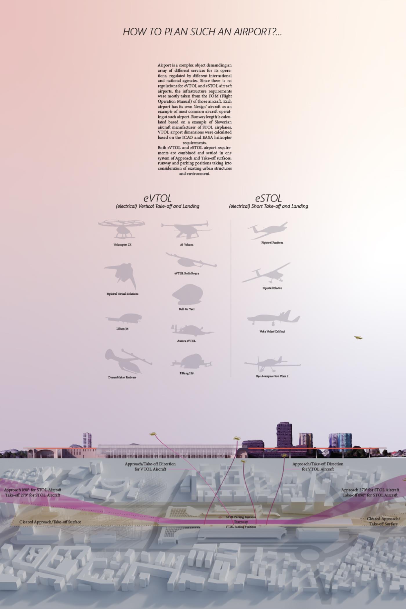 Ljubljana Transport Hub - Design of Ljubljana Transport Hub with an Airport for Light Aircraft and Drones Part 2 Project 2019 Dušan Sekulic University of Ljubljana | Slovenia Due to the technological improvements in the field of electrical energy in previous years, entire traffic industry is on the verge of having a significant turnover. In the aviation sector, small entrepreneurs as well as big corporations are focusing on development of new aircraft types as we call it now - drones. Drones had an industry breakthrough in the form of toys, video production equipment and lately also as delivery service. With ever improving ratio between power capacity and weight of lithium ion batteries, the concept of passenger drones finally becomes technically feasible.eVTOL (Vertical Take-off and Landing) and eSTOL (Short Take-Off and Landing) aircraft are getting developed rapidly, which opens up a need for new regulations and rethinking of ensuring safety in air space and urban areas.New rules of air traffic will be amended, and along with private landing ports there will be a need for main city urban airport. Along with optimising outdated traffic infrastructure in the capital of Slovenia, this new typology in urban structure is a subject of this thesis. Tutor(s) Docent Primož Jeza