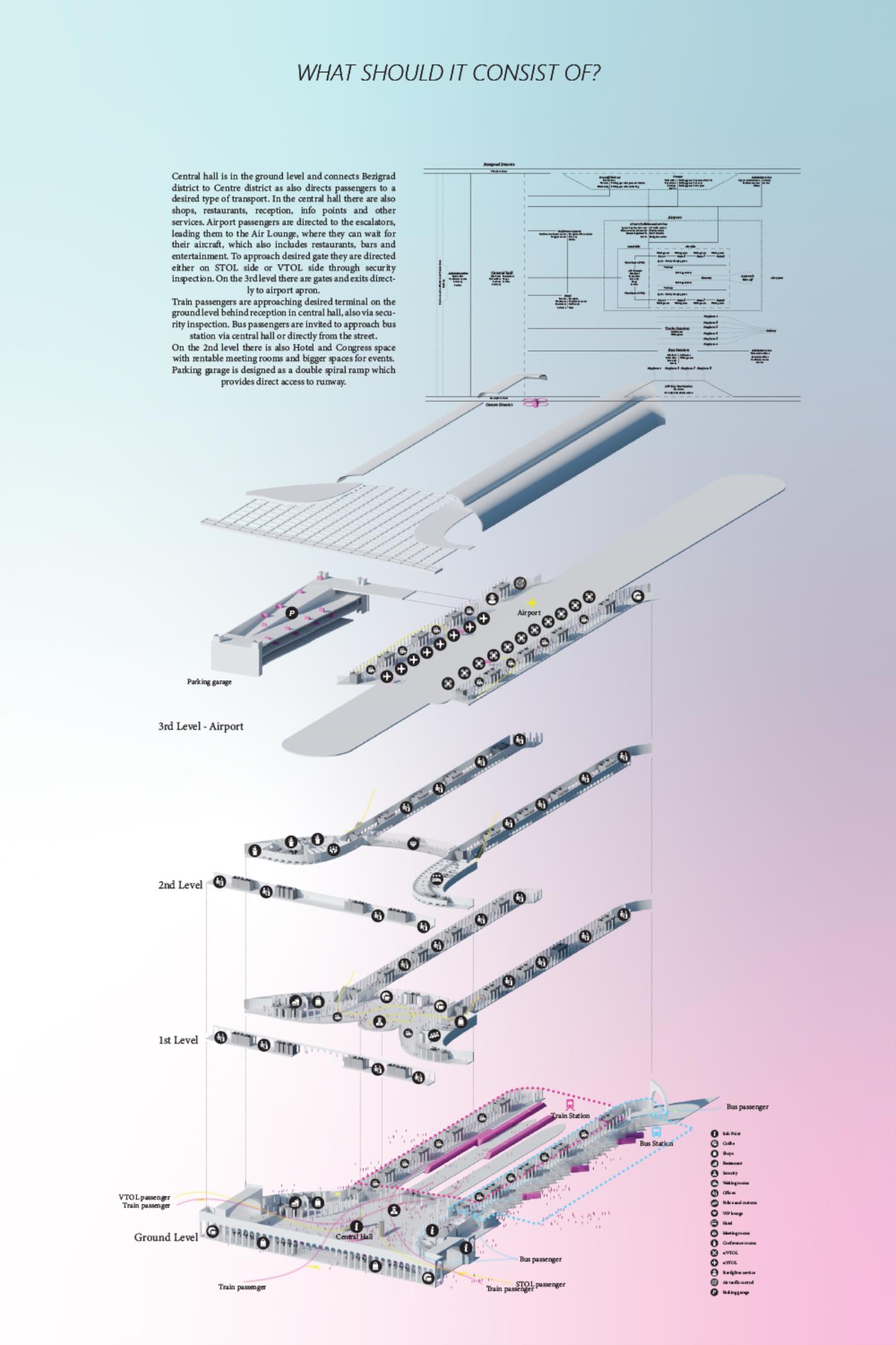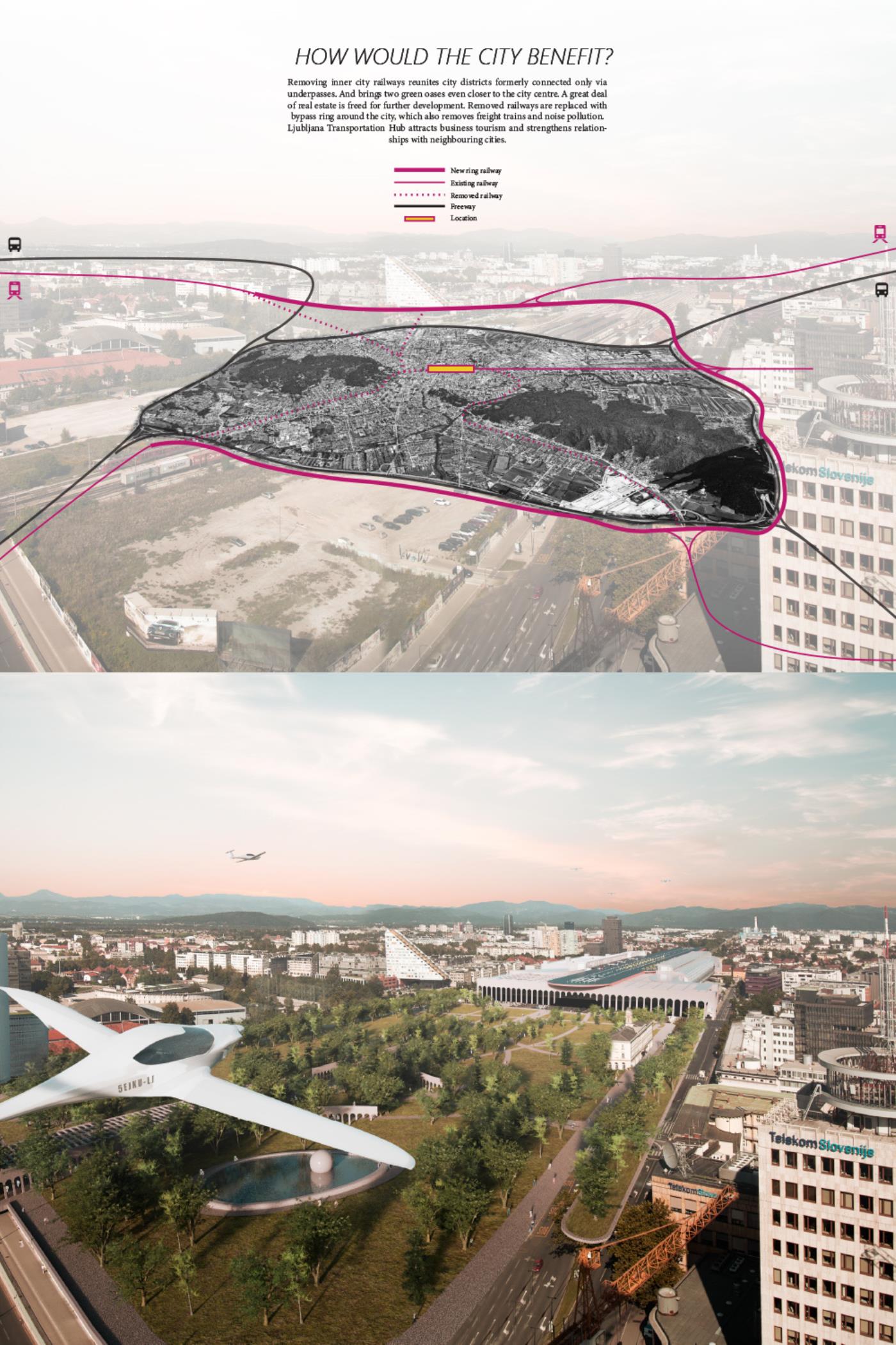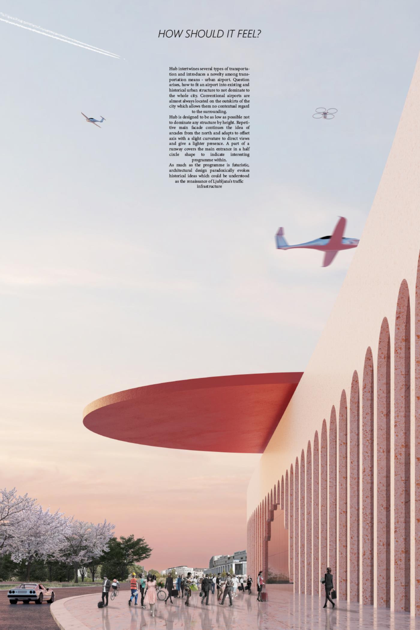 Ljubljana Transport Hub - Design of Ljubljana Transport Hub with an Airport for Light Aircraft and Drones Part 2 Project 2019 Dušan Sekulic University of Ljubljana | Slovenia Due to the technological improvements in the field of electrical energy in previous years, entire traffic industry is on the verge of having a significant turnover. In the aviation sector, small entrepreneurs as well as big corporations are focusing on development of new aircraft types as we call it now - drones. Drones had an industry breakthrough in the form of toys, video production equipment and lately also as delivery service. With ever improving ratio between power capacity and weight of lithium ion batteries, the concept of passenger drones finally becomes technically feasible.eVTOL (Vertical Take-off and Landing) and eSTOL (Short Take-Off and Landing) aircraft are getting developed rapidly, which opens up a need for new regulations and rethinking of ensuring safety in air space and urban areas.New rules of air traffic will be amended, and along with private landing ports there will be a need for main city urban airport. Along with optimising outdated traffic infrastructure in the capital of Slovenia, this new typology in urban structure is a subject of this thesis. Tutor(s) Docent Primož Jeza