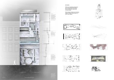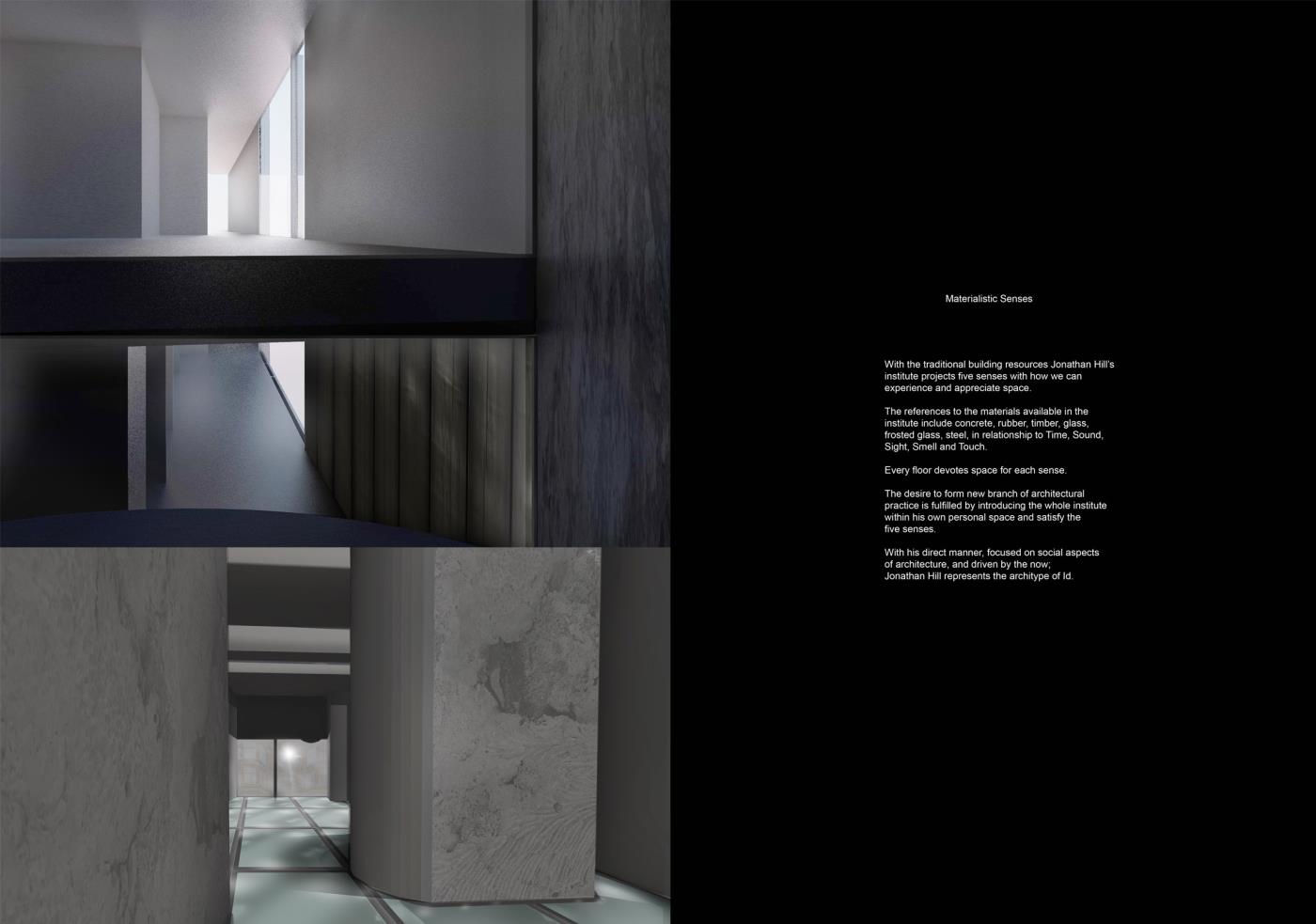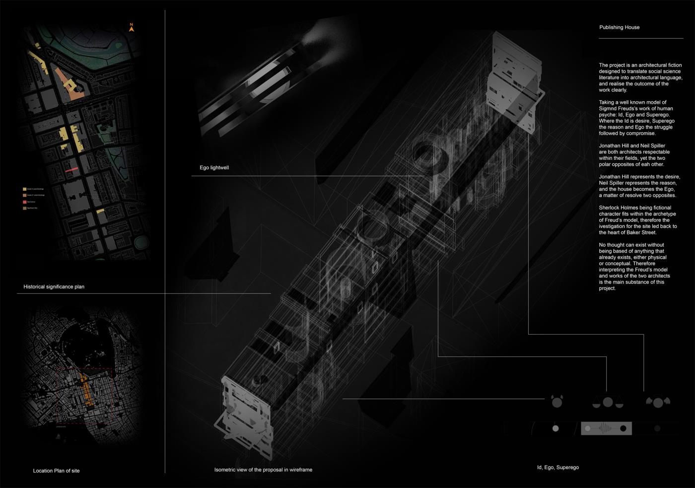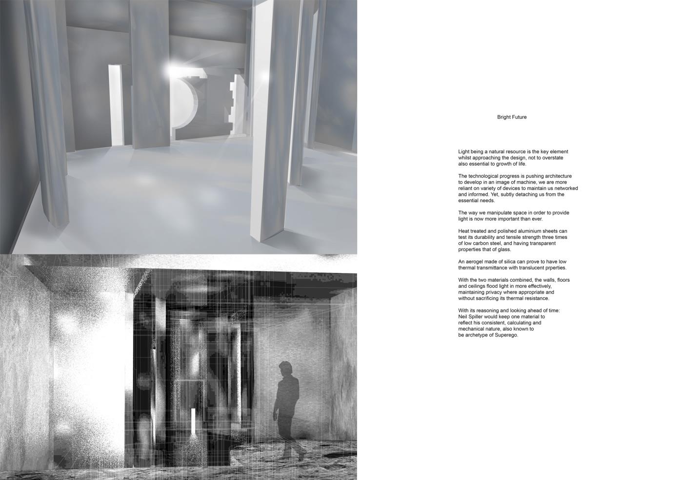 Publishing House for Jonathan Hill and Neil Spiller Part 2 Project 2019 Kornel Witkowski Hull College, | UK The project is an architectural fiction designed to interpret social science literature and archetypal stories into architectural language. The building is based off Freud’s model of Id, Ego and Superego and proposing living spaces for two architects which are the archetypes of the two opposites of the psyche, where the architecture becomes the Ego by bringing the two together under one roof.Project also focuses on exploring both residents’ life work, reflecting their passion and desire by surrounding them with it.The spaces were defined through a production of transcripts based on the architects and their work, which then were combined and produced a model that would define overall form of the architecture in its glory. Tutor(s) Richard Wright