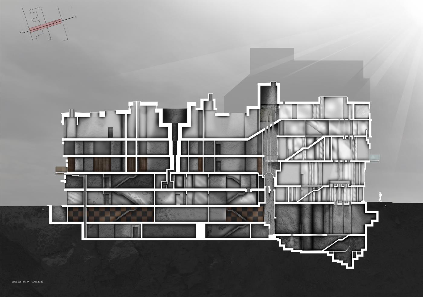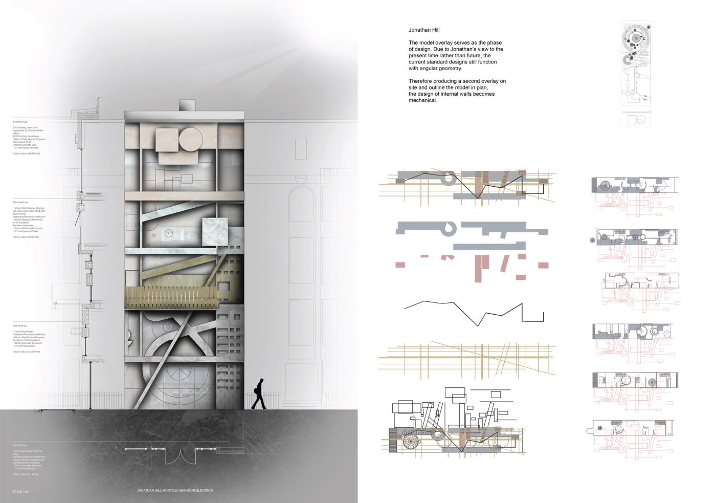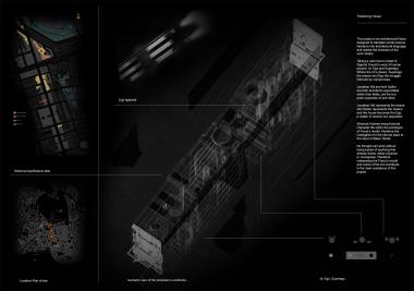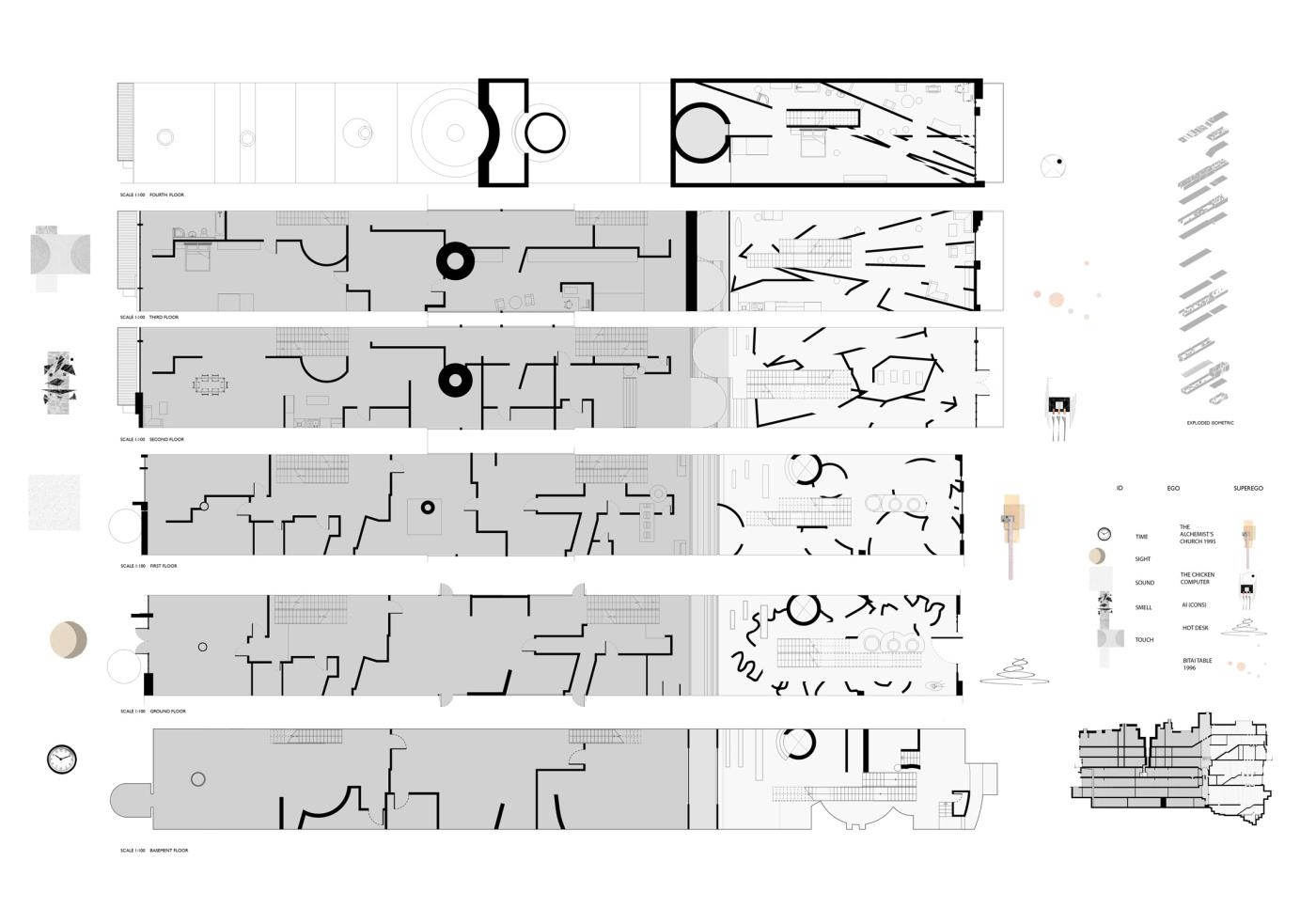 Publishing House for Jonathan Hill and Neil Spiller Part 2 Project 2019 Kornel Witkowski Hull College, | UK The project is an architectural fiction designed to interpret social science literature and archetypal stories into architectural language. The building is based off Freud’s model of Id, Ego and Superego and proposing living spaces for two architects which are the archetypes of the two opposites of the psyche, where the architecture becomes the Ego by bringing the two together under one roof.Project also focuses on exploring both residents’ life work, reflecting their passion and desire by surrounding them with it.The spaces were defined through a production of transcripts based on the architects and their work, which then were combined and produced a model that would define overall form of the architecture in its glory. Tutor(s) Richard Wright