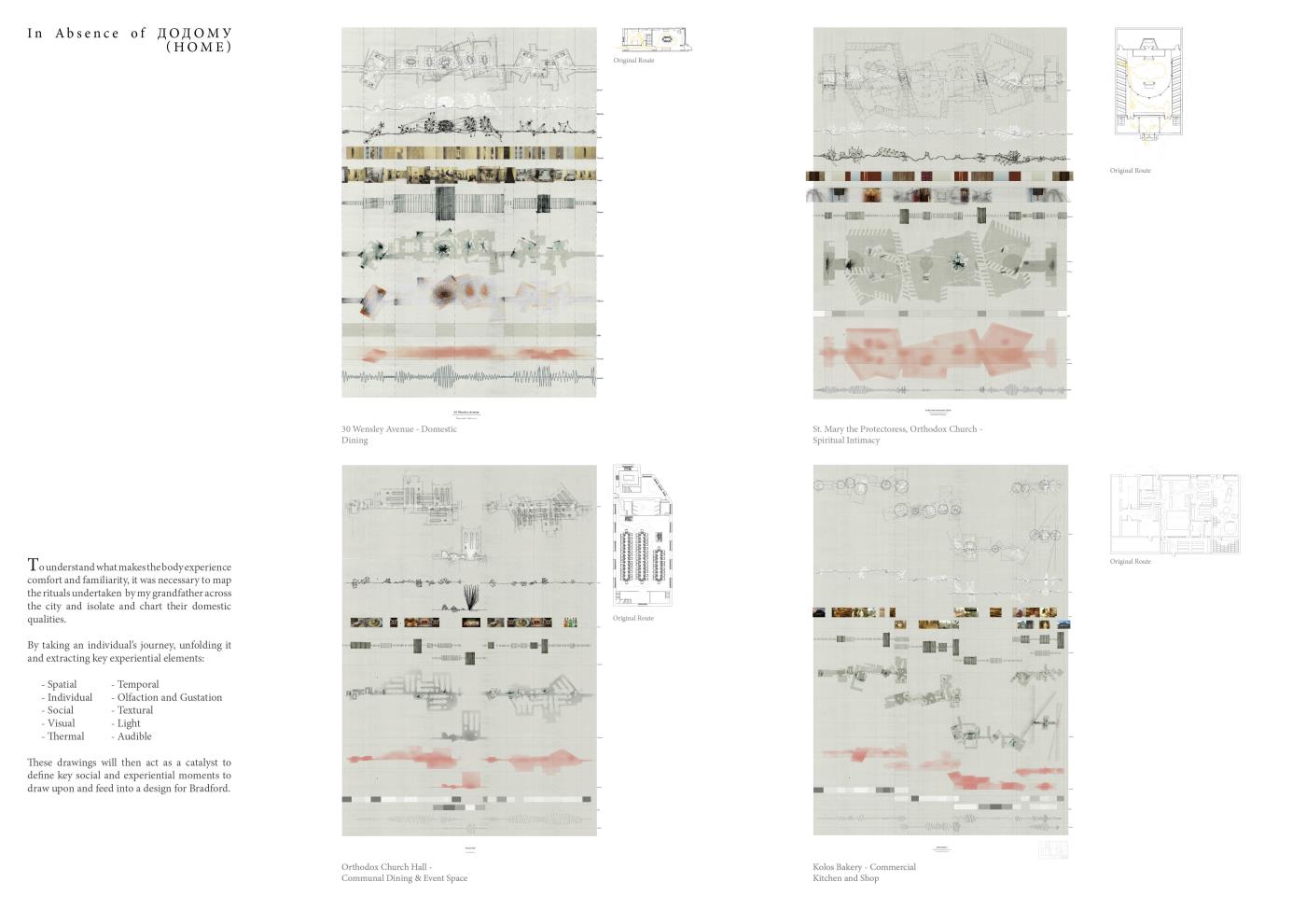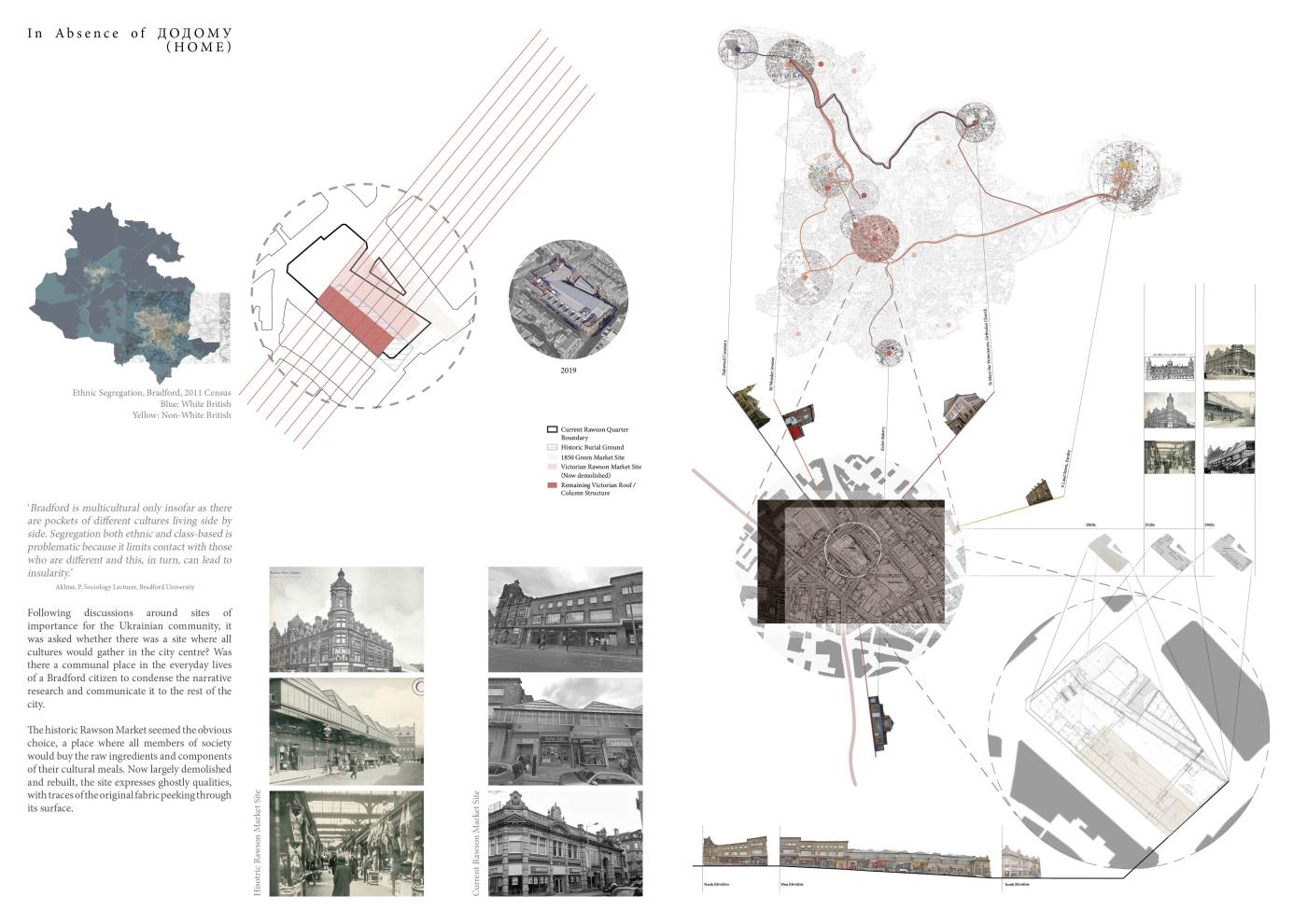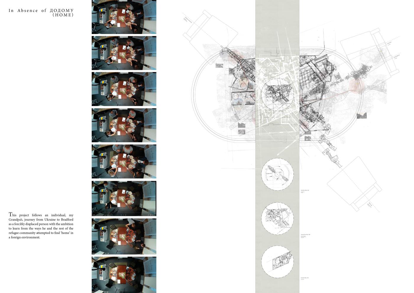 In Absence of [Home] Part 2 Project 2019 Eleanor Gair Newcastle University | UK This project follows an individual, my Grandpa’s, journey from Ukraine to Bradford as a forcibly displaced person with the ambition to learn from the ways he found ‘home’ in a foreign environment. He was born in Paulograd, 1927, and fled during the Soviet ‘Great Purge’ to England, under a false Polish identity. There, he settled in Bradford, alongside a Ukrainian community which has now all but dissolved. Bradford became ‘home’, a place of comfort through social relations to place and people.Currently, the number of displaced persons is growing exponentially. These people are thrown into unfamiliar social structures, under pressure to integrate with their new ‘home’, causing groups to bond together more tightly.Bradford is a city of immense diversity. However, these communities have been described as living in ‘parallel’ with little communication between cultural groups. This proposal aims to begin the conversation. Through the act of telling the Ukrainian story, allowing insight into a deeply personal subject, I hope to begin the narrative exchange. The proposal is sited on a place of memory, Rawson Market, at the centre of Bradford and the centre of the table, condensing all the extracted narratives of Ukrainian life into an experiential manifestation. Tutor(s) James Craig Matt Ozga-Lawn