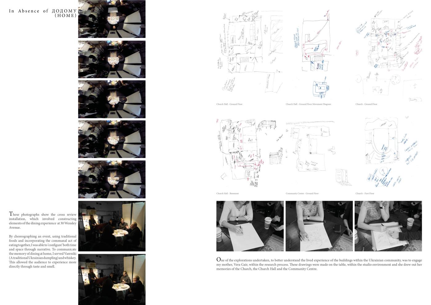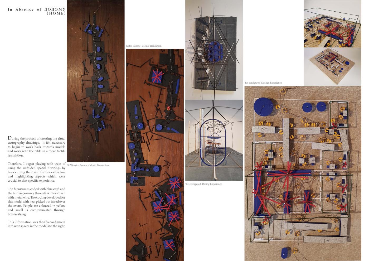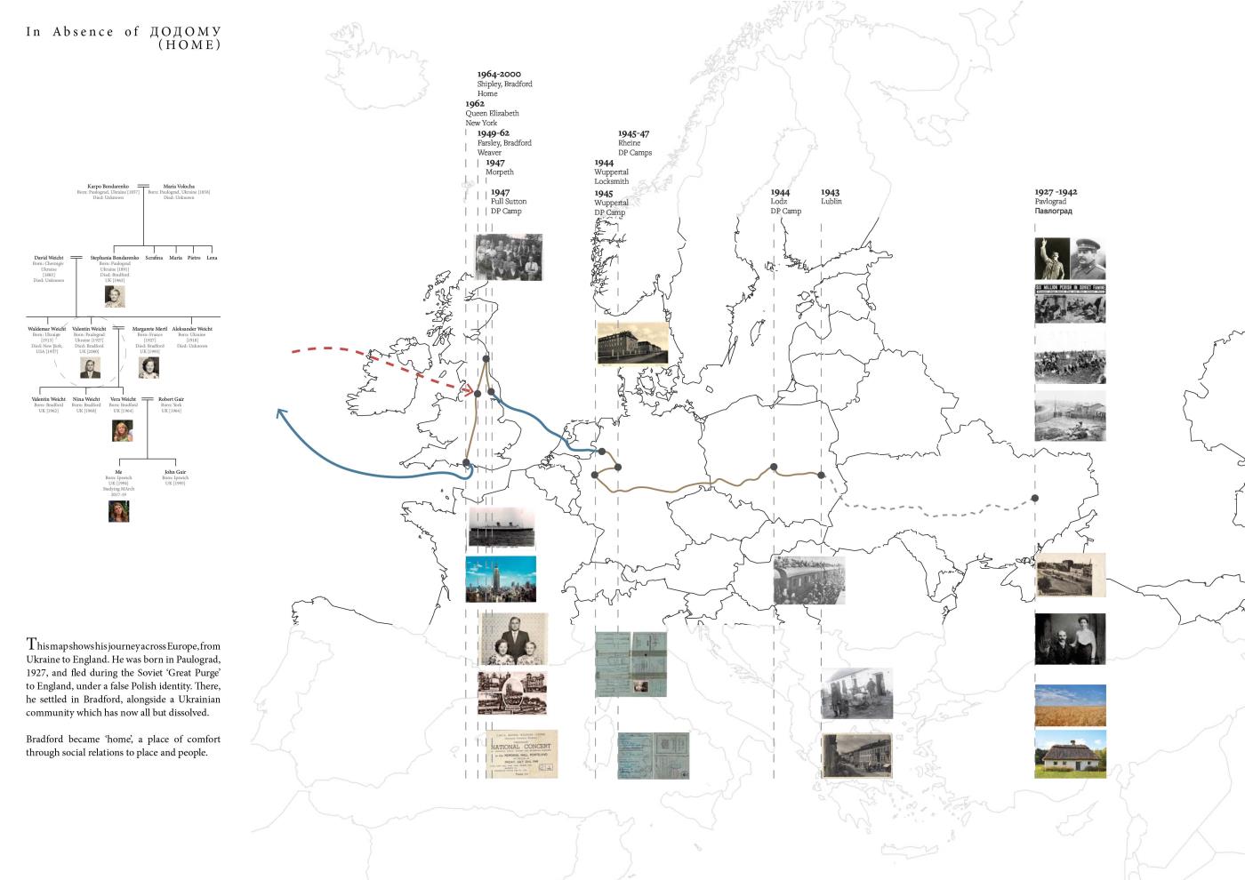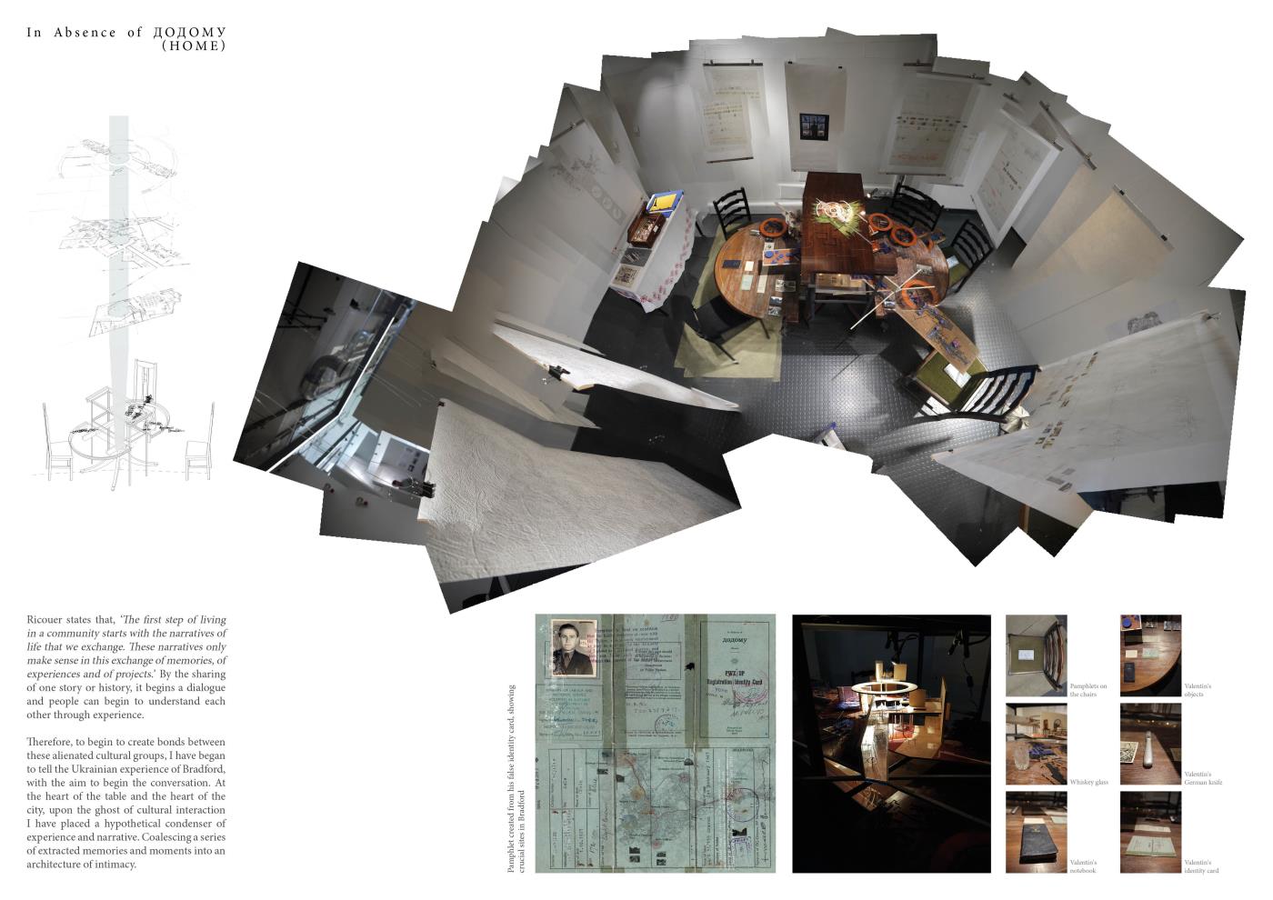 In Absence of [Home] Part 2 Project 2019 Eleanor Gair Newcastle University | UK This project follows an individual, my Grandpa’s, journey from Ukraine to Bradford as a forcibly displaced person with the ambition to learn from the ways he found ‘home’ in a foreign environment. He was born in Paulograd, 1927, and fled during the Soviet ‘Great Purge’ to England, under a false Polish identity. There, he settled in Bradford, alongside a Ukrainian community which has now all but dissolved. Bradford became ‘home’, a place of comfort through social relations to place and people.Currently, the number of displaced persons is growing exponentially. These people are thrown into unfamiliar social structures, under pressure to integrate with their new ‘home’, causing groups to bond together more tightly.Bradford is a city of immense diversity. However, these communities have been described as living in ‘parallel’ with little communication between cultural groups. This proposal aims to begin the conversation. Through the act of telling the Ukrainian story, allowing insight into a deeply personal subject, I hope to begin the narrative exchange. The proposal is sited on a place of memory, Rawson Market, at the centre of Bradford and the centre of the table, condensing all the extracted narratives of Ukrainian life into an experiential manifestation. Tutor(s) James Craig Matt Ozga-Lawn