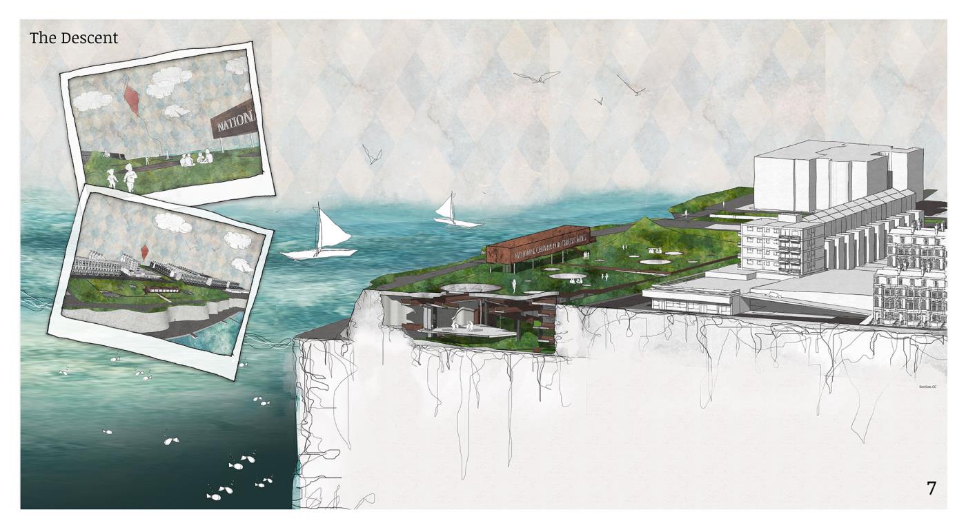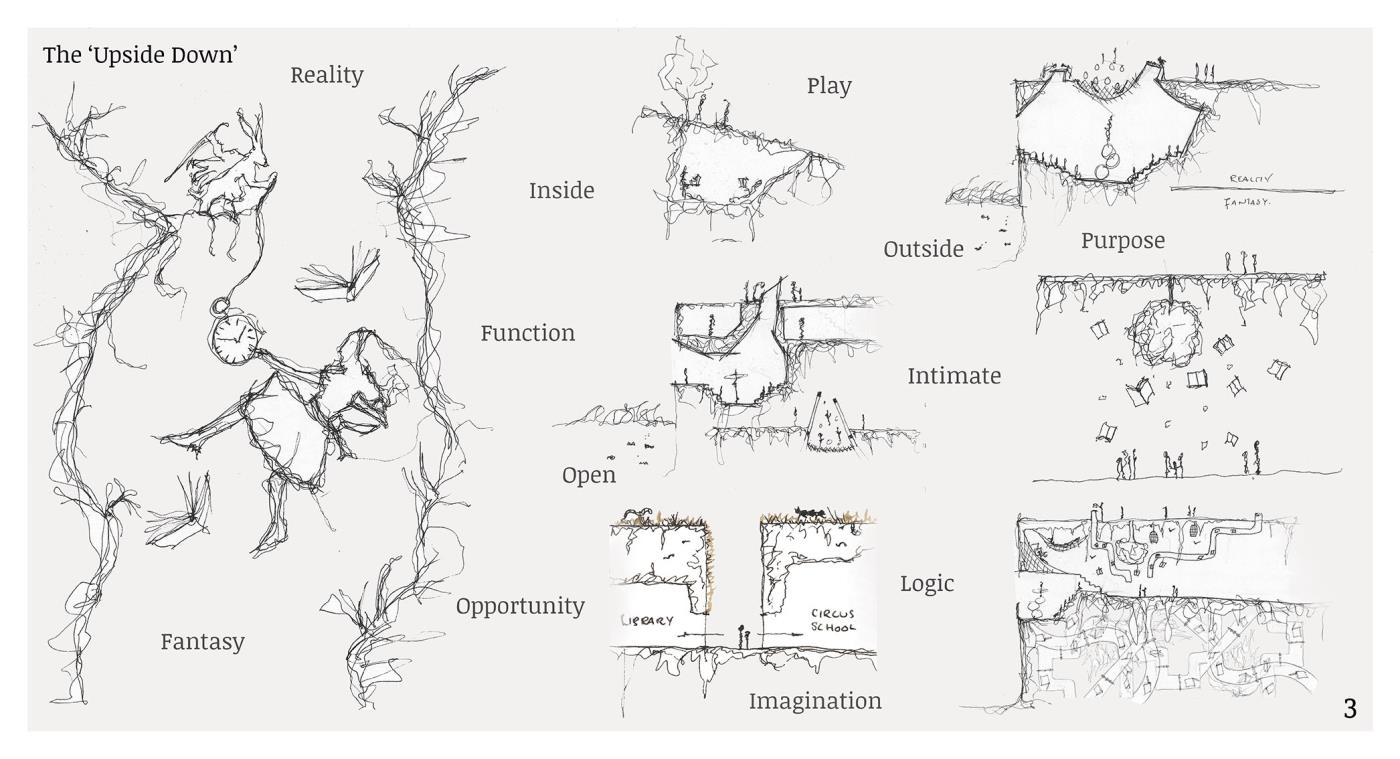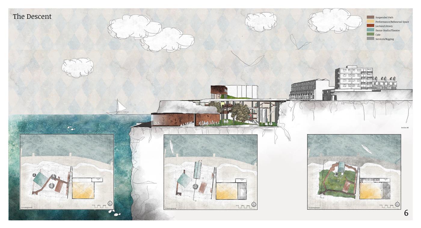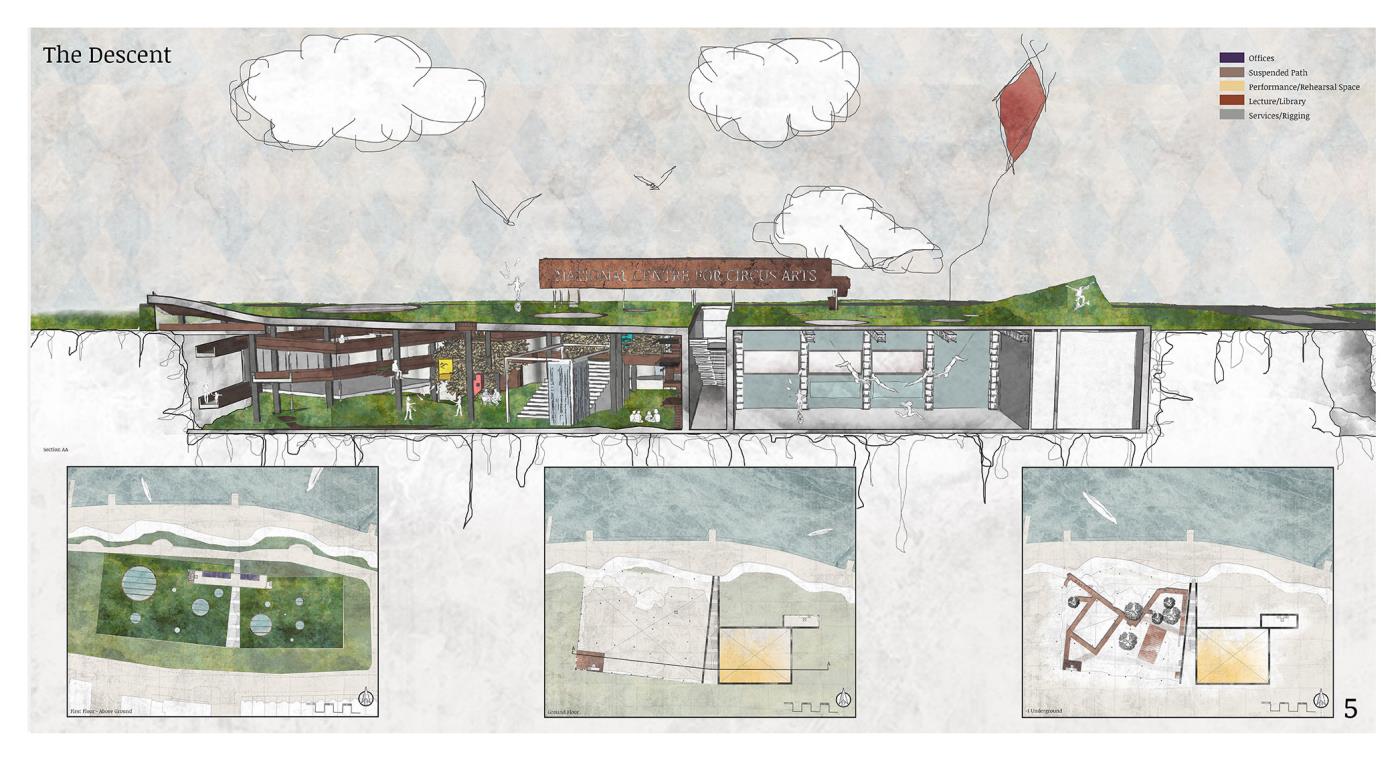The Circus of the Between – A Circus School for the National Centre for Circus Arts Part 1 Project 2019 Megan Griffiths University of Kent | UK ‘I wonder if I shall fall right through the earth! How funny it’ll seem to come out among the people that walk with their heads downwards!’ Lewis Carrol, Alice in WonderlandConceived as a space between reality and fantasy, this project explores multiple thematic narratives of duality and synthesis in a place for the practice and performance of circus arts, resonant within the historical and contemporary urban conditions of Margate itself. Mostly burrowed into the shoreline chalk cliff-face, the majority of formal teaching and performance spaces are hidden underground, suspended within charged voids of unprogrammed possibility, inviting enchanted inhabitation….Through this physical and representational interplay of oppositions a poetically pragmatic architecture emerges, creating a venue of immersive experience that becomes a place of multiple social engagement and resource, engendering a diverse community of performers and teachers, Margate residents and day-trippers. Tutor(s) Jef Smith