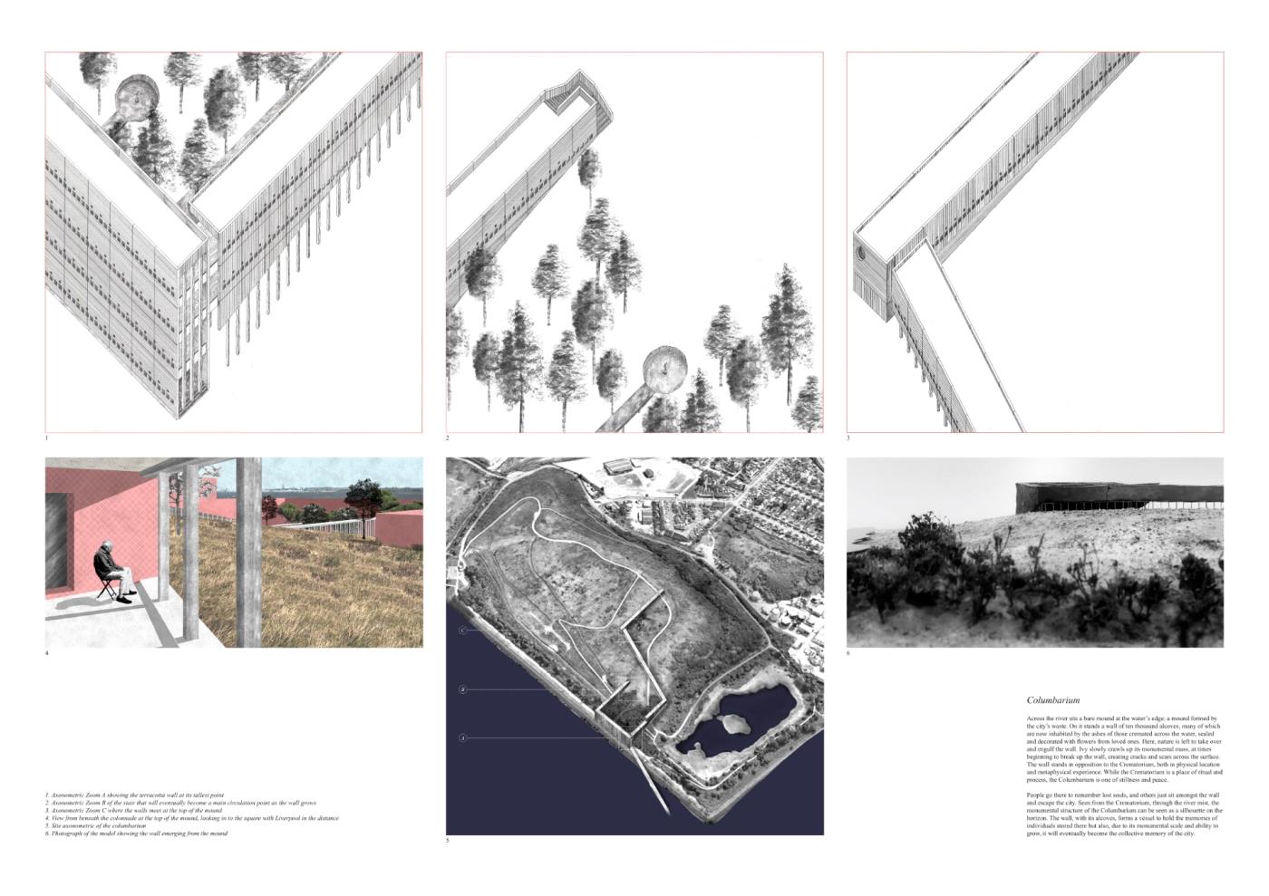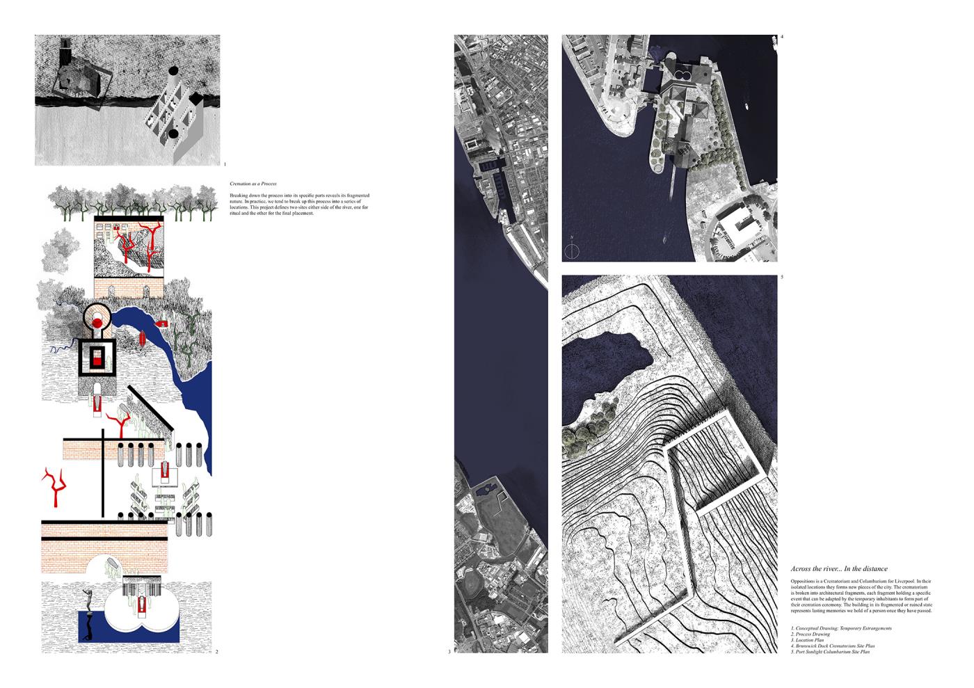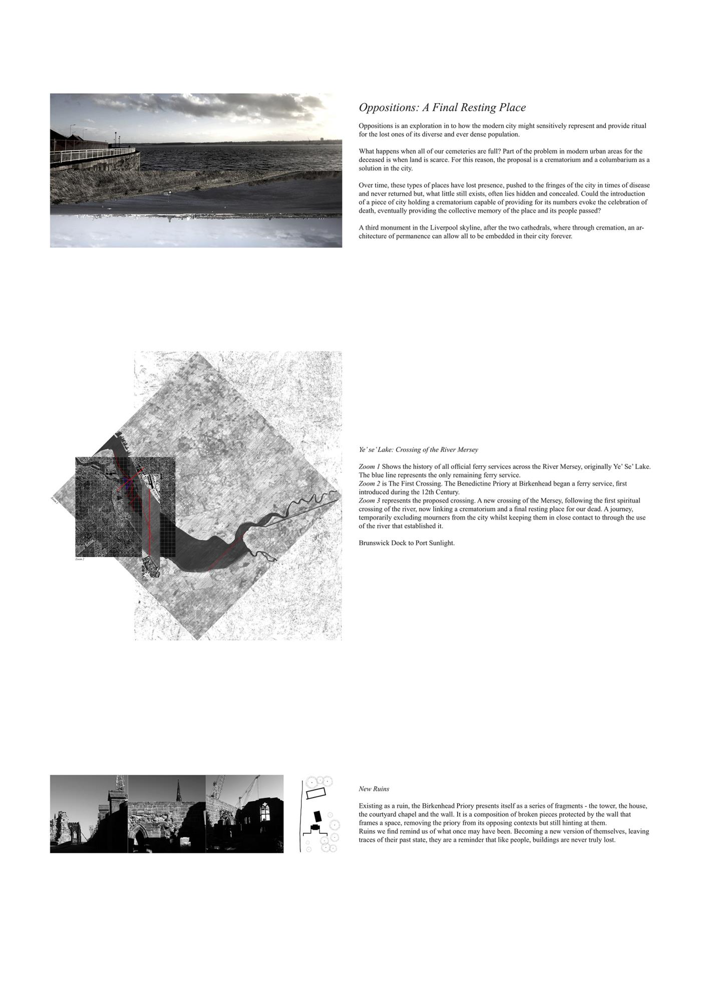Oppositions: A Final Resting Place Part 1 Project 2019 Edward Turner University of Liverpool | UK Oppositions is an exploration in to how the modern city might sensitively represent and provide ritual for the lost ones of its diverse and ever dense population. Over time, these types of places have lost presence, pushed to the fringes of the city but what little still exist often lies hidden and concealed. Could the introduction of a crematorium sensitive and emotive yet capable of providing for its numbers evoke the celebration of death, eventually providing the collective memory of the place and its people passed? Oppositions is a Crematorium and a Columbarium for Liverpool. In its isolated location the building forms new pieces of the city. The crematorium appears as a new ruin of architectural fragments, each fragment holding a specific event that can be adapted by the temporary inhabitants to form part of their cremation ceremony. The building in its fragmented or ruined state represents lasting memories we hold of a person once they have passed. A third monument in the Liverpool skyline, after the two cathedrals, where through cremation, an architecture of permanence can allow all to be embedded in their city forever. Tutor(s) Sandy Britton