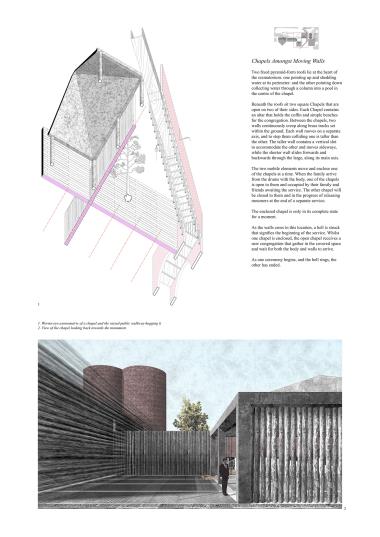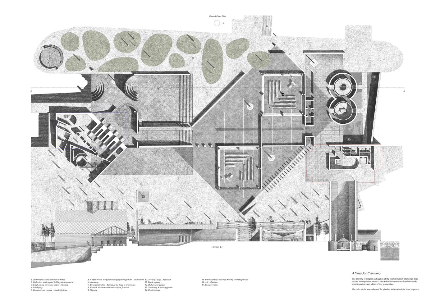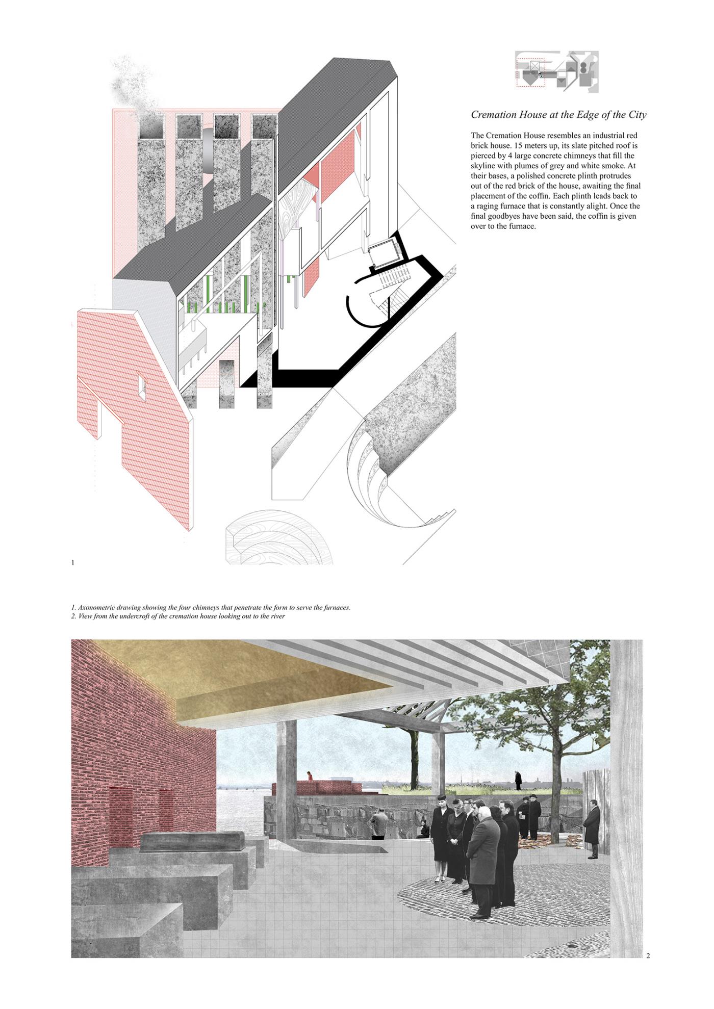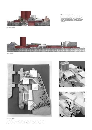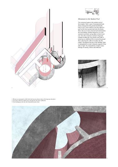 Oppositions: A Final Resting Place Part 1 Project 2019 Edward Turner University of Liverpool | UK Oppositions is an exploration in to how the modern city might sensitively represent and provide ritual for the lost ones of its diverse and ever dense population. Over time, these types of places have lost presence, pushed to the fringes of the city but what little still exist often lies hidden and concealed. Could the introduction of a crematorium sensitive and emotive yet capable of providing for its numbers evoke the celebration of death, eventually providing the collective memory of the place and its people passed? Oppositions is a Crematorium and a Columbarium for Liverpool. In its isolated location the building forms new pieces of the city. The crematorium appears as a new ruin of architectural fragments, each fragment holding a specific event that can be adapted by the temporary inhabitants to form part of their cremation ceremony. The building in its fragmented or ruined state represents lasting memories we hold of a person once they have passed. A third monument in the Liverpool skyline, after the two cathedrals, where through cremation, an architecture of permanence can allow all to be embedded in their city forever. Tutor(s) Sandy Britton
