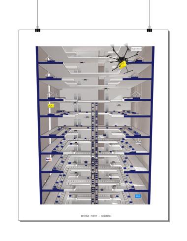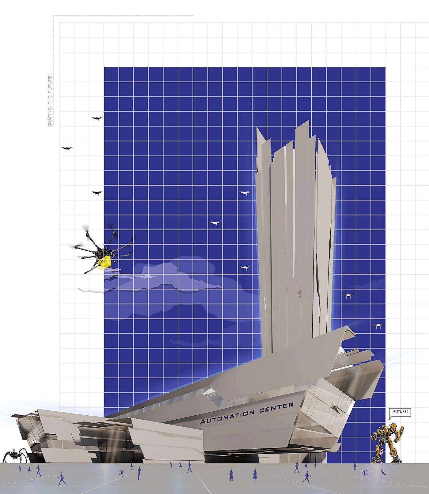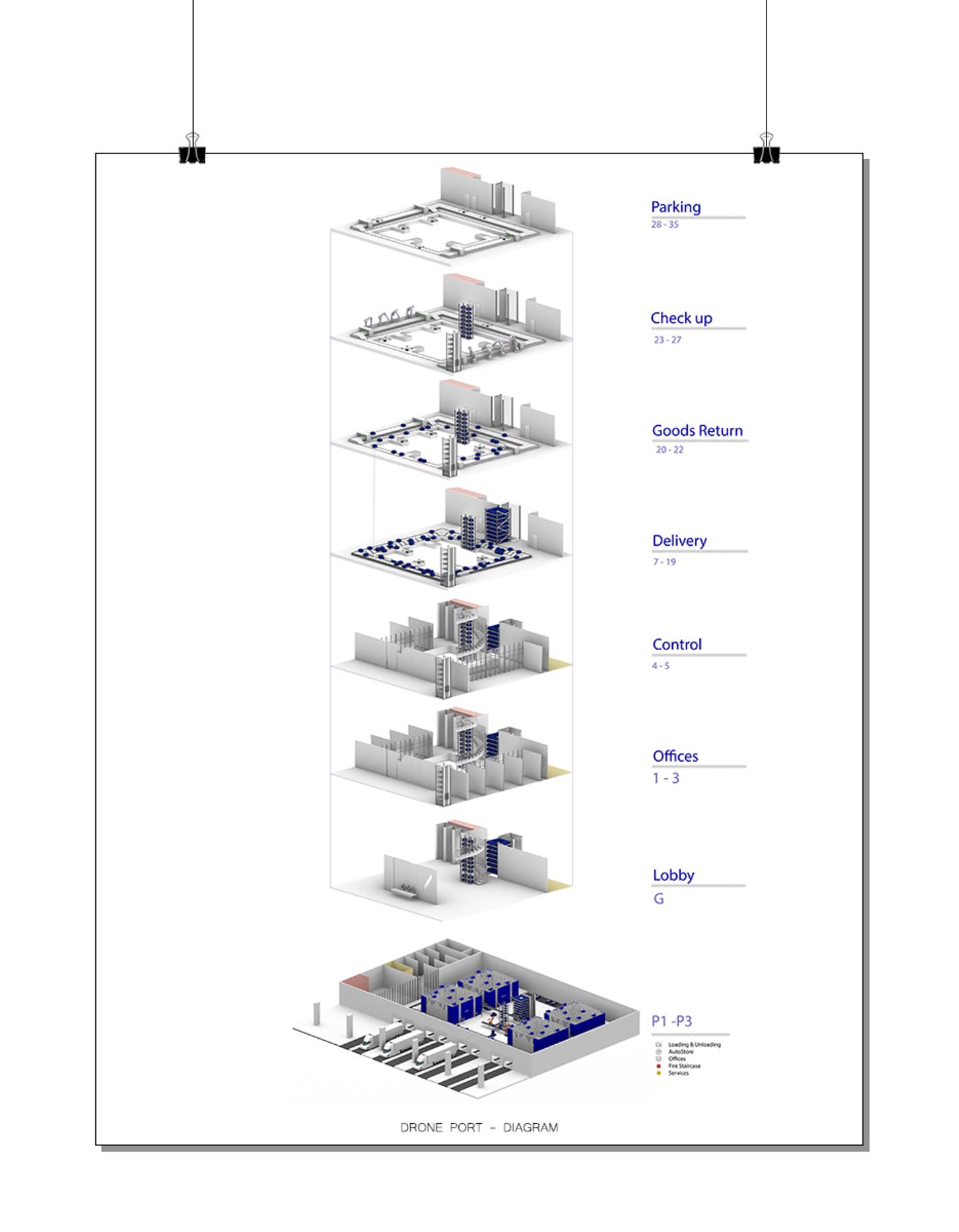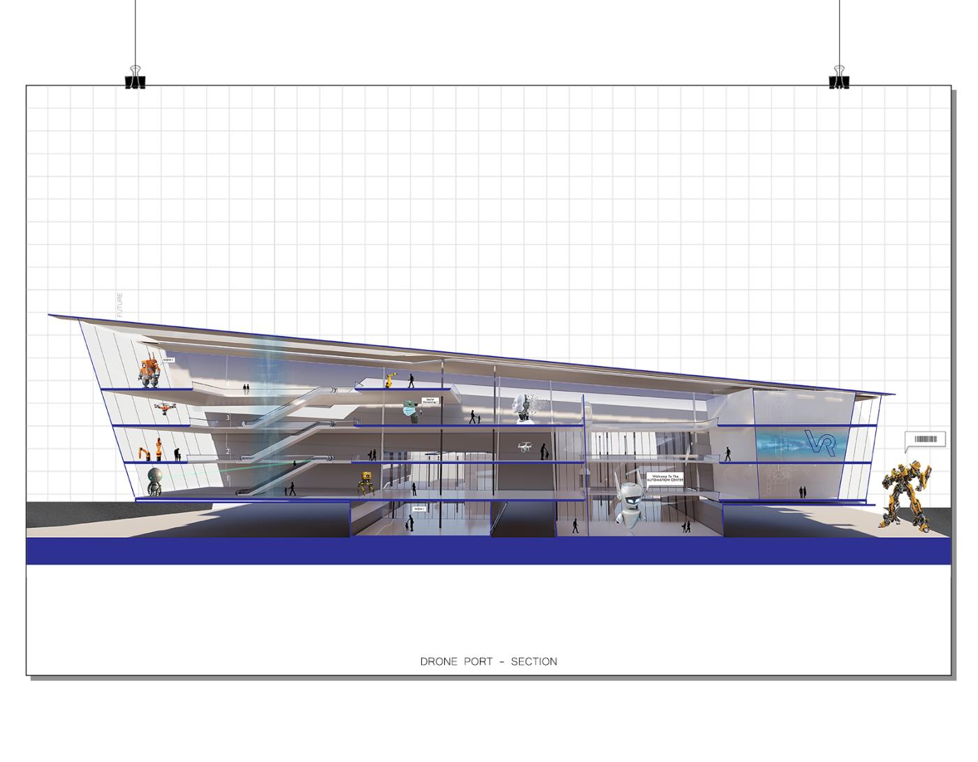 The project aims to introduce a new infrastructure in the city through the ‘Drone’ technology. The Drone port will explore the impact of the drones in the near future and its third dimension consequential transformation of the urban space. Today, Drones are fast developing technology in both Commercial and non-commercial sectors, in verity of uses. Therefore, introducing the Automation center is a much-needed step for a better future. The Center is a tool to get prepared for a future of artificial intelligence, nanotechnology, solutions to global problems, and target sustainability through technology to create a less carbon emission future.