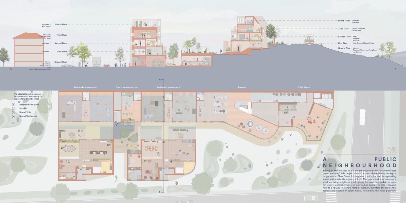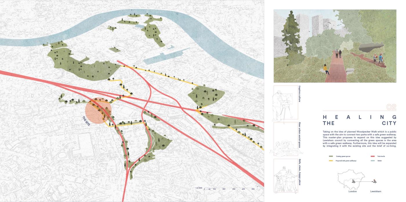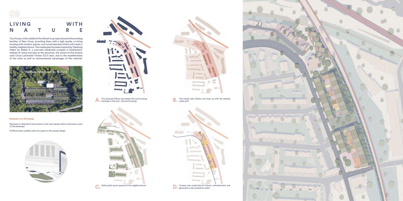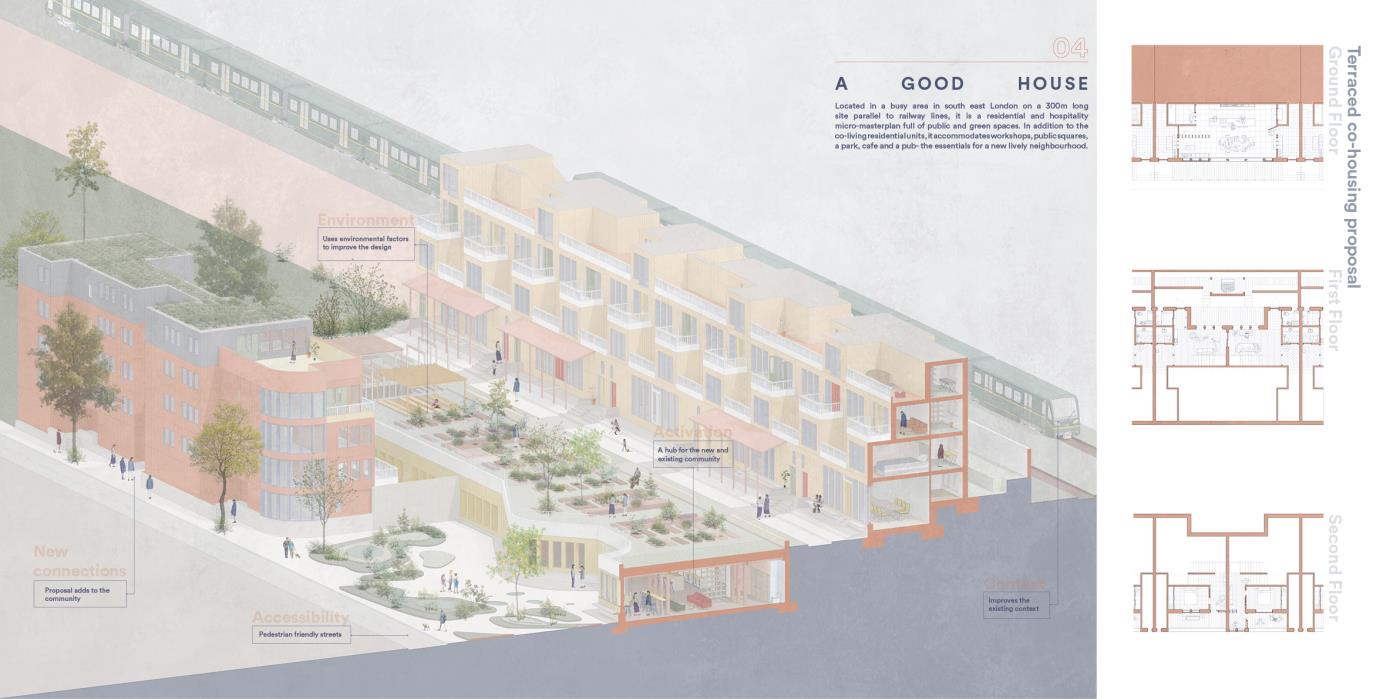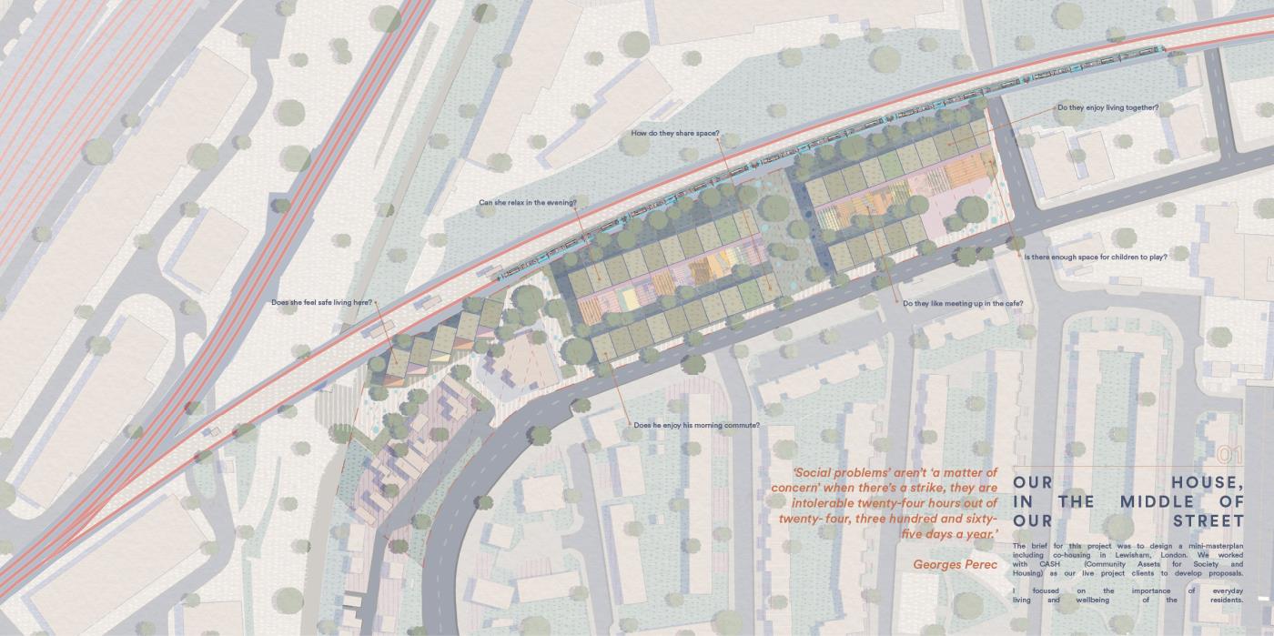 Our House, In the Middle of Our Street Part 1 Project 2020 Alicja Jaromirska Oxford Brookes University Oxford | UK On average we spend two-thirds of out lives at homes- that is why the design of the places we live in is important. ‘Our House, in the middle of Our Street’ is a micro-masterplan for Newcross, London which is an oasis for safe, sustainable and sociable co-living for working families.Located in a busy area in south east London on a 300m long site parallel to railway lines, it is a residential and hospitality micro-masterplan full of public and green spaces. In addition to the co-living residential units, it accommodates workshops, public squares, a park, cafe and a pub- the essentials for a new lively neighbourhood. Tutor(s) Margit Kraft