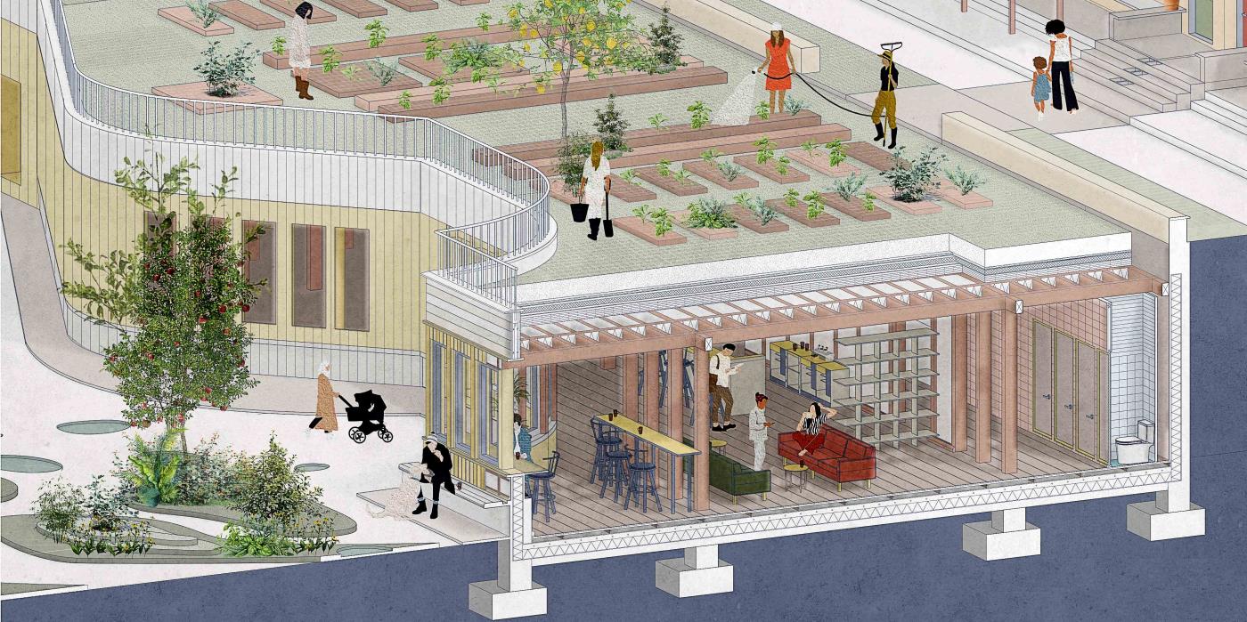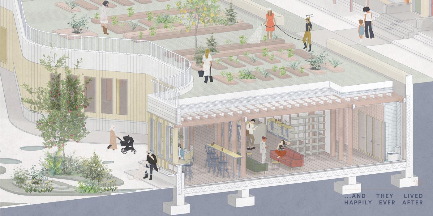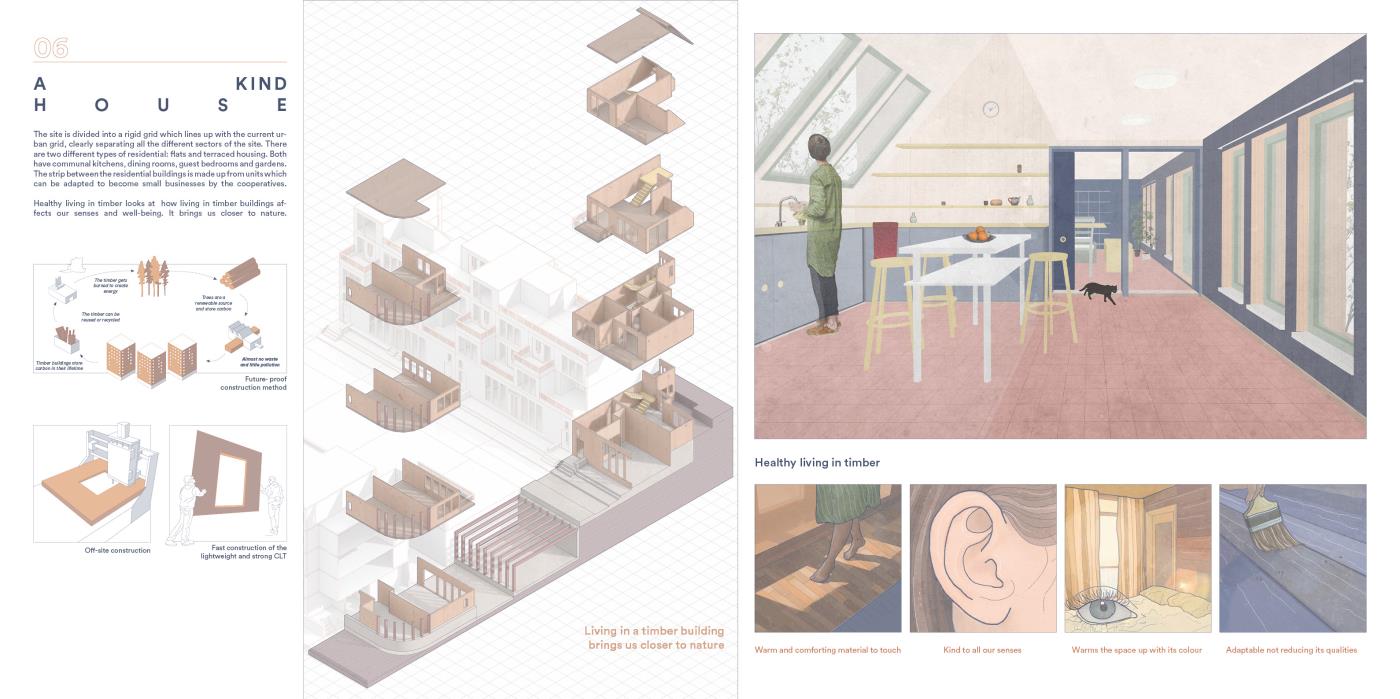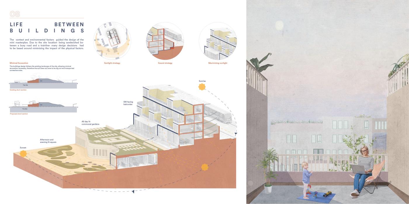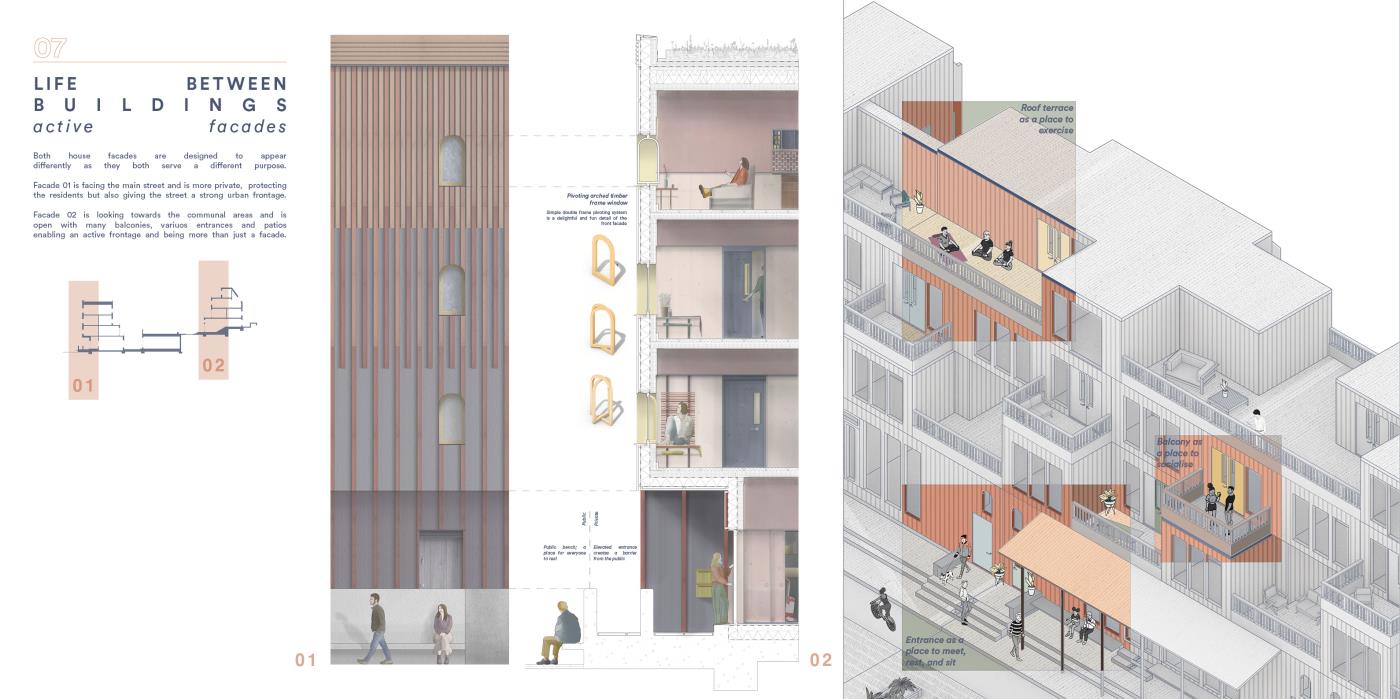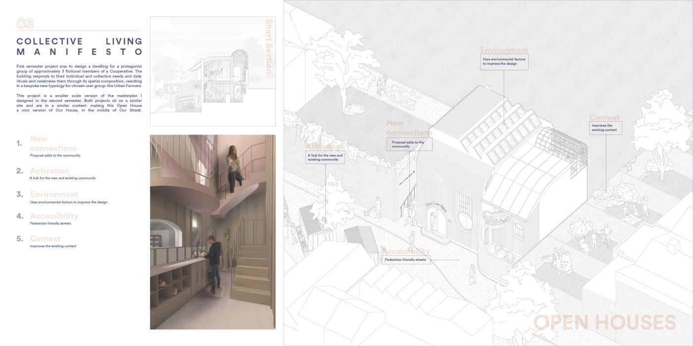 Our House, In the Middle of Our Street Part 1 Project 2020 Alicja Jaromirska Oxford Brookes University Oxford | UK On average we spend two-thirds of out lives at homes- that is why the design of the places we live in is important. ‘Our House, in the middle of Our Street’ is a micro-masterplan for Newcross, London which is an oasis for safe, sustainable and sociable co-living for working families.Located in a busy area in south east London on a 300m long site parallel to railway lines, it is a residential and hospitality micro-masterplan full of public and green spaces. In addition to the co-living residential units, it accommodates workshops, public squares, a park, cafe and a pub- the essentials for a new lively neighbourhood. Tutor(s) Margit Kraft