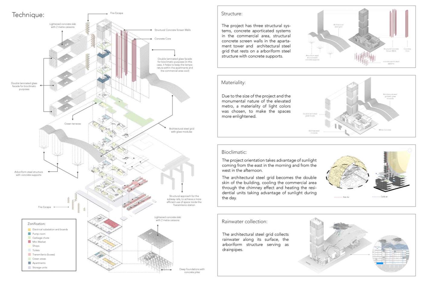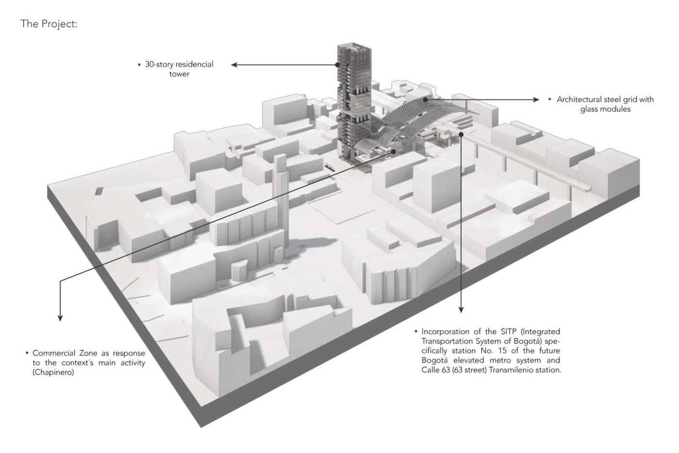 The integration of the elevated metro station with the project (commercial and housing) results in a mixed-use development consisting of a 30-story tower and a commercial use platform that is integrated with the Transmilenio Bus Station and the elevated metro that communicates this area with Bogota’s