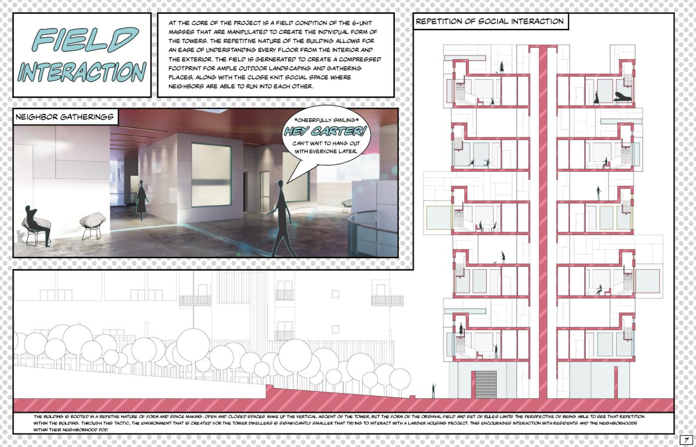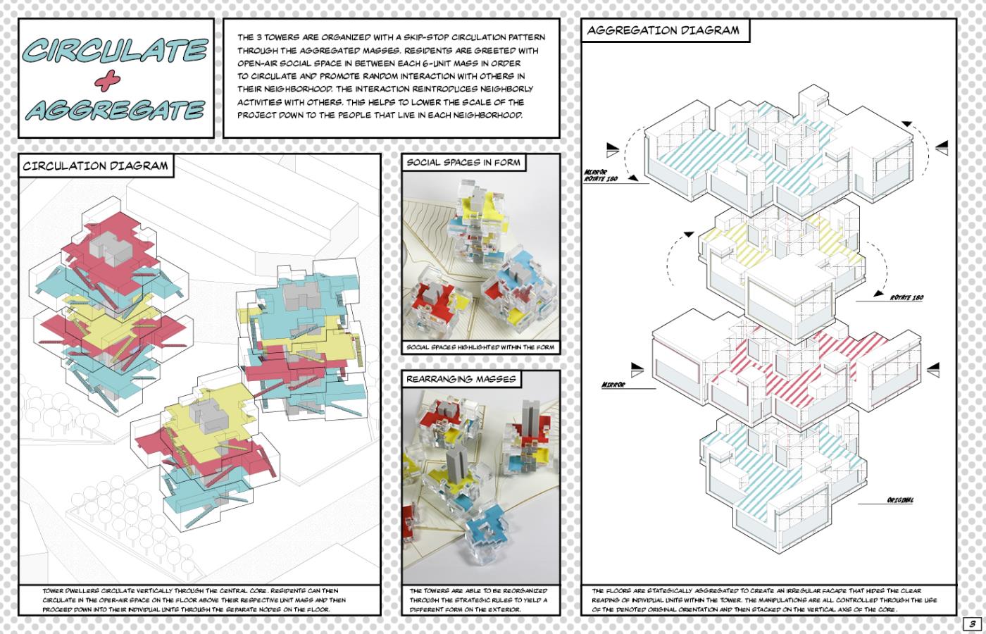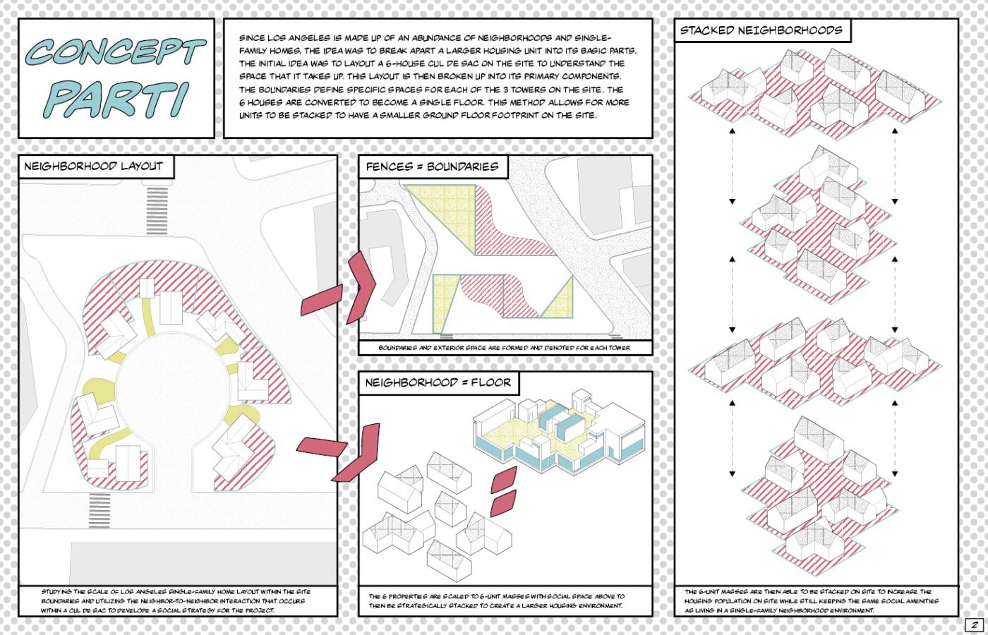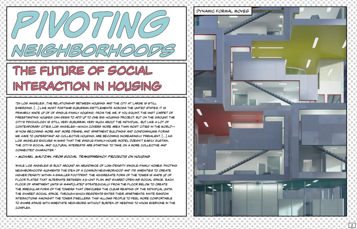Pivoting Neighborhoods: The Future of Social Interactions in Housing Part 1 Project 2020 Matthew Wilson University of Arkansas | USA While Los Angeles is built around an abundance of low-density single-family homes. Pivoting Neighborhoods augments the idea of a common neighborhood and its amenities to create higher density within a smaller footprint. The aggregate form of the tower is made up of floor plates that alternate between a 6-unit plan and a shared open-air social space. Each floor of apartment units is manipulated strategically from the floor below to create the irregular form of the towers that obscures the clear reading of the individual units. The shared social space, through which residents enter their apartments, invite random interactions amongst the tower dwellers. This allows people to feel more comfortable sharing space with immediate neighbors, without the burden of needing to know everyone in the complex. Tutor(s) Charles Sharpless