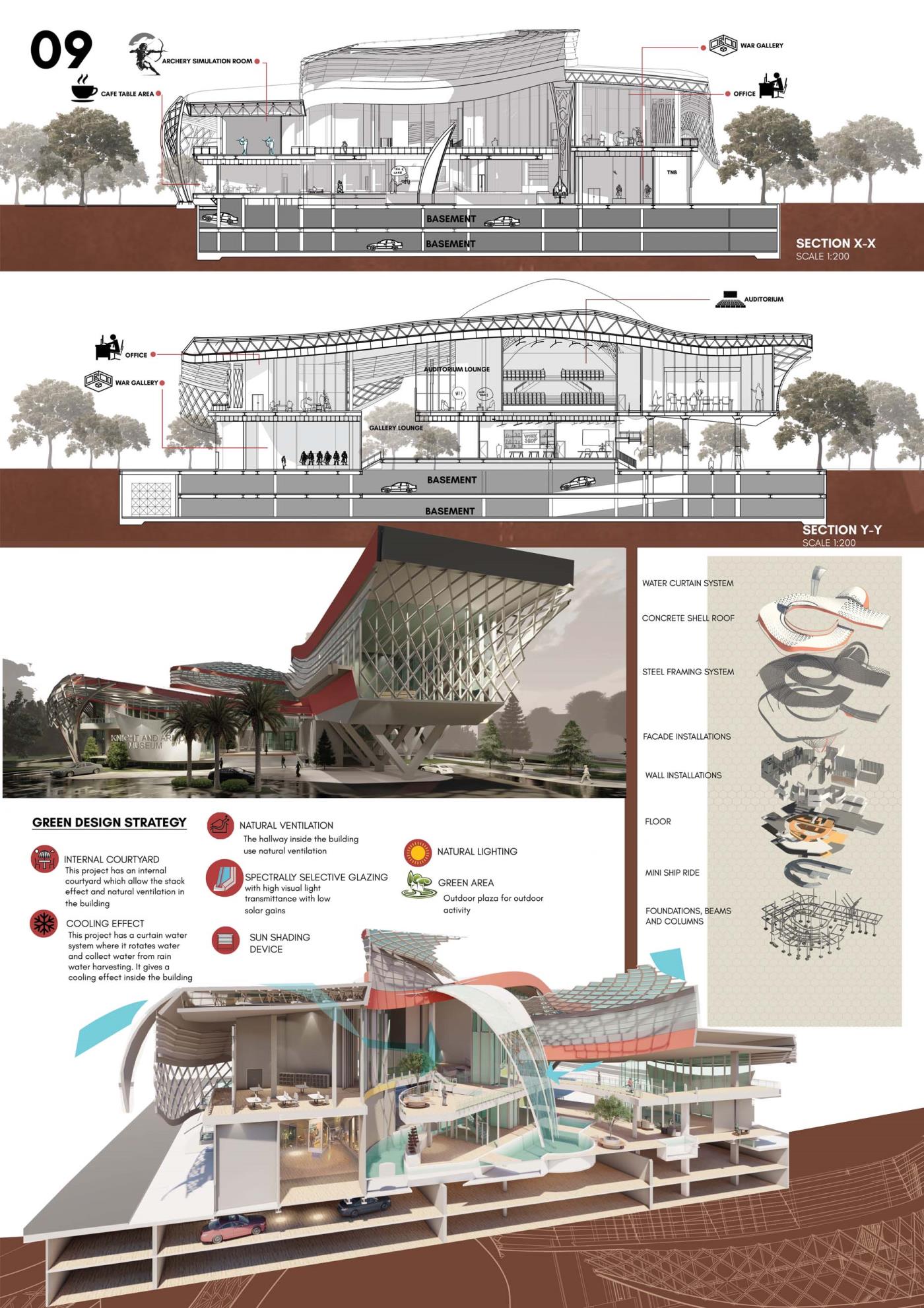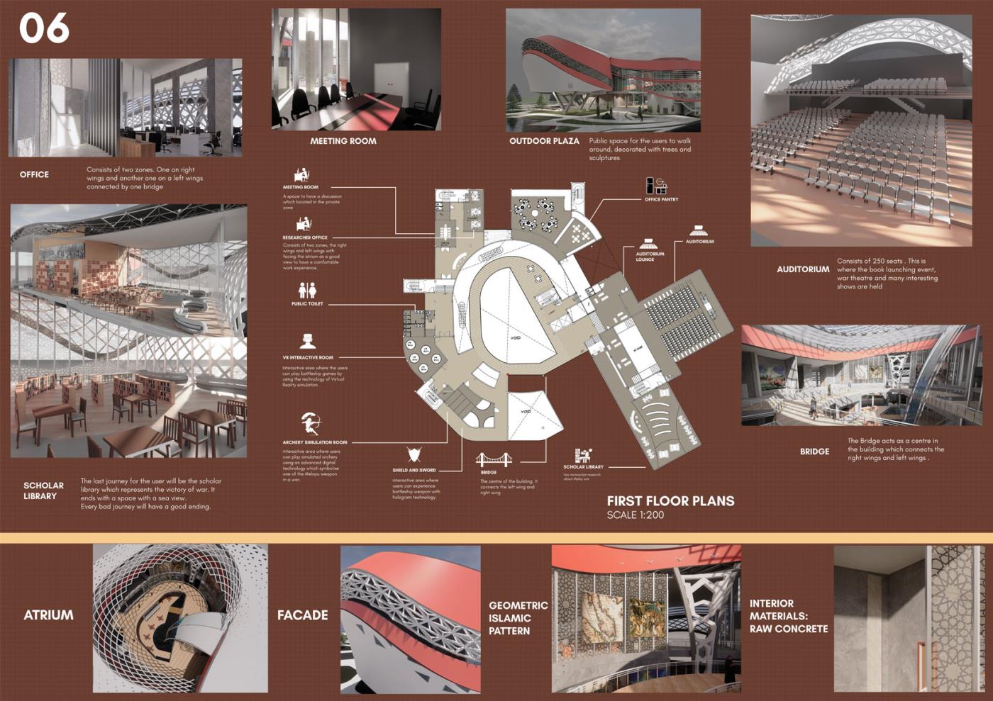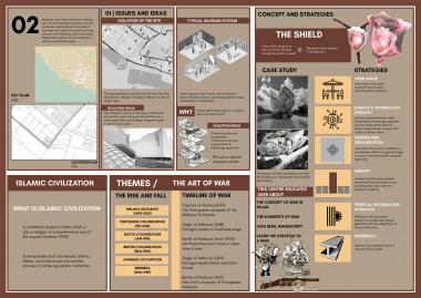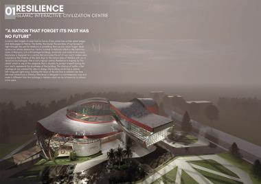 Resilience Part 1 Project 2020 Farah lzzaaty Afifi Ishak MARA University of Technology - Perak campus | Malaysia A nation that forgets its past had no future. Every place has written great pages and dark pages in History. The battle, the blood, the sacrifice of our heroes to fight through the war for Malacca is something that we can never forget. Resilience is an Islamic Interactive Centre located in Malacca which is the historical state of Malaysia, rich with heritage buildings, landmarks and colonial structures. Resilience is designed as a centre that promotes the art of war and it makes users experience the timeline of the dark days to the victory days of Melaka with our interactive technologies. This is not a typical centre. Resilience is inspired by 'the shield' which is one of the weapons that is durable to protect oneself during the war and it represents the sturdiness of the building. The division of battle in the strategy of war creates the idea to design the building which has a centre, left-wing and right-wing. Tackling the issue of the site that is isolated, far from the main attractions in Melaka, Resilience is designed in a contemporary way and make it different from the buildings in Melaka which act as a hierarchy to attract more users. Tutor(s) Amirul Amin Ismail Mayamin Yuhaniz