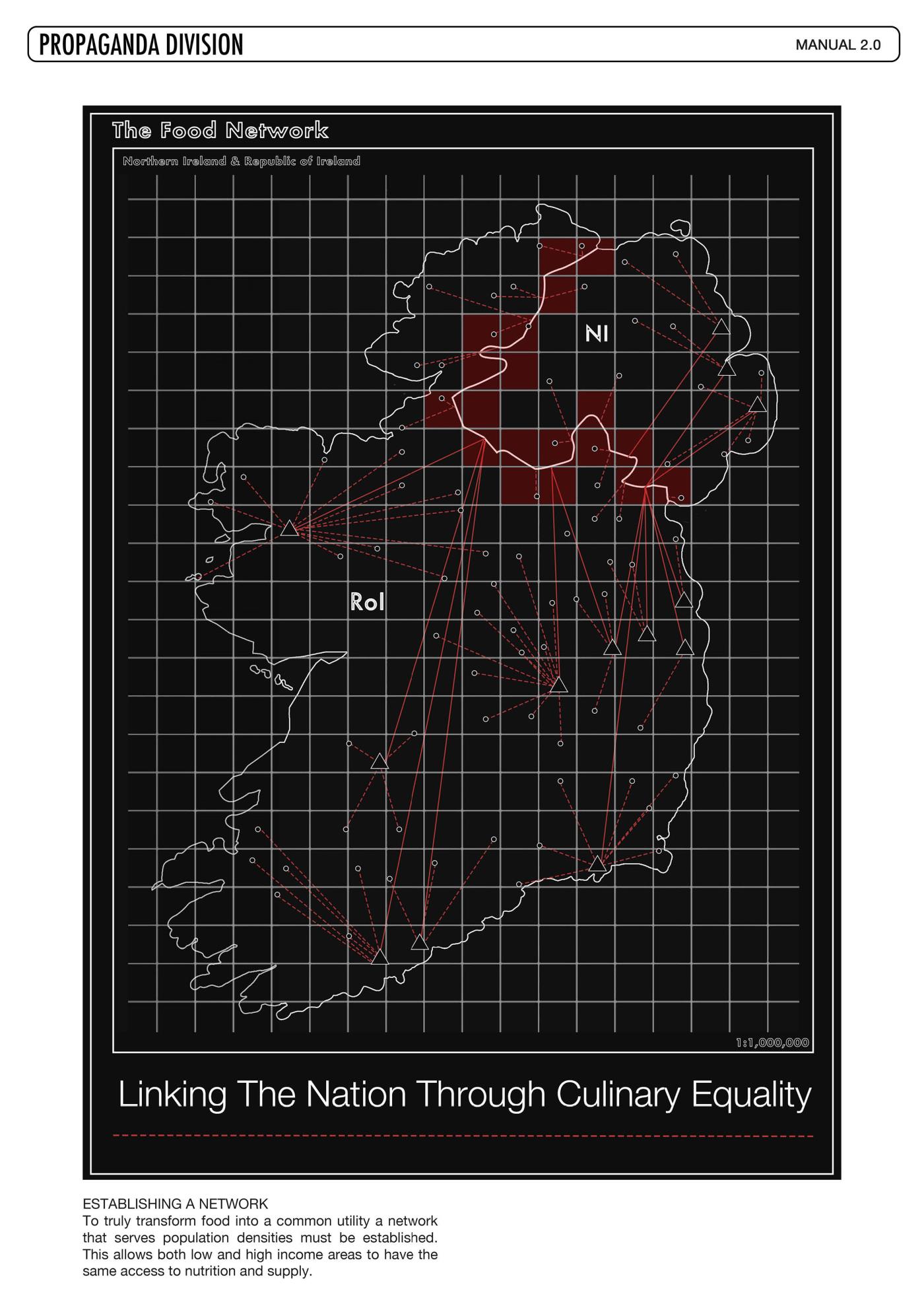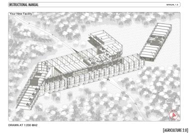 Agriculture 2.0 Part 1 Project 2020 Alexander Wallace Manchester School of Architecture | UK Agriculture 2.0 looks at the deconstruction of food infrastructure and by extension the way we think about food as a society. By challenging the commoditisation of food we can start to transition into a food utility network, acknowledging what it is: a right. We have become used to running water and sanitation being provided to us as basic amenities, why not food.Using the context of the Irish border, the project looks at the complex political and policy changes of Brexit to prepare the nation for a changing political landscape.The scheme is designed using modular techniques not just in its details but in its overall philosophy, facilities around the world plugging into the wider network. This modularity is directed through instructional handbooks that focus on all scales from global to detail. A key part of the scheme is community engagement, using local culture to integrate itself into the Landscape.The Environmental benefits of this new agricultural strategy are limitless, having a positive impact globally through production and transportation. Agriculture 2.0 is not only a transformative project but one that could change the world as we know, allowing access to food to be the right it is. Tutor(s) Jack Penford Baker