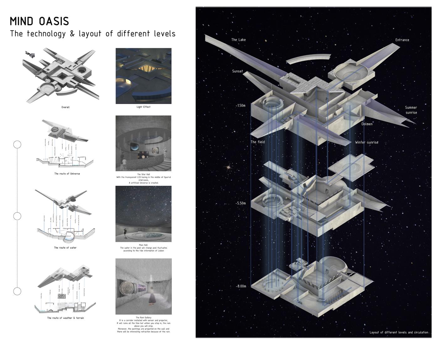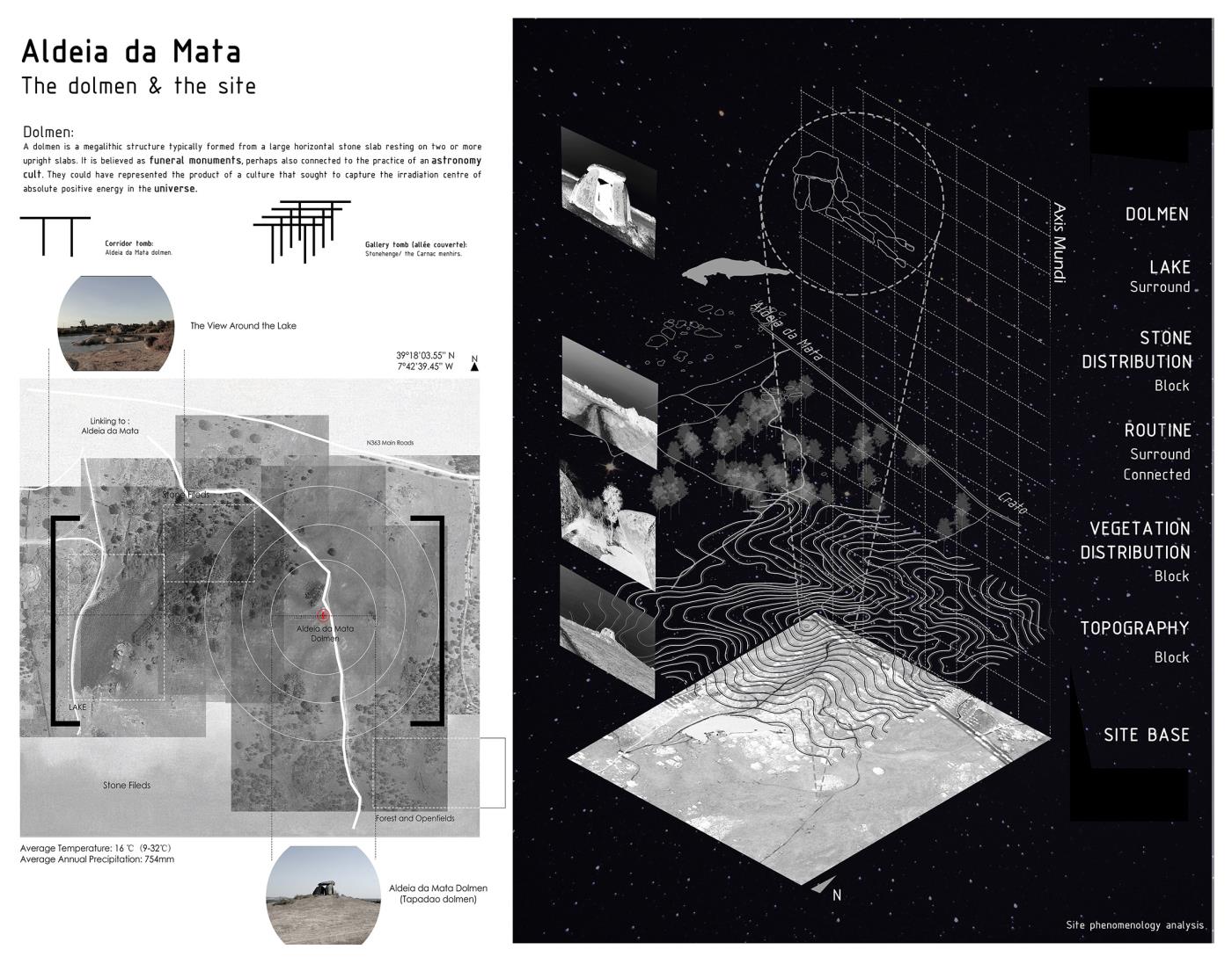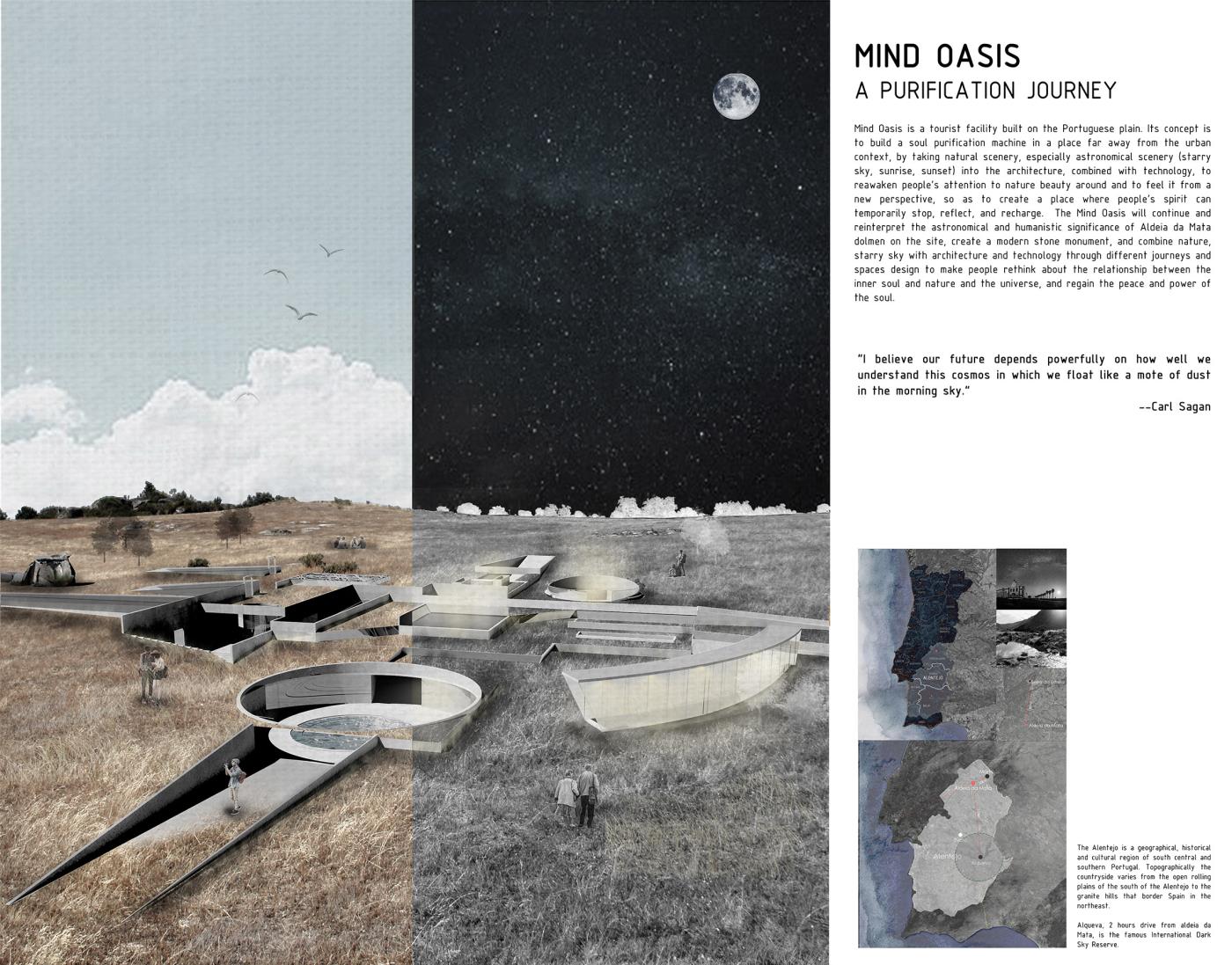 Mind Oasis - The Starry Sky Above Me Part 1 Project 2020 Wenxi Wang Xi'an Jiaotong-Liverpool University | China Mind Oasis is a tourist facility built on the Portuguese plain. Its concept is to build a soul purification machine in a place far away from the urban context, by taking natural scenery, especially astronomical scenery (starry sky, sunrise, sunset) into the architecture, combined with technology, to reawaken people’s attention to natural beauty around and to feel it from a new perspective, so as to create a place where people’s spirit can temporarily stop, reflect, and recharge. Philosophical theory for example the phenomenology of architecture, the collective unconscious and the semiotic are used as design strategies. The Mind Oasis will continue and reinterpret the astronomical and humanistic significance of Aldeia da Mata dolmen on the site, create a modern stone monument, and combine nature, starry sky with architecture and technology through different journeys and spaces design to make people rethink about the relationship between the inner soul and nature and the universe, and regain the peace and power of the soul. Tutor(s) Juan Carlos Dall'Asta