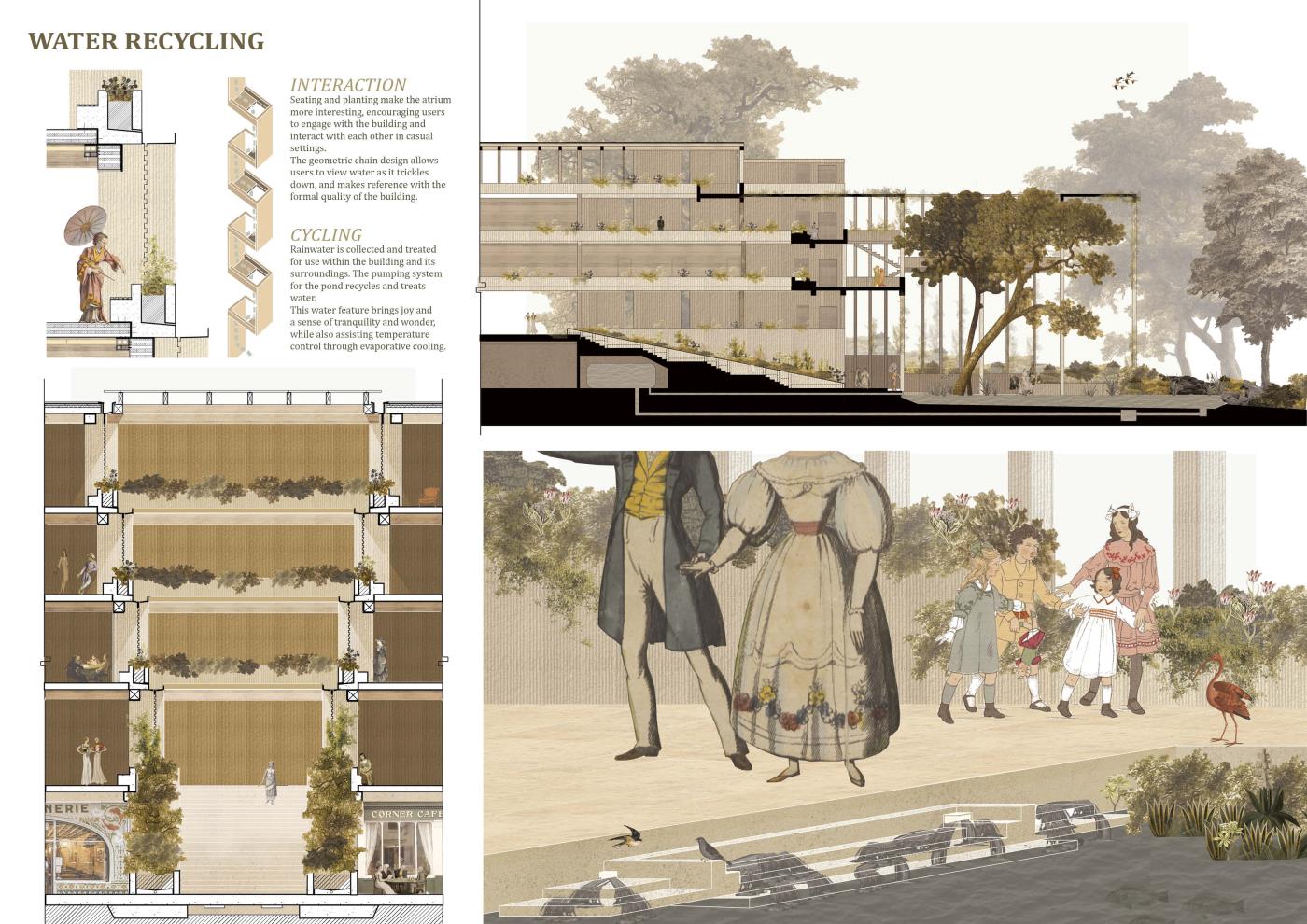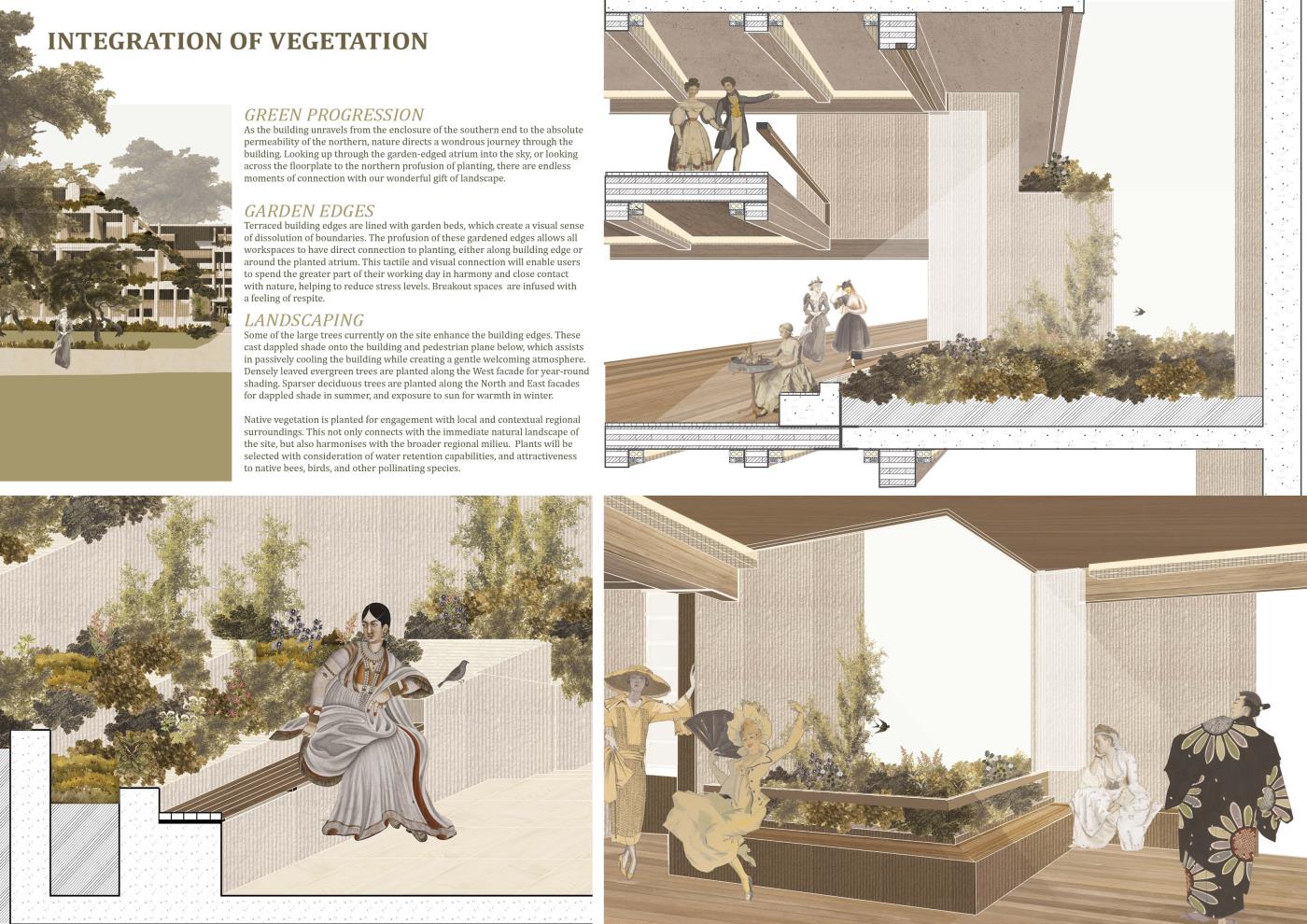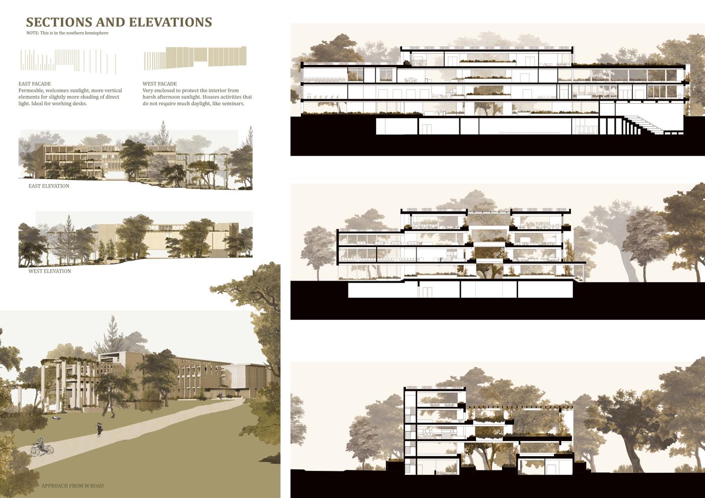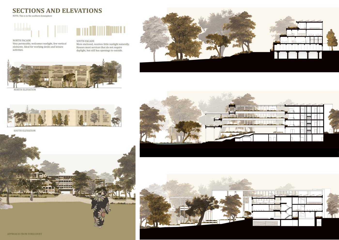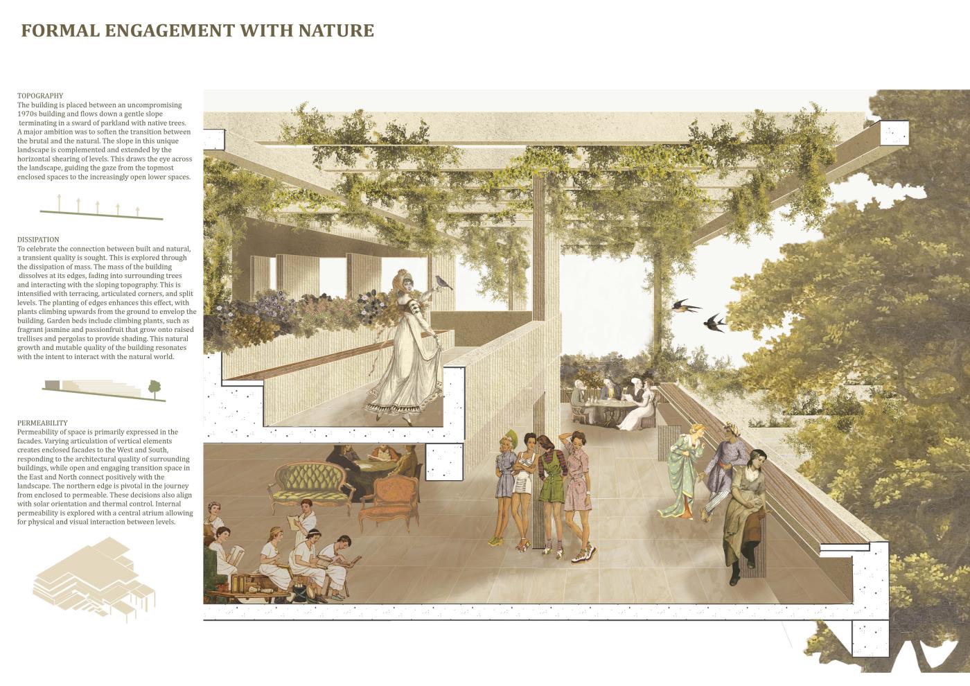 Gateway Precinct Building Part 1 Project 2020 Mariana Reher University of Queensland | Australia The project responds to a simple brief for a University building in a subtropical climate, striving to create sustainable architecture that respects its setting and takes moral responsibility for the interaction of its users with their environment. Sustainability is a critical issue of our current era. Successful modern buildings must achieve beyond formal dreams and functional goals; they must work symbiotically with nature to reduce their ecological impacts. The placeless, temperature-controlled, constricted University building has run its course; it is my aim to create an innovative space intrinsically connected to its natural environment. This is developed through mindful integration of internal and external spaces, passive thermal control, and physical and visual interactions with natural elements. Through landscaping with native vegetation, the region is celebrated – and the permeability of the building encourages users to interact with this revitalized scape and rediscover their wonder for nature. Frequent interaction with nature has proven benefits to mental and physical health; conversely, chronic isolation from plants and fresh air leads to depressive disorders. Thus, providing a medium through which people may reconnect with their natural environment will benefit not only our planet, but also the wellbeing of our communities. It is our duty. Tutor(s) Alejandro Cohn