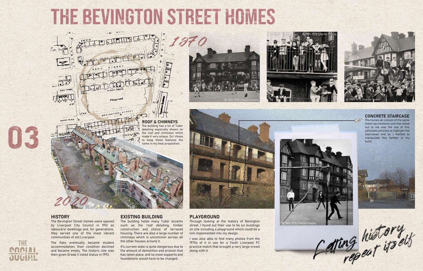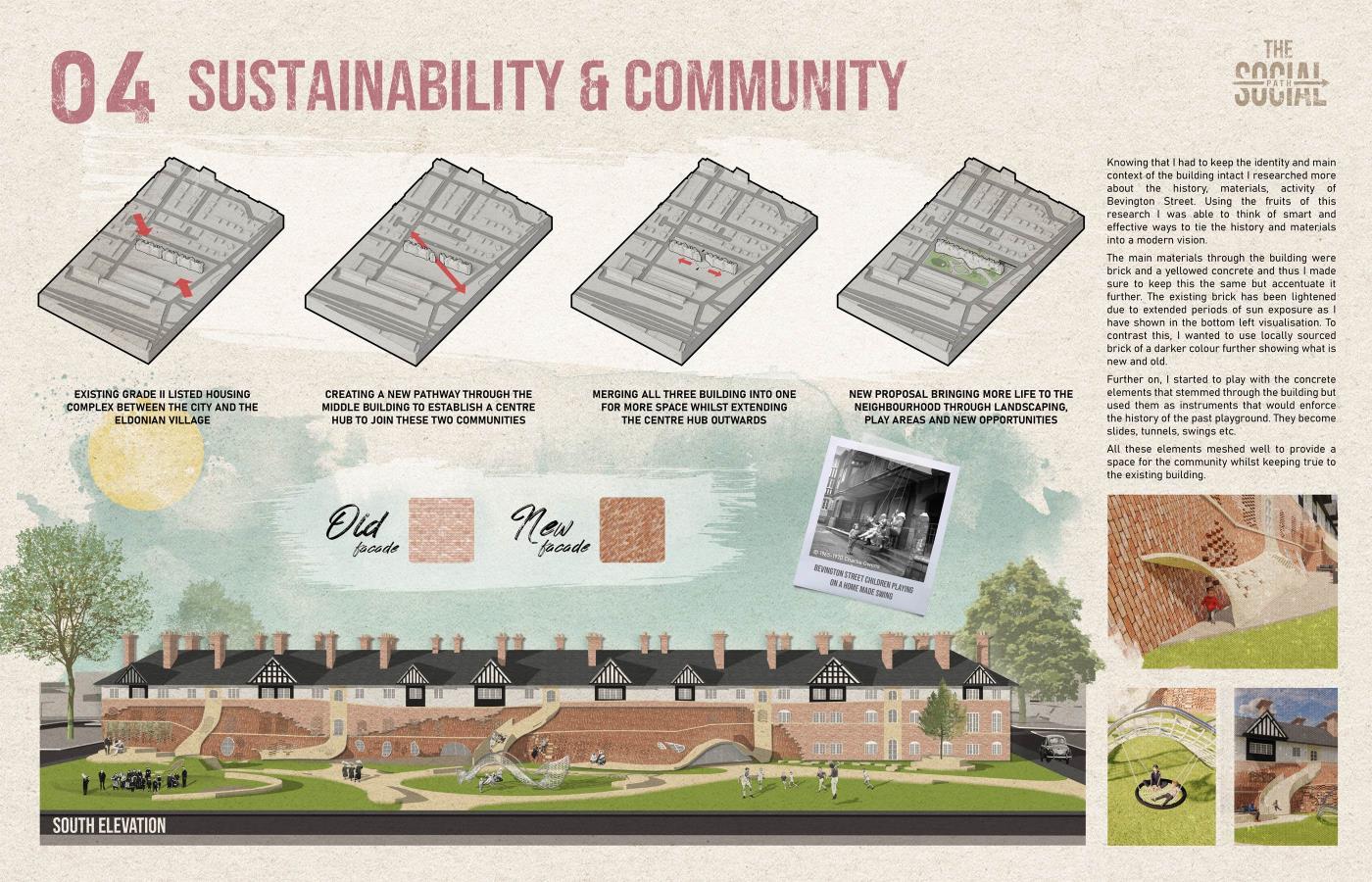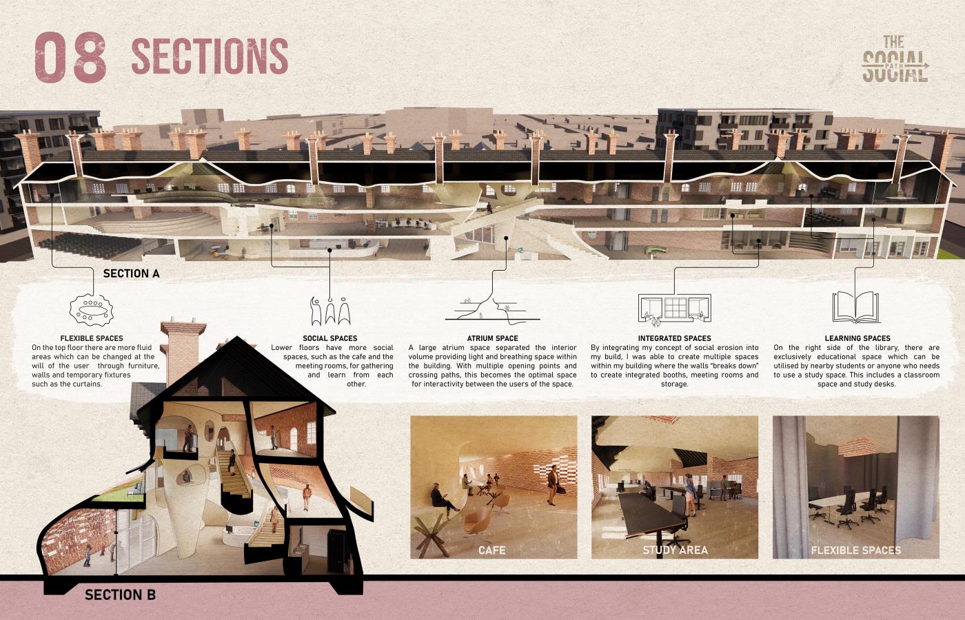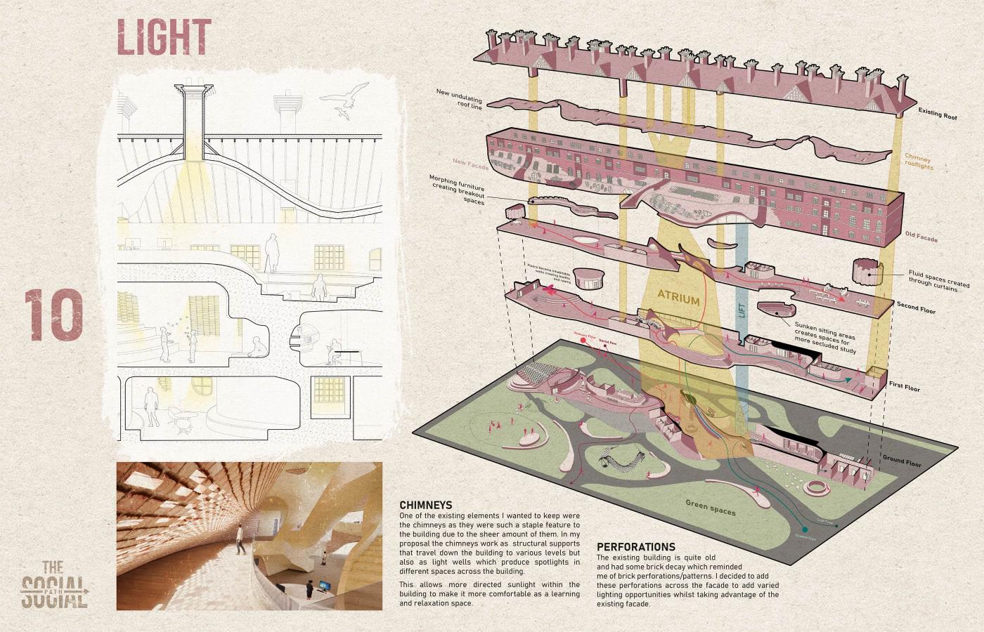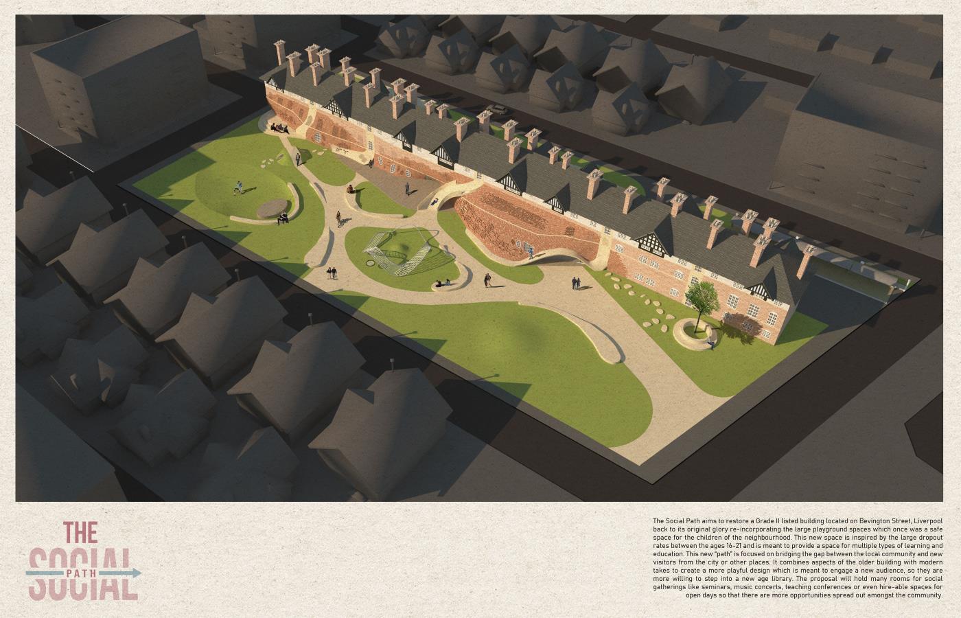 The Social Path aims to restore a Grade II listed building located on Bevington Street, Liverpool back to its original glory re-incorporating the large playground spaces which once was a safe space for the children of the neighbourhood. This new space is inspired by the large dropout rates between the ages 16-21 and is meant to provide a space for multiple types of learning and education. This new “path” is focused on bridging the gap between the local community and new visitors from the city or other places. It combines aspects of the older building with modern takes to create a more playful design which is meant to engage a new audience, so they are more willing to step into a new age library. The proposal will hold many rooms for social gatherings like seminars, music concerts, teaching conferences or even hire-able spaces for open days so that there are more opportunities spread out amongst the community.