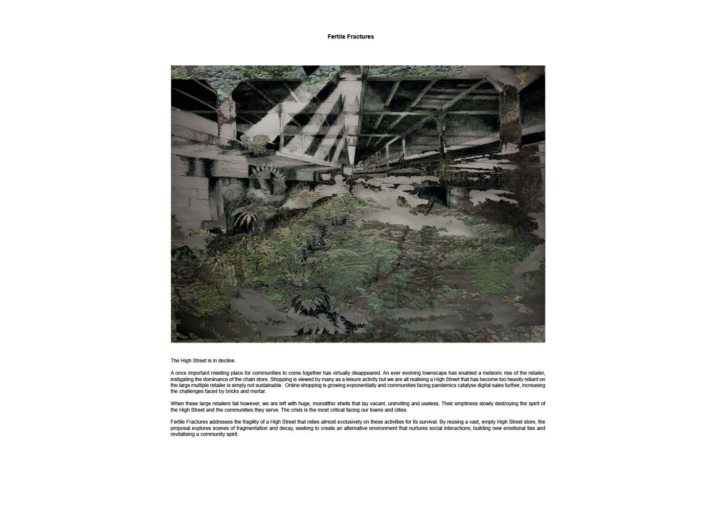 Reusing a vast, empty High Street store, the proposal explores scenes of fragmentation and decay, seeking to create an alternative environment that nurtures social interactions; builds new emotional ties and revitalises a community spirit.