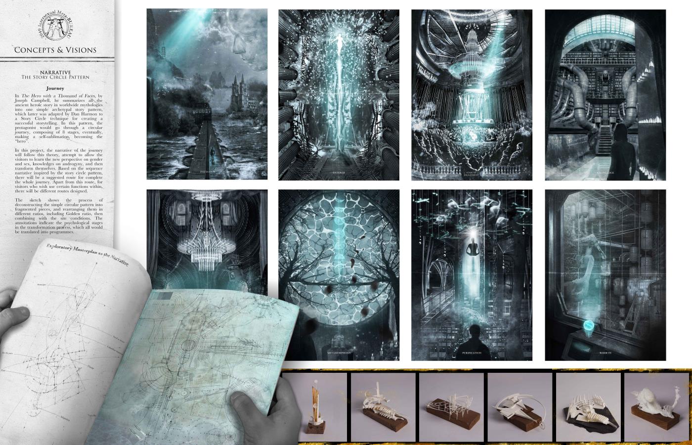 This architectural project proposes a gradual formation of a blurred gender division, to address gender equality and a deeper understanding between two sexes. The project attempts to tell the story of the emerging and sanctification of Androgyny, a universal psychological archetype of the perfect being, in a society without sexual prejudice. The architecture thus has become the sanctum sanctorum on the city’s tapestry for its believers to preach their gender spectrum through a ritualistic monomyth.