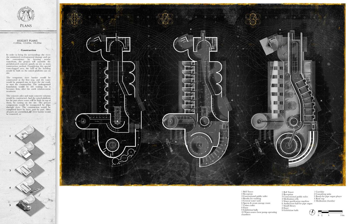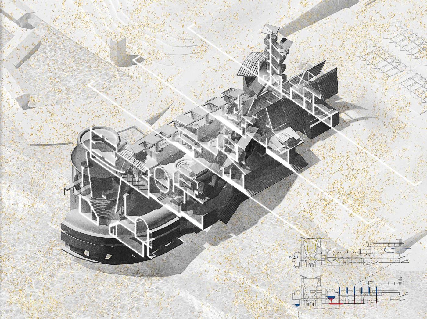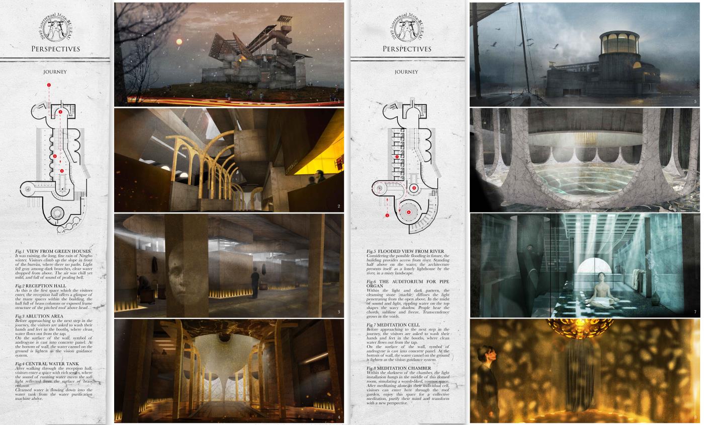 Inspired by the scenes depicted in Ursula K. Le Guin’s science-fiction The Left Hand of Darkness, that is, a world without sexism on an icebound planet, this project foretells a scenario that Ningbo, a seaport city, bedevilled by a severe flood in 2049, whose historical inheritances of the intercultural fusion promise the arrival of the new perspective. Navigating through various spaces, the architecture offers a metamorphosing journey related with a metaphorical water treatment process for visitors’ transformation, as well as the water’s presence in the context of Yong River. Situating in between reality and fiction, the project fictitiously speculates a tangible reality in the future.