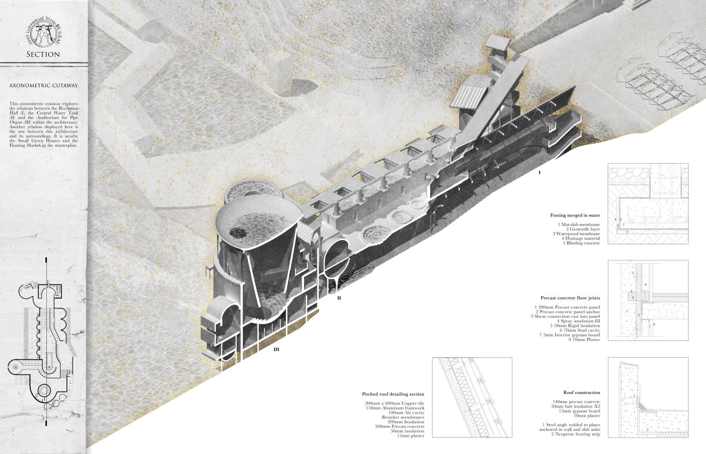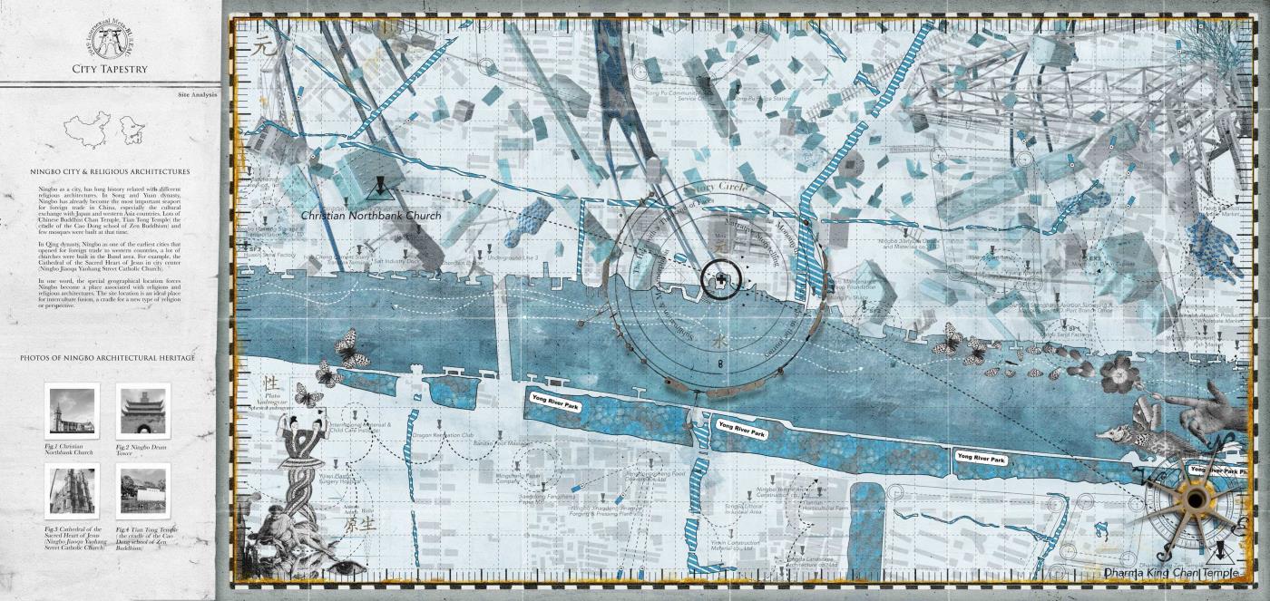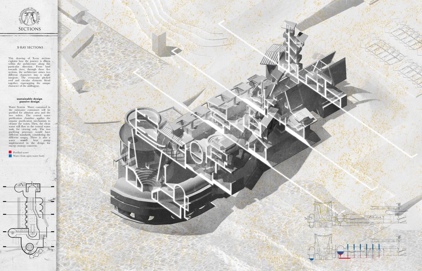 Inspired by the scenes depicted in Ursula K. Le Guin’s science-fiction The Left Hand of Darkness, that is, a world without sexism on an icebound planet, this project foretells a scenario that Ningbo, a seaport city, bedevilled by a severe flood in 2049, whose historical inheritances of the intercultural fusion promise the arrival of the new perspective. Navigating through various spaces, the architecture offers a metamorphosing journey related with a metaphorical water treatment process for visitors’ transformation, as well as the water’s presence in the context of Yong River. Situating in between reality and fiction, the project fictitiously speculates a tangible reality in the future.