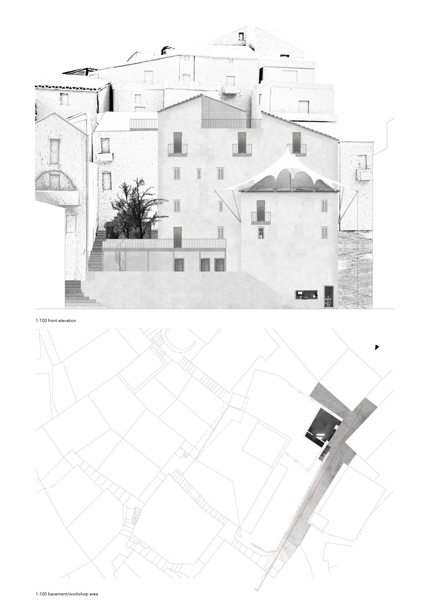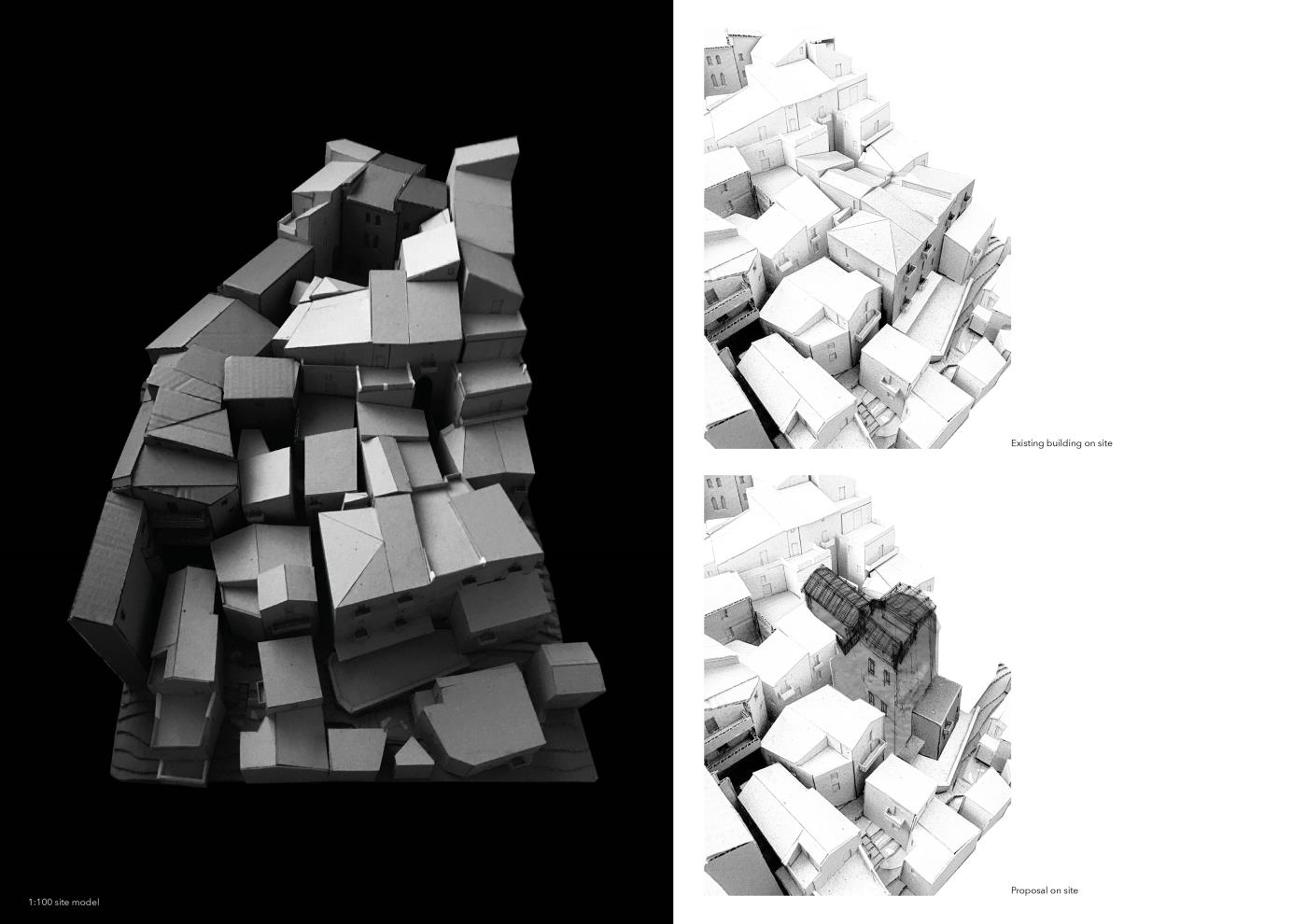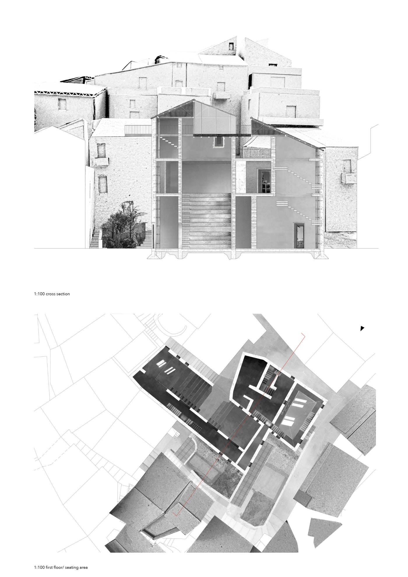 The Embedded Theatre Part 1 Project 2020 Paris Horstmann London Metropolitan University | UK The design process started with a number of ingredients; spatial, material, and forms of practice. These were liberated by the exploration of a ‘caravanserai’, which inspired ‘The Embedded Theatre’, within the partially abandoned urban landscape of the medieval village Belmonte Calabro. Making a dialogical relationship between the citizens of Belmonte and states of the existing abandoned village fabric, gradually, the theatre emerged through iterations of models, sketches and rendering techniques, where light and shade became actors playing deeply into the sections. The roof spanned the entire complex of existing and ‘adjusted buildings’, allowing for a loose-fit architecture to ramble in cascades through the hill town and provide a myriad of uses from theatre to market place. Tutor(s) Sandra Denicke-Polcher Jane Mcallister