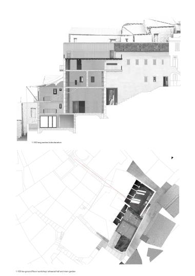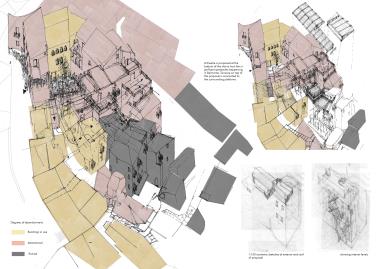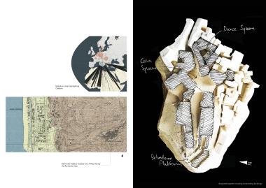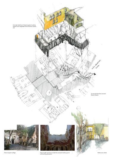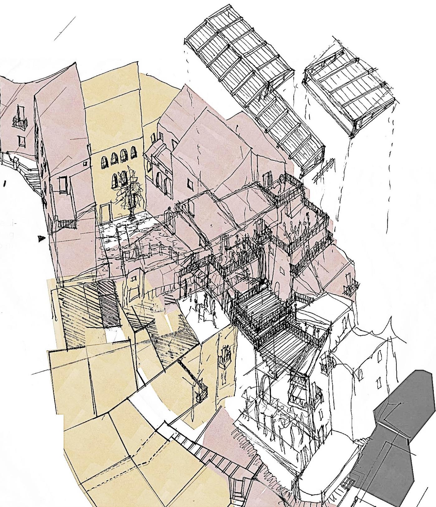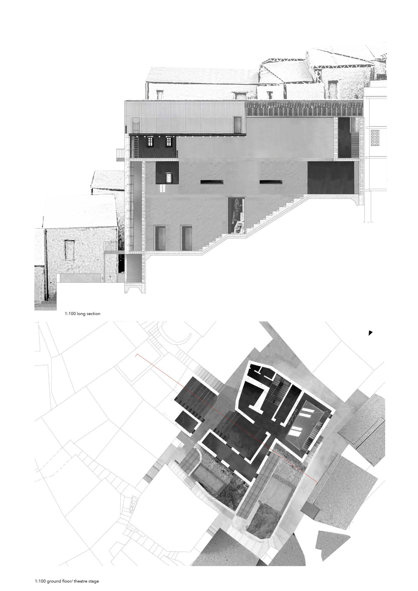 The Embedded Theatre Part 1 Project 2020 Paris Horstmann London Metropolitan University | UK The design process started with a number of ingredients; spatial, material, and forms of practice. These were liberated by the exploration of a ‘caravanserai’, which inspired ‘The Embedded Theatre’, within the partially abandoned urban landscape of the medieval village Belmonte Calabro. Making a dialogical relationship between the citizens of Belmonte and states of the existing abandoned village fabric, gradually, the theatre emerged through iterations of models, sketches and rendering techniques, where light and shade became actors playing deeply into the sections. The roof spanned the entire complex of existing and ‘adjusted buildings’, allowing for a loose-fit architecture to ramble in cascades through the hill town and provide a myriad of uses from theatre to market place. Tutor(s) Sandra Denicke-Polcher Jane Mcallister
