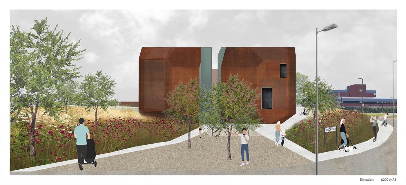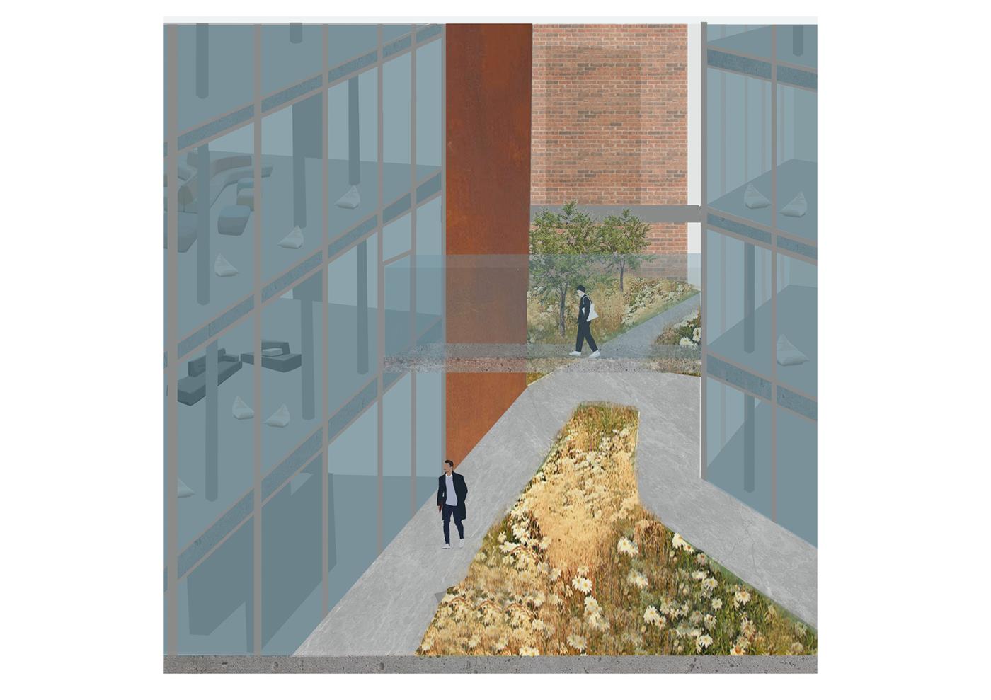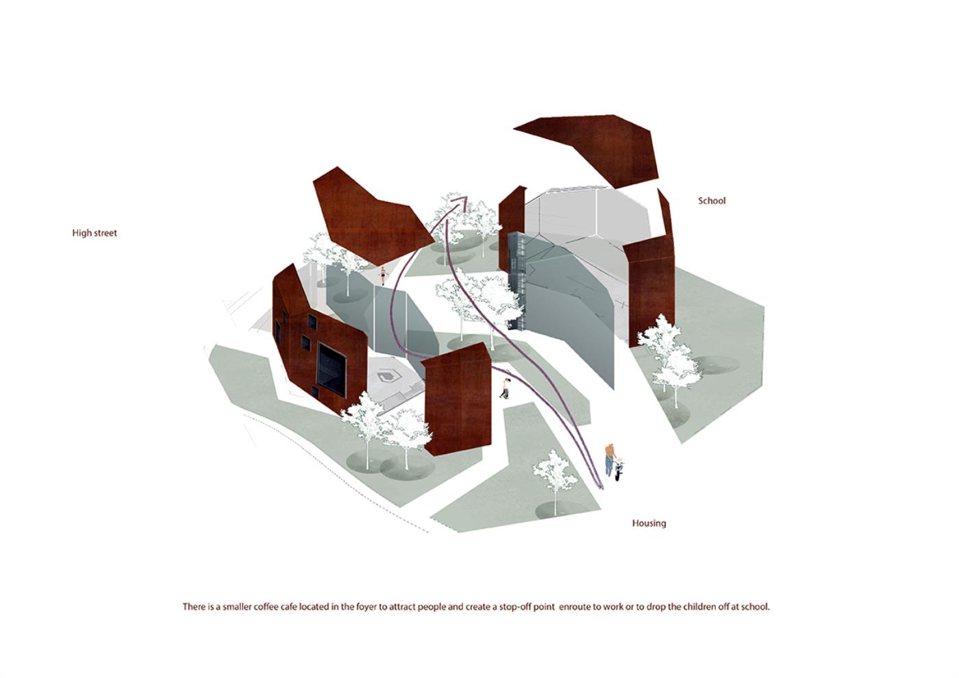 Repository of Knowledge: Borehamwood Public Library Part 1 Project 2020 Laura Smith University of Hertfordshire | UK Demographic studies of Borehamwood show that the majority of the population are predominantly in the lower income group. This effects the area’s school funding and, in turn, educational opportunities. Studies show how the natural environment has an important impact on the uptake of information, especially in the children’s learning development. By designing a space surrounded by the natural environment and directing access to the building through a natural ‘portal’, there will be a positive impact on their learning experience. Furthermore, by splitting the building down the middle through planting a tree lined meadow, nature, along with all it’s positive benefits, can be brought back into the heart of the building. The bugs and wild animals which inhabit the plot can be another resource to help the town’s children learn about wildlife.The natural landscape flows through the two structures, bound together by walkways on each level. Organised into distinct areas, a quiet study space and a community-based area, designed for interaction and activity. I sought to break the mould of the conventional library designs. The earthy tones of the Corten façade ground the building in the heart of this highly industrialised metropolis. Tutor(s) Ian Owen