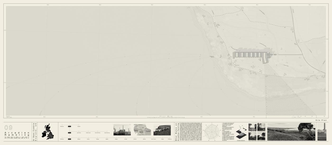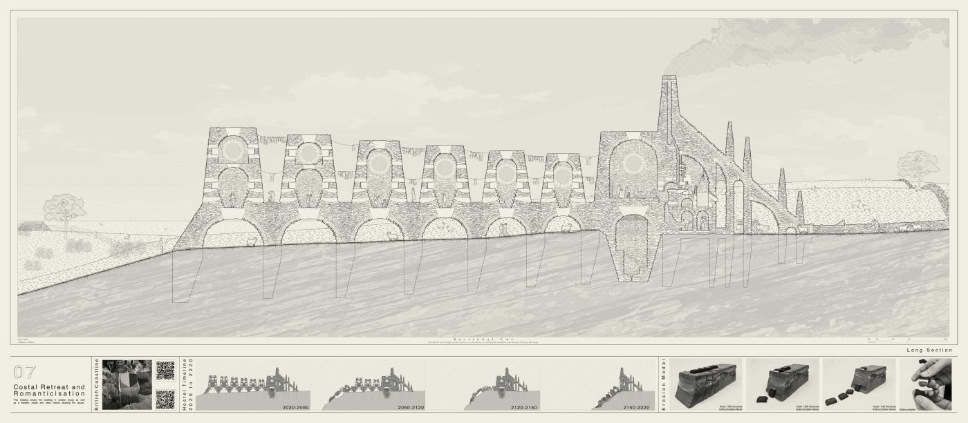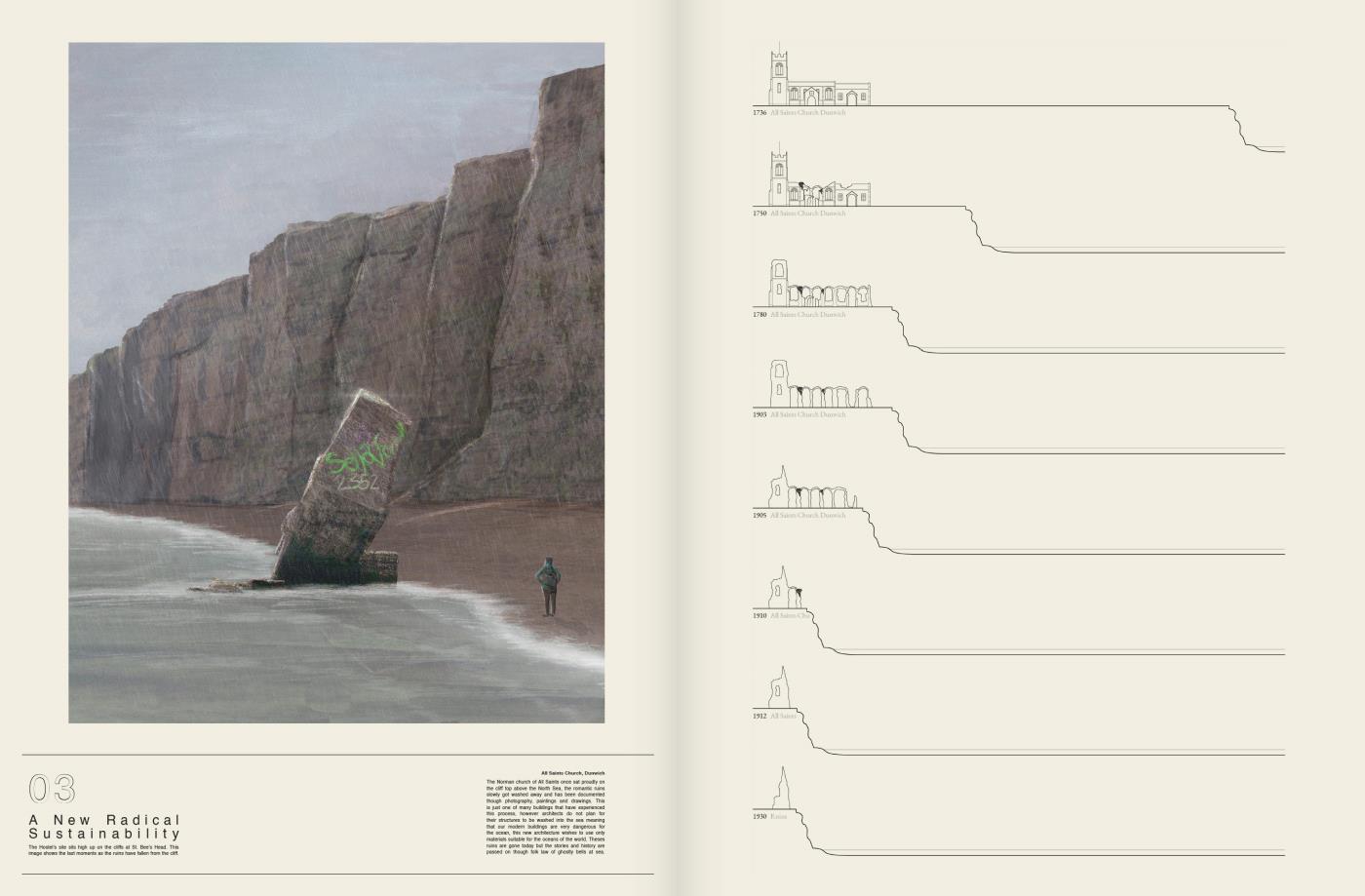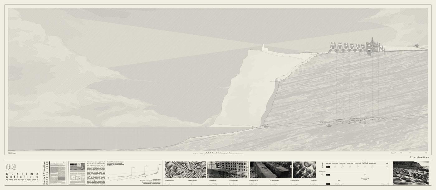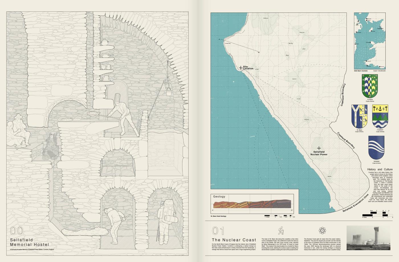 Sellafield Nuclear Memorial Hostel Part 1 Project 2020 Austin McGrath Oxford Brookes University Oxford | UK The Cumbrian coastline is home to Sellafield: Europe’s largest nuclear reprocessing plant. With its closure in 2018, the plant’s clean-up and deconstruction is expected to take a minimum of 100 years.This project wishes to question the Contemporary cannon of sustainability and construction though its radical design. It sits atop of the southernmost point of St Bees Head, serving as a halfway house for the two day hike from Whitehaven to Sellafield along the Nuclear Coast, as well as the starting point for the 182mile walk from St Bees to Robin Hood Bay. The linear stone structure is designed to undergo an accelerated yet controlled ruination process using the waves of the Irish sea as its catalyst. The building becomes an instrument to perceive the passing of time, eroding into the sea in parallel to the plant’s decommissioning process. In contrast with the neighbouring nuclear site, the hostel allows for a decomposition process that does not pose any threat to the environment. After all of the hostel rooms are reclaimed by the Irish Sea, what is left of the building turns into a ruin, acting as an Arcadian memorial to the Sellafield Nuclear Facility. Tutor(s) Johanna Just Vanessa Lafoy Agostino Nickl
