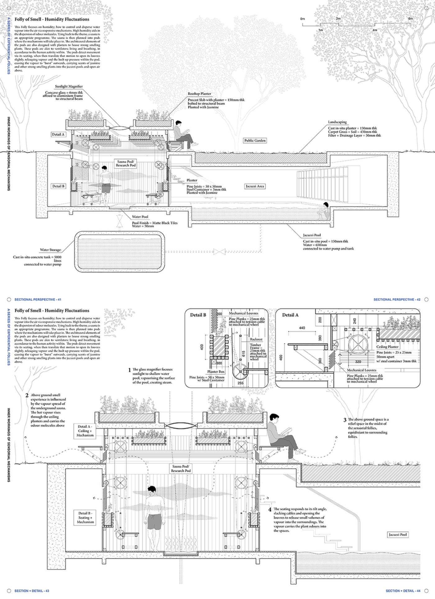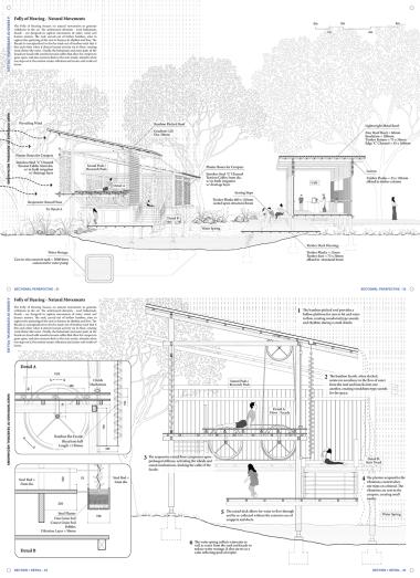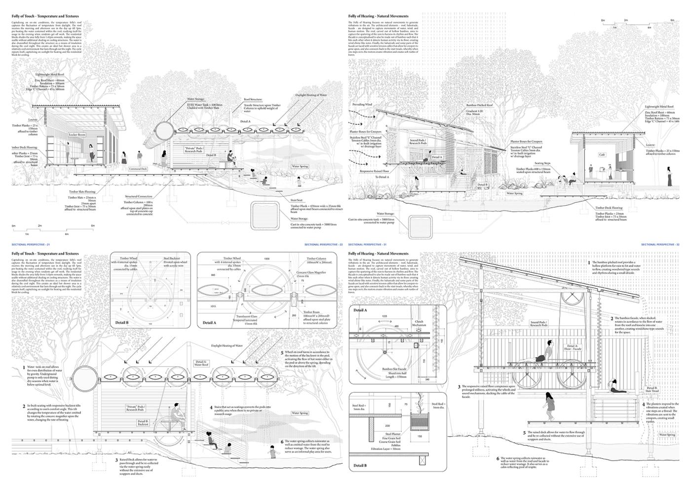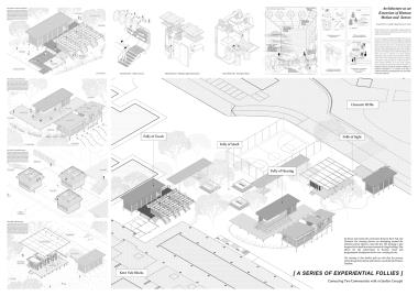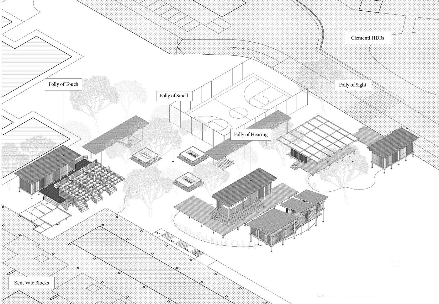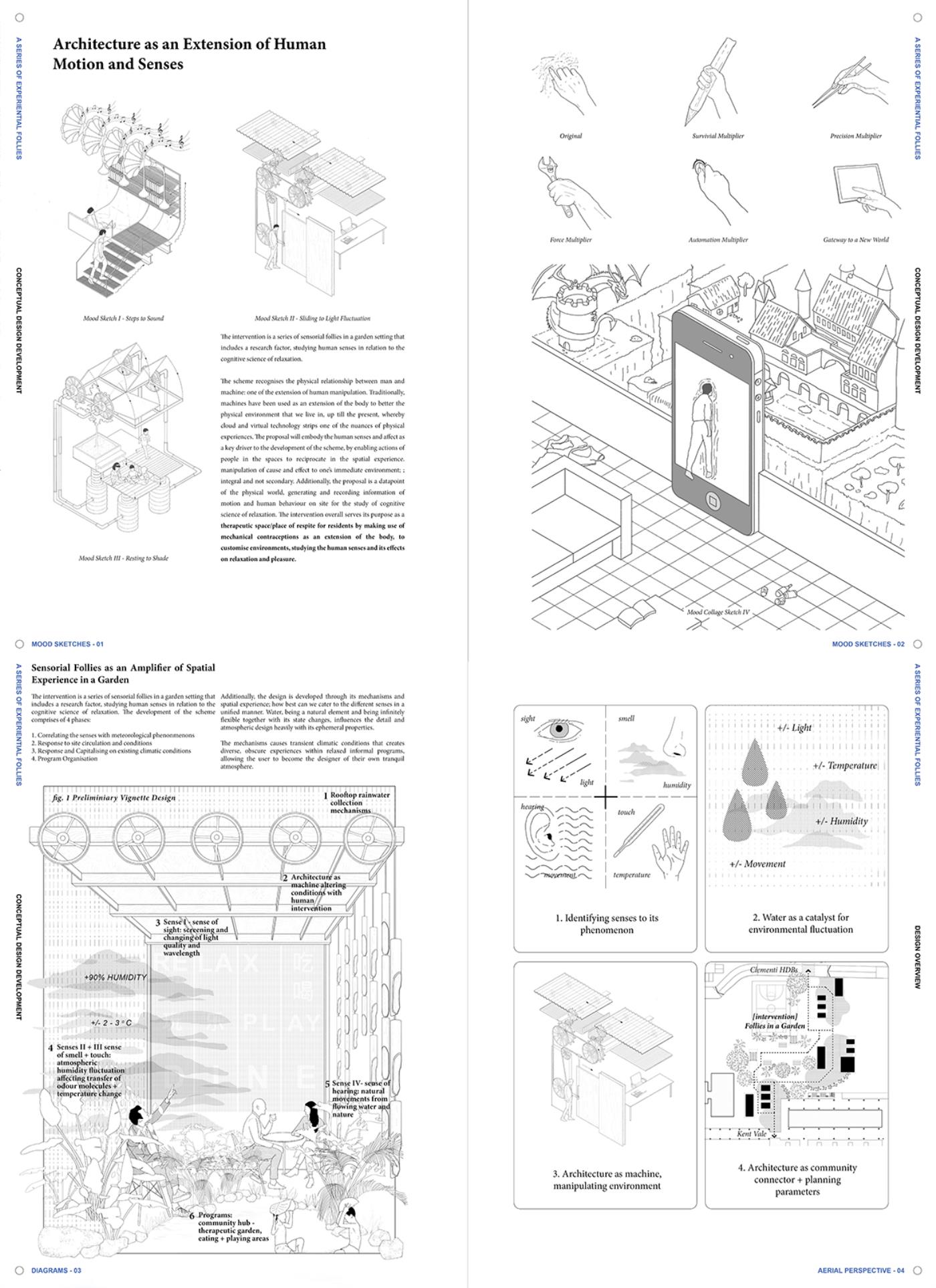 A Series of Experiential Follies Part 1 Project 2020 Hong Xi, Clarence Tan National University of Singapore | Singapore The scheme recognises the physical relationship between man and machine: one of the extensions of human manipulation. Traditionally, machines have been used as an extension of the body to better the physical environment that we live in, up till the present, whereby cloud and virtual technology and the increasingly complicated urban setting strips one of the nuances of physical experiences. The proposal will embody the human senses and affect as a key driver to the development of the scheme, by enabling actions of people in the spaces to reciprocate in the spatial experience. The manipulation of cause and effect to one’s immediate environment enables a subtle sense of empowerment and control, re-establishing man’s role as the master of machines and in turn, environment; integral and not secondary. Additionally, the proposal is a data point of the physical world, recording information of motion and human behaviour on-site for the study of cognitive science. The intervention overall serves its purpose as a therapeutic space for residents by making use of mechanical contraception as an extension of the body to customise environments, studying the human senses and its effects on relaxation and pleasure through a series of experiential follies. Tutor(s) Lik Rem Chu