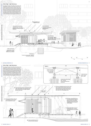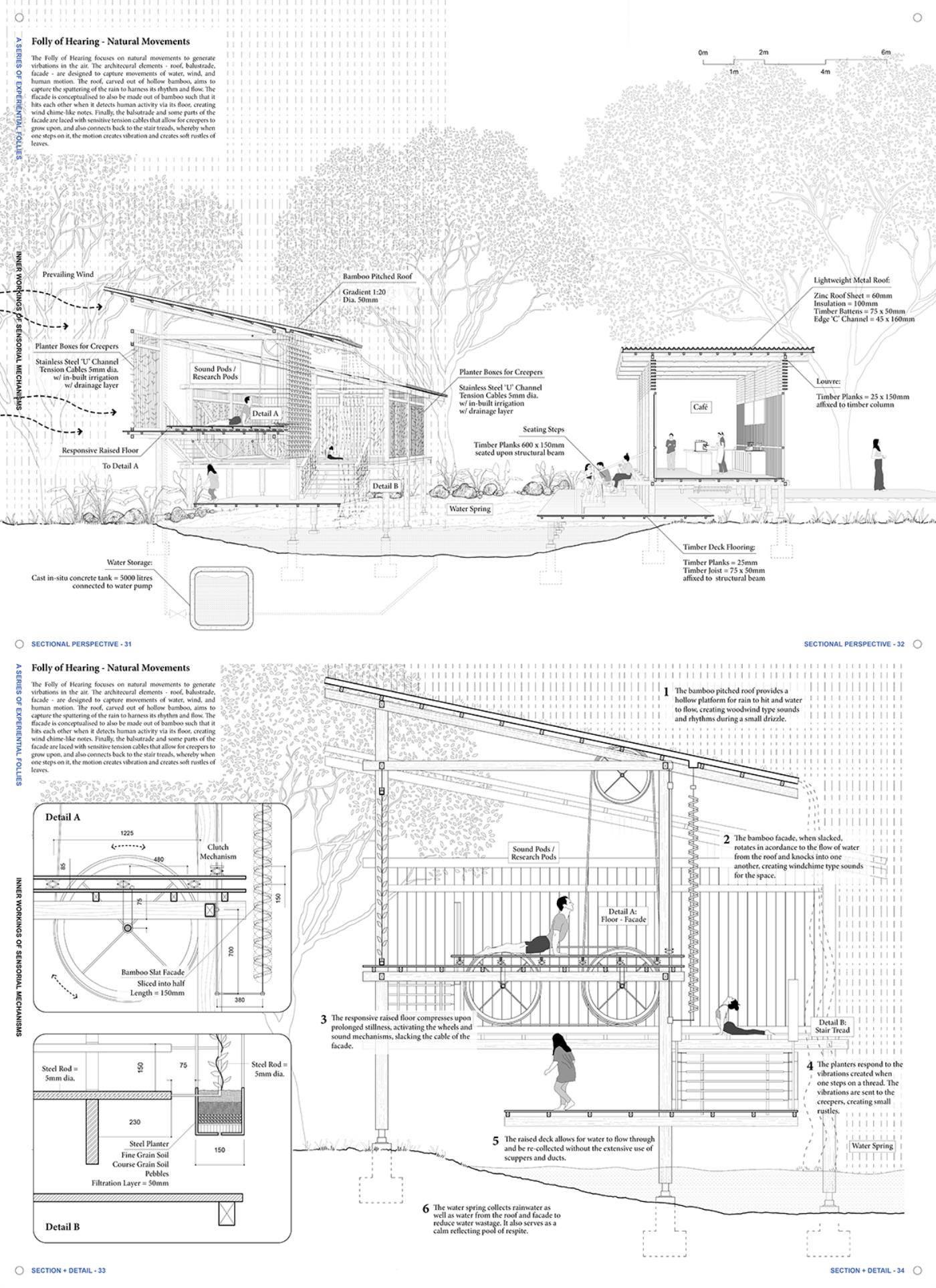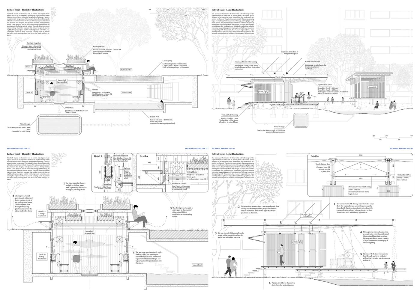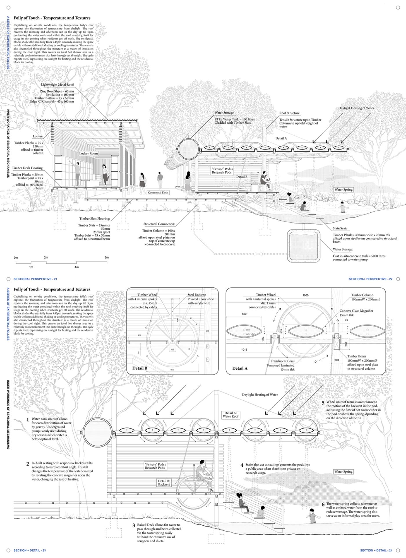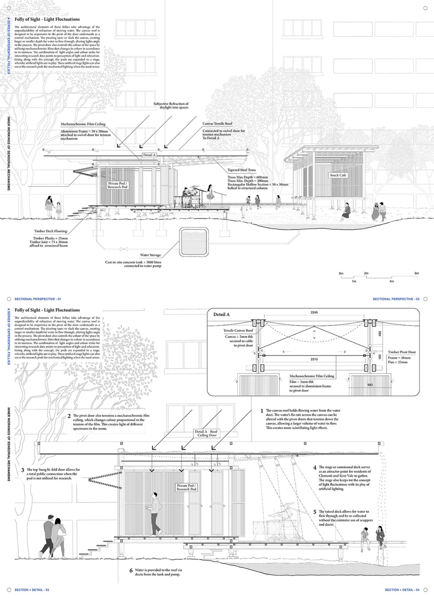 A Series of Experiential Follies Part 1 Project 2020 Hong Xi, Clarence Tan National University of Singapore | Singapore The scheme recognises the physical relationship between man and machine: one of the extensions of human manipulation. Traditionally, machines have been used as an extension of the body to better the physical environment that we live in, up till the present, whereby cloud and virtual technology and the increasingly complicated urban setting strips one of the nuances of physical experiences. The proposal will embody the human senses and affect as a key driver to the development of the scheme, by enabling actions of people in the spaces to reciprocate in the spatial experience. The manipulation of cause and effect to one’s immediate environment enables a subtle sense of empowerment and control, re-establishing man’s role as the master of machines and in turn, environment; integral and not secondary. Additionally, the proposal is a data point of the physical world, recording information of motion and human behaviour on-site for the study of cognitive science. The intervention overall serves its purpose as a therapeutic space for residents by making use of mechanical contraception as an extension of the body to customise environments, studying the human senses and its effects on relaxation and pleasure through a series of experiential follies. Tutor(s) Lik Rem Chu