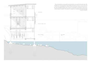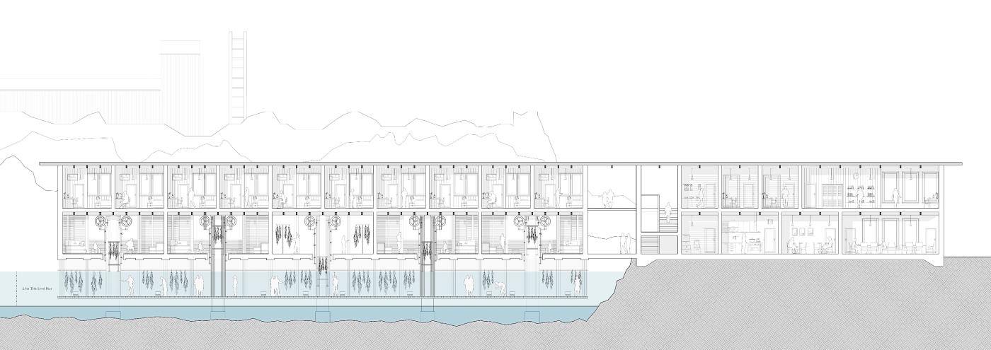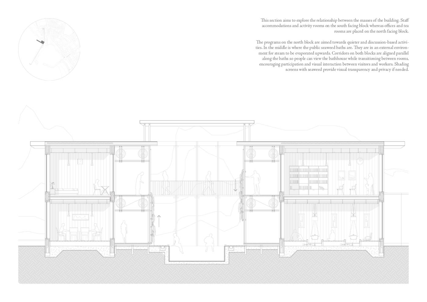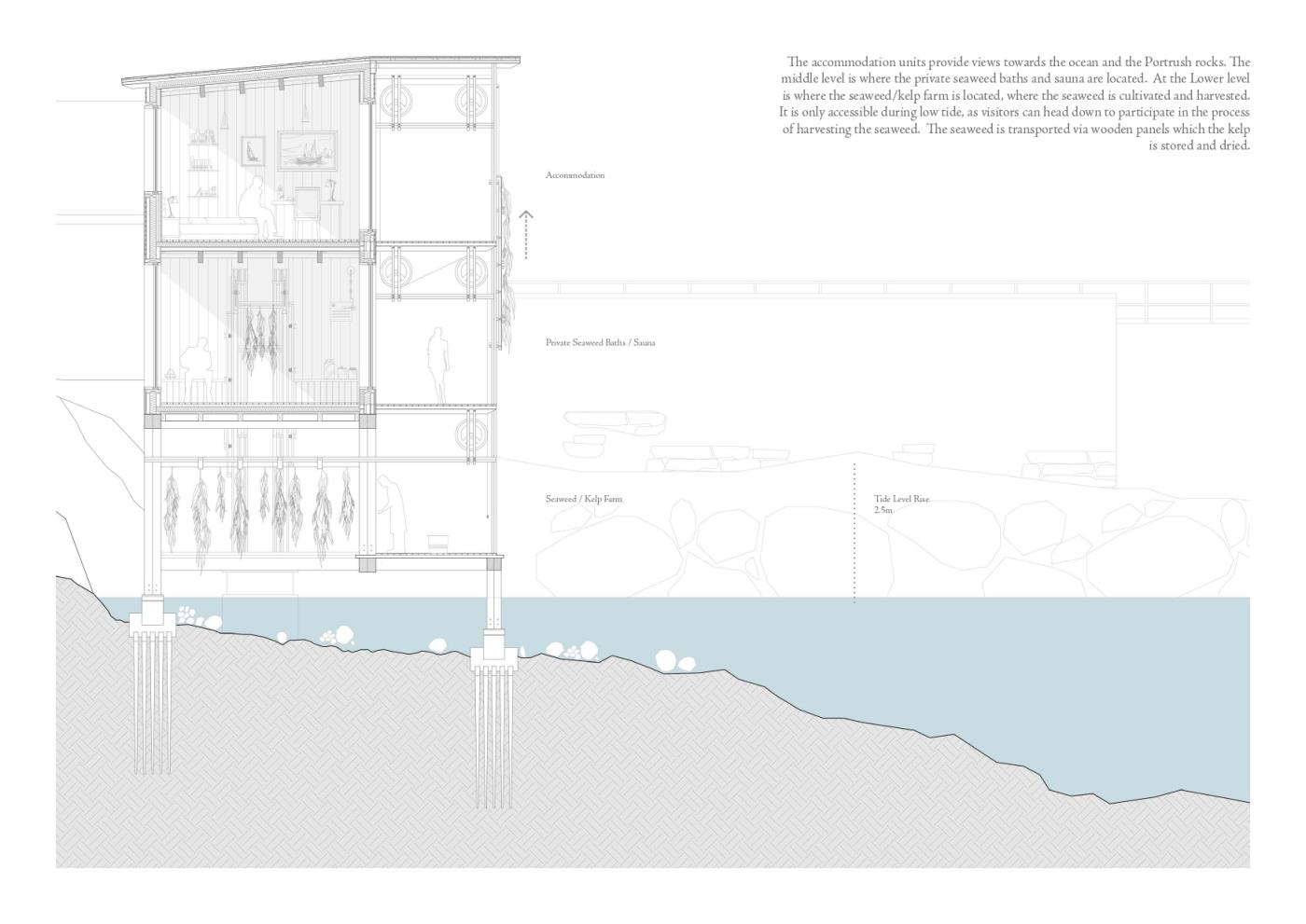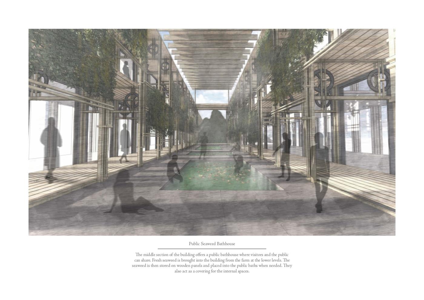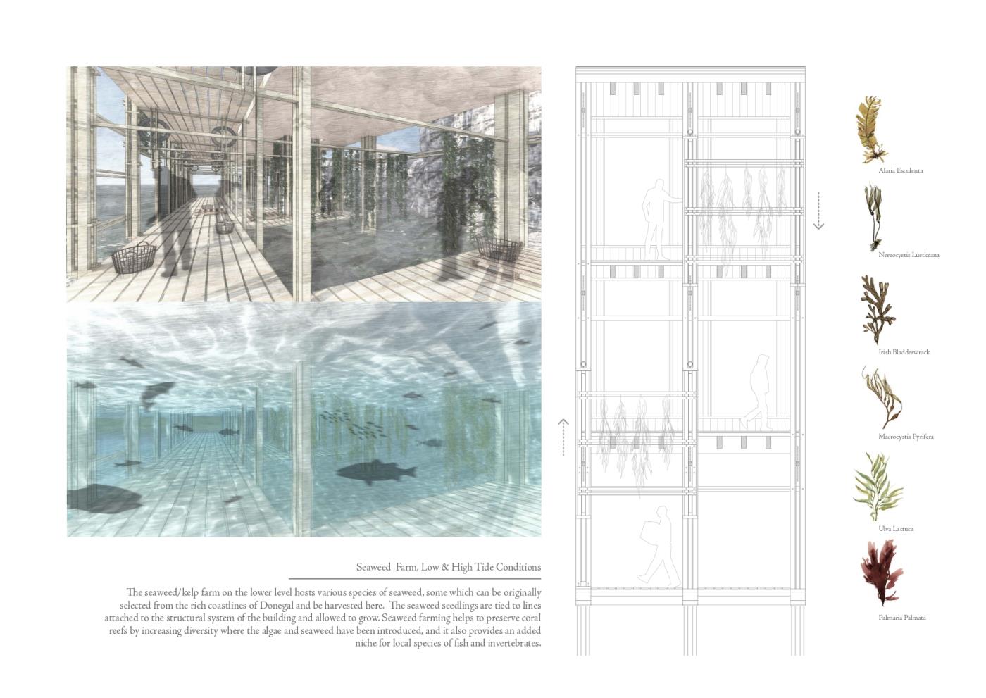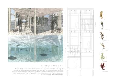 The program allows for visitors to partake and understand the process of seaweed harvesting and its various uses, while addressing the issue of climate change of rising sea-levels. The lower level consists of a seaweed farm which visitors can only access during low tide, as it will be completely submerged during the periods of high tide for the seaweed to grow and promote biodiversity within the shores. The building thus forms a symbiotic relationship with its inhabitants, constantly adapting and mutating.