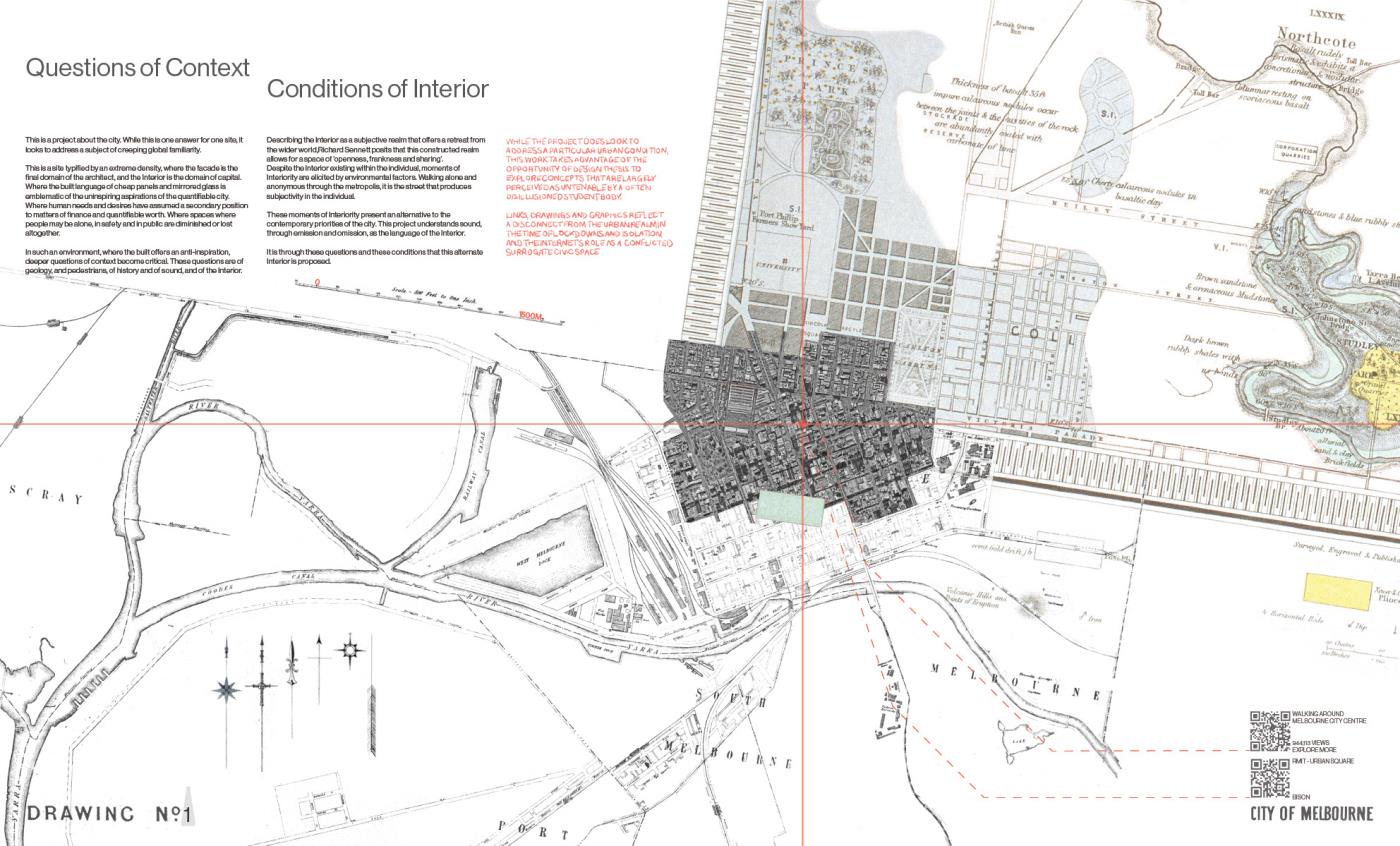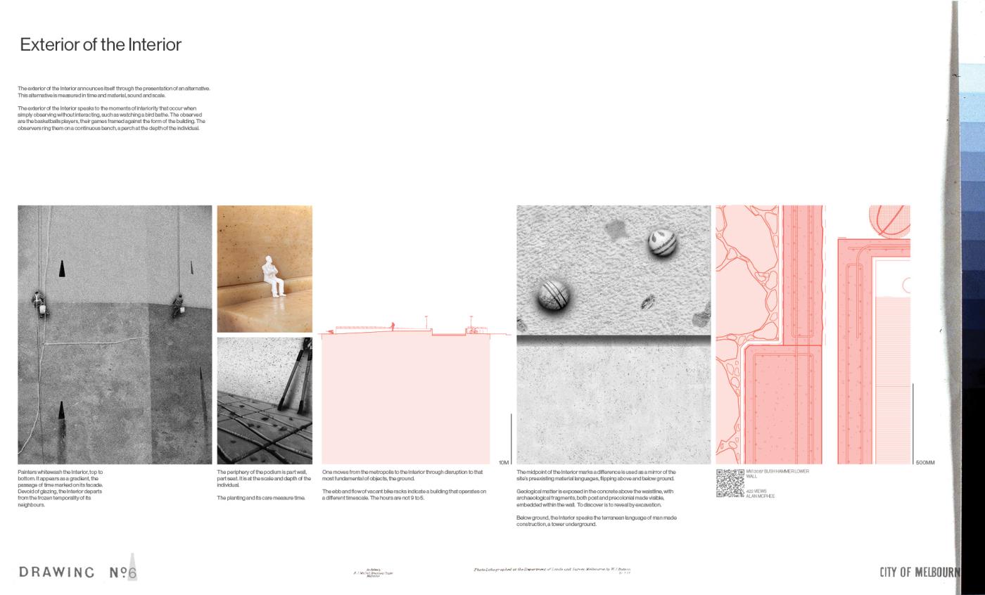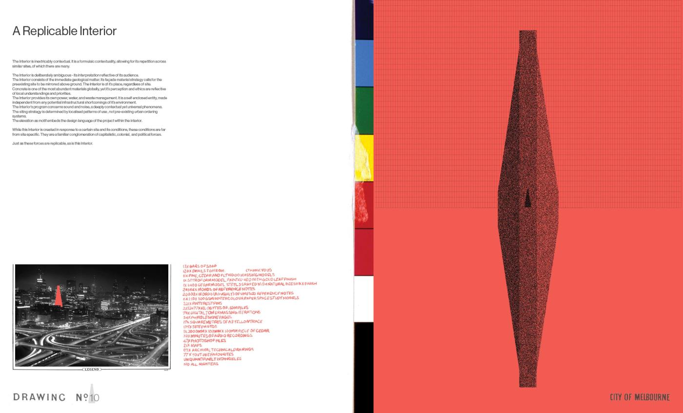 Questions of Context, Conditions of Interior Part 2 Project 2020 Boyd Hellier Knox University of Melbourne | Australia This is a project about the city. While this is one answer for one site, it looks to address a subject of creeping global familiarity.This is a site typified by an extreme density, where the facade is the final domain of the architect, and the Interior is the domain of capital. Where the built language of cheap panels and mirrored glass is emblematic of the uninspiring aspirations of the quantifiable city.In such an environment, where the built offers an anti-inspiration, deeper questions of context become critical. These questions are of geology, and pedestrians, of history and of sound, and of the Interior.Describing the Interior as a subjective realm that offers a retreat from the wider world, Richard Sennett posits that this constructed realm allows for a space of ‘openness, frankness and sharing’. These moments of Interiority present an alternative to the contemporary priorities of the city. This Interior is a tower. This Interior seeks to challenge spatially embedded practises of capitalism, colonialism, and quantification. This Interior advocates for the civic, and for the spaces where people may be alone in safety and in public. This Interior proposes an alternative. Tutor(s) Alan Pert