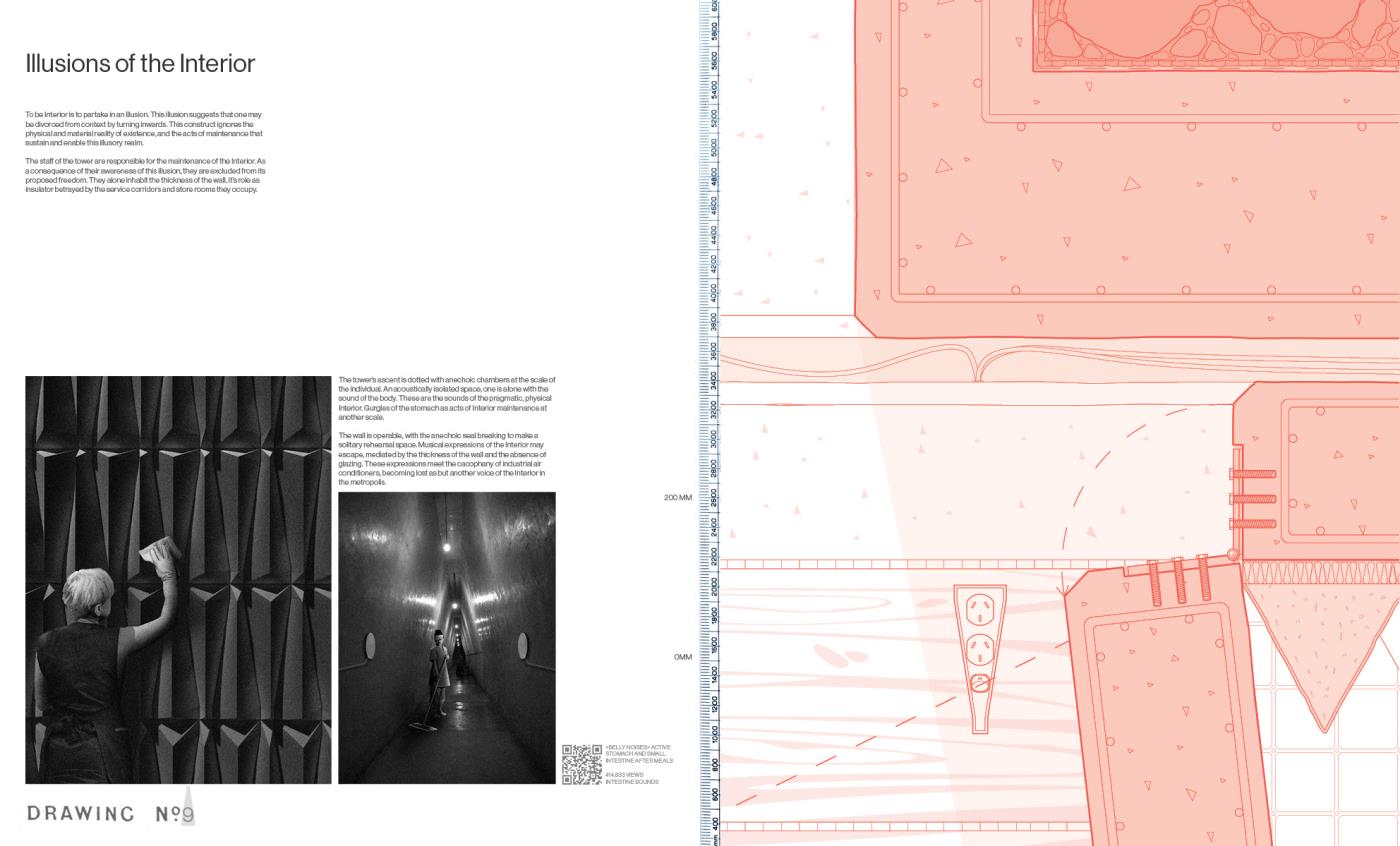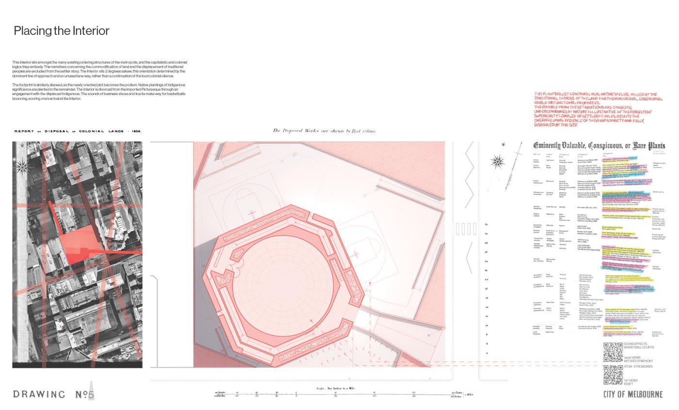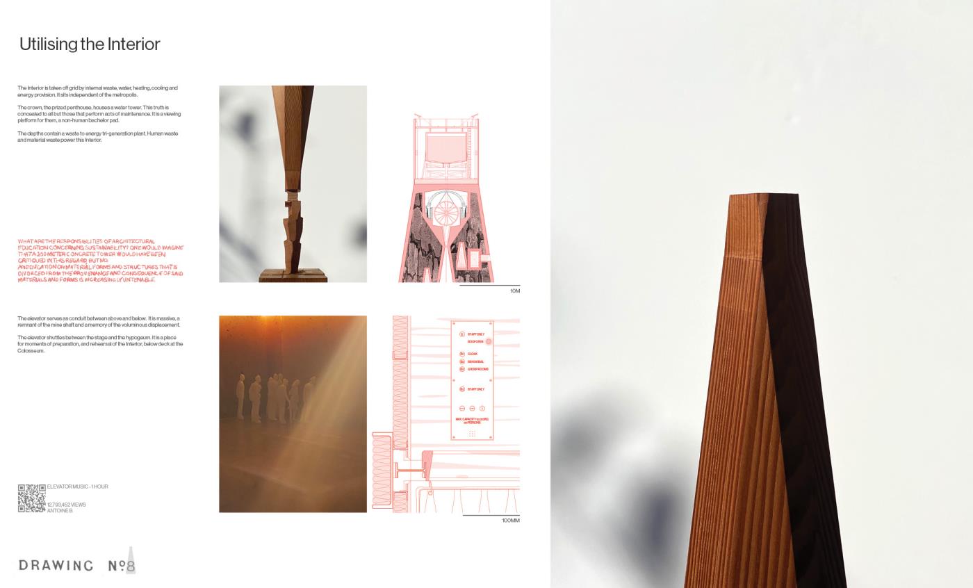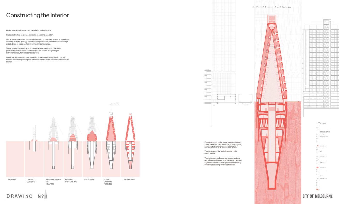 Questions of Context, Conditions of Interior Part 2 Project 2020 Boyd Hellier Knox University of Melbourne | Australia This is a project about the city. While this is one answer for one site, it looks to address a subject of creeping global familiarity.This is a site typified by an extreme density, where the facade is the final domain of the architect, and the Interior is the domain of capital. Where the built language of cheap panels and mirrored glass is emblematic of the uninspiring aspirations of the quantifiable city.In such an environment, where the built offers an anti-inspiration, deeper questions of context become critical. These questions are of geology, and pedestrians, of history and of sound, and of the Interior.Describing the Interior as a subjective realm that offers a retreat from the wider world, Richard Sennett posits that this constructed realm allows for a space of ‘openness, frankness and sharing’. These moments of Interiority present an alternative to the contemporary priorities of the city. This Interior is a tower. This Interior seeks to challenge spatially embedded practises of capitalism, colonialism, and quantification. This Interior advocates for the civic, and for the spaces where people may be alone in safety and in public. This Interior proposes an alternative. Tutor(s) Alan Pert