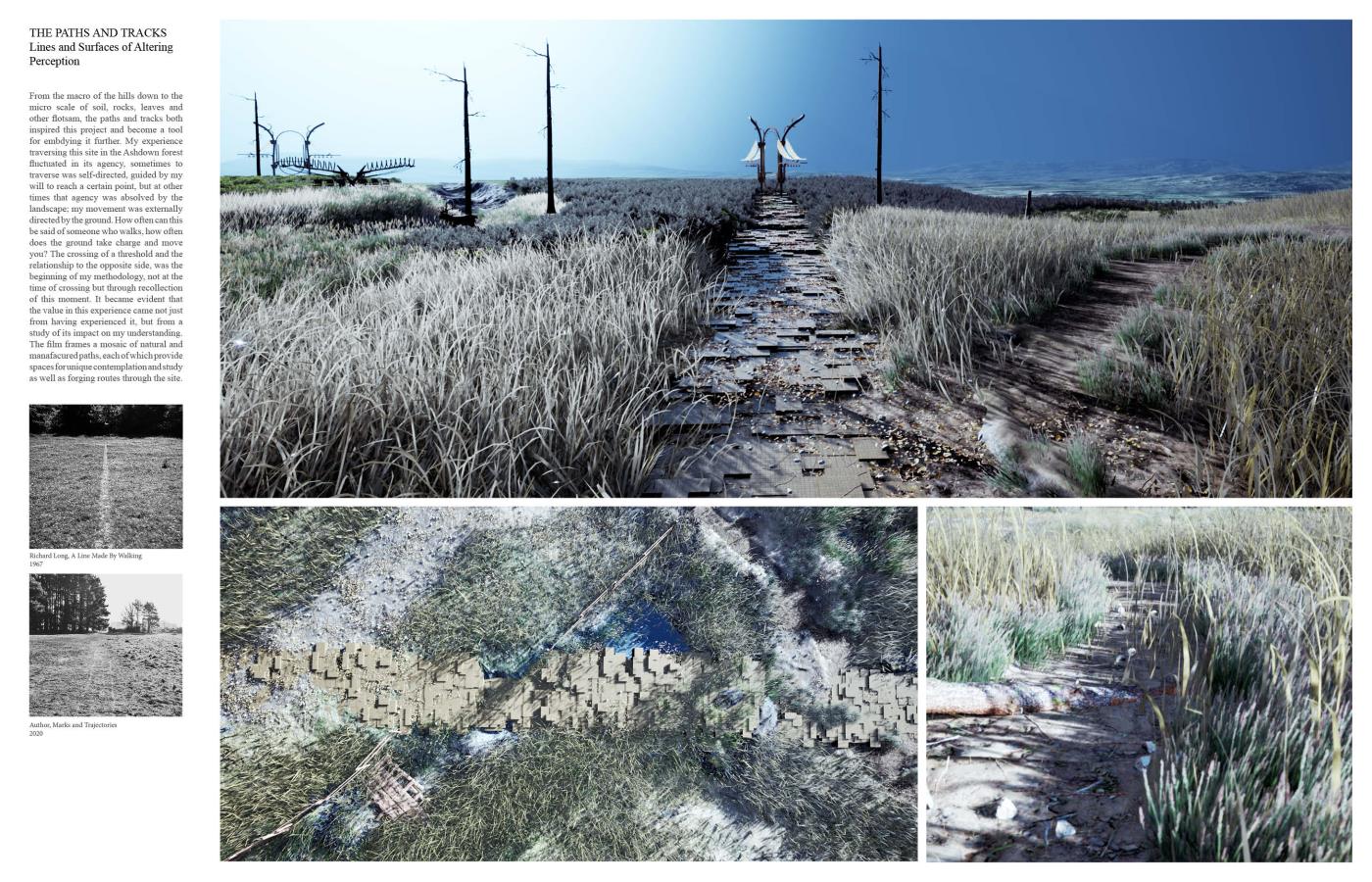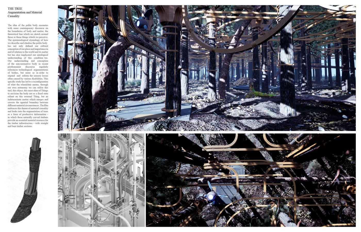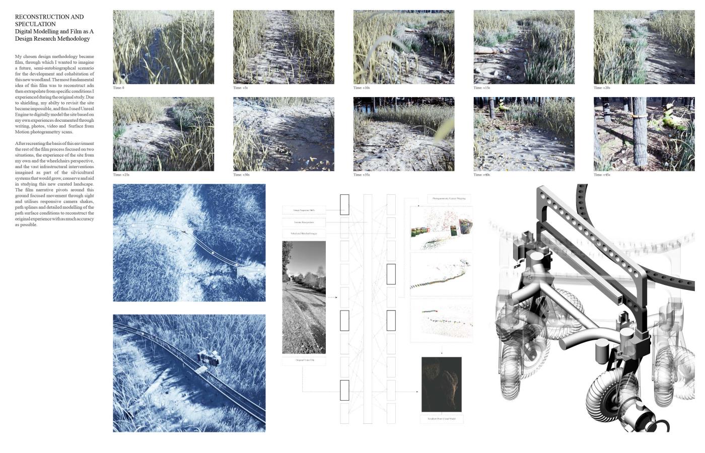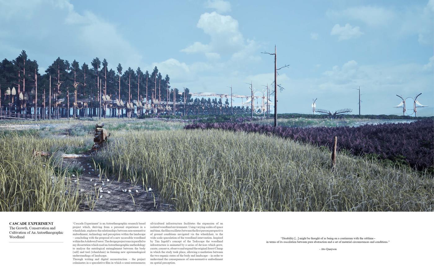 Cascade Experiment: The Growth, Conservation and Cultivation of an Autoethnographic Woodland Part 2 Project 2020 Jordan Whitewood-Neal University of Brighton | UK ‘Cascade Experiment’ is an autoethnographic research based project which, deriving from a personal experience in a wheelchair, explores the relationships between non-normative embodiment, technology and perception within the landscape – concluding with the proposal of a new accessible woodland within the Ashdown Forest. The design project runs in parallel to my dissertation which used an Autoethnographic methodology to analyse the ontological entanglement between the body (self) and tool (wheelchair) in forming new epistemological understandings of landscape.Through writing and digital reconstruction – the project culminates in a speculative film in which a semi-autonomous silvicultural infrastructure facilitates the expansion of an isolated woodland environment. Using varying scales of space and time, the film oscillates between the first person perspective of ground conditions navigated via the wheelchair, to the wide scale speculation of the woodland intervention.Inspired by Tim Ingold’s concept of the Taskscape the woodland infrastructure is animated by a series of devices which grow, curate, conserve, observe and expand the original forest Clump in which the study took place, allowing a mediation between the two organic states of the body and landscape – in order to understand the consequences of non-normative embodiment on spatial perception. Tutor(s) Simon Beames