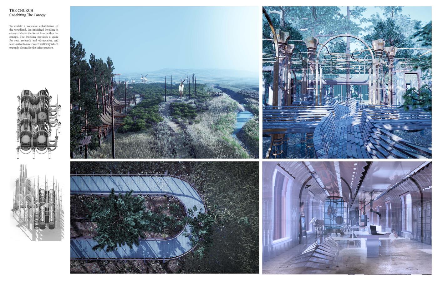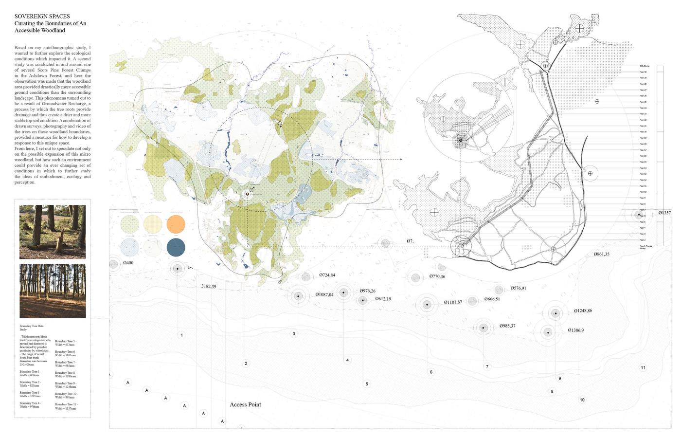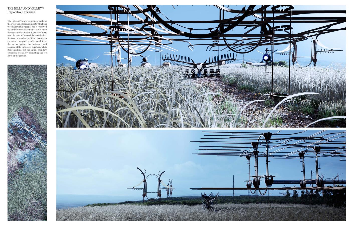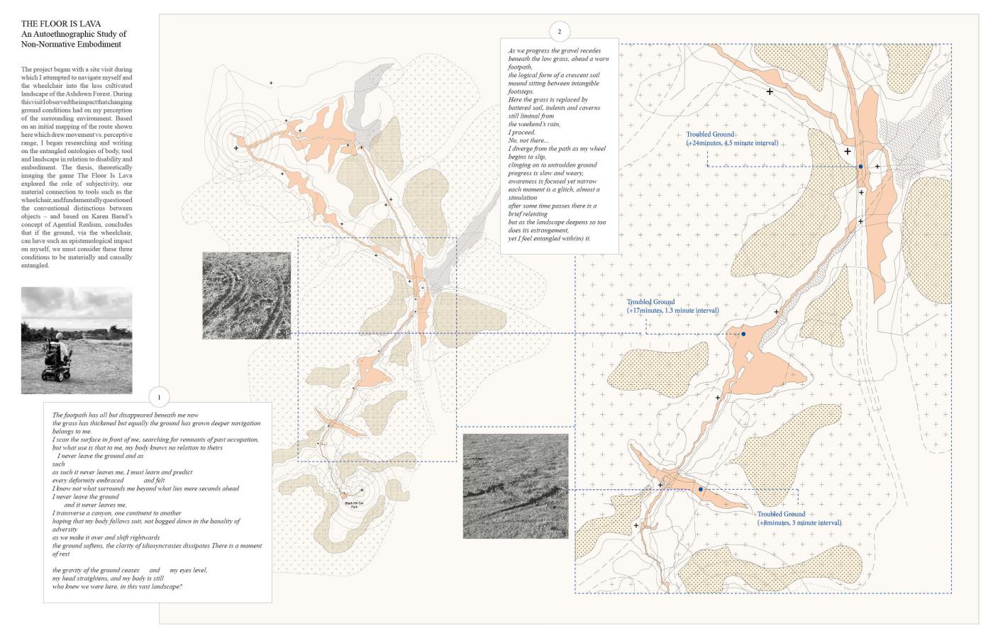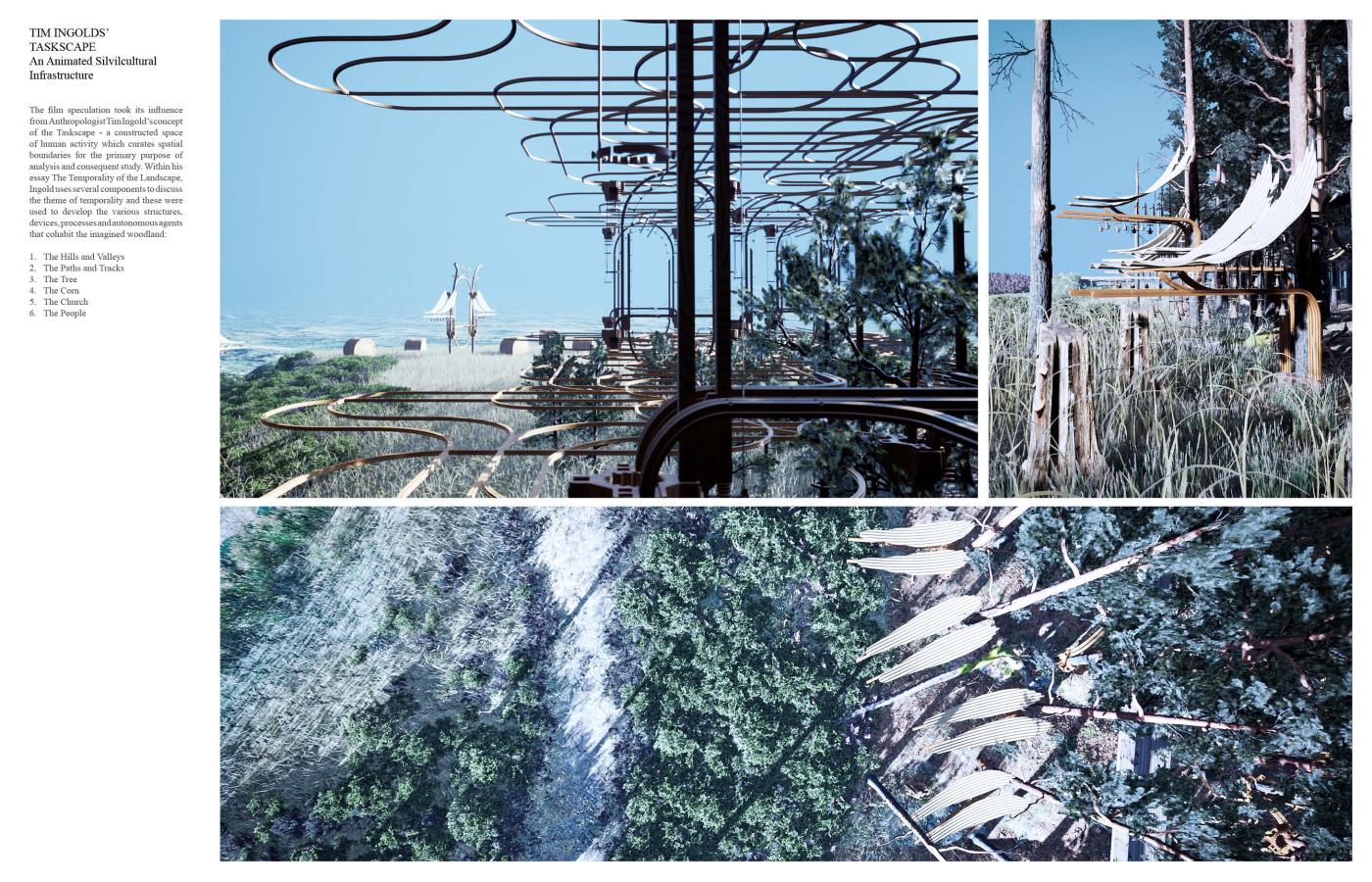 Cascade Experiment: The Growth, Conservation and Cultivation of an Autoethnographic Woodland Part 2 Project 2020 Jordan Whitewood-Neal University of Brighton | UK ‘Cascade Experiment’ is an autoethnographic research based project which, deriving from a personal experience in a wheelchair, explores the relationships between non-normative embodiment, technology and perception within the landscape – concluding with the proposal of a new accessible woodland within the Ashdown Forest. The design project runs in parallel to my dissertation which used an Autoethnographic methodology to analyse the ontological entanglement between the body (self) and tool (wheelchair) in forming new epistemological understandings of landscape.Through writing and digital reconstruction – the project culminates in a speculative film in which a semi-autonomous silvicultural infrastructure facilitates the expansion of an isolated woodland environment. Using varying scales of space and time, the film oscillates between the first person perspective of ground conditions navigated via the wheelchair, to the wide scale speculation of the woodland intervention.Inspired by Tim Ingold’s concept of the Taskscape the woodland infrastructure is animated by a series of devices which grow, curate, conserve, observe and expand the original forest Clump in which the study took place, allowing a mediation between the two organic states of the body and landscape – in order to understand the consequences of non-normative embodiment on spatial perception. Tutor(s) Simon Beames