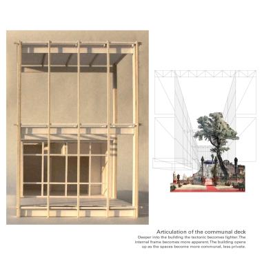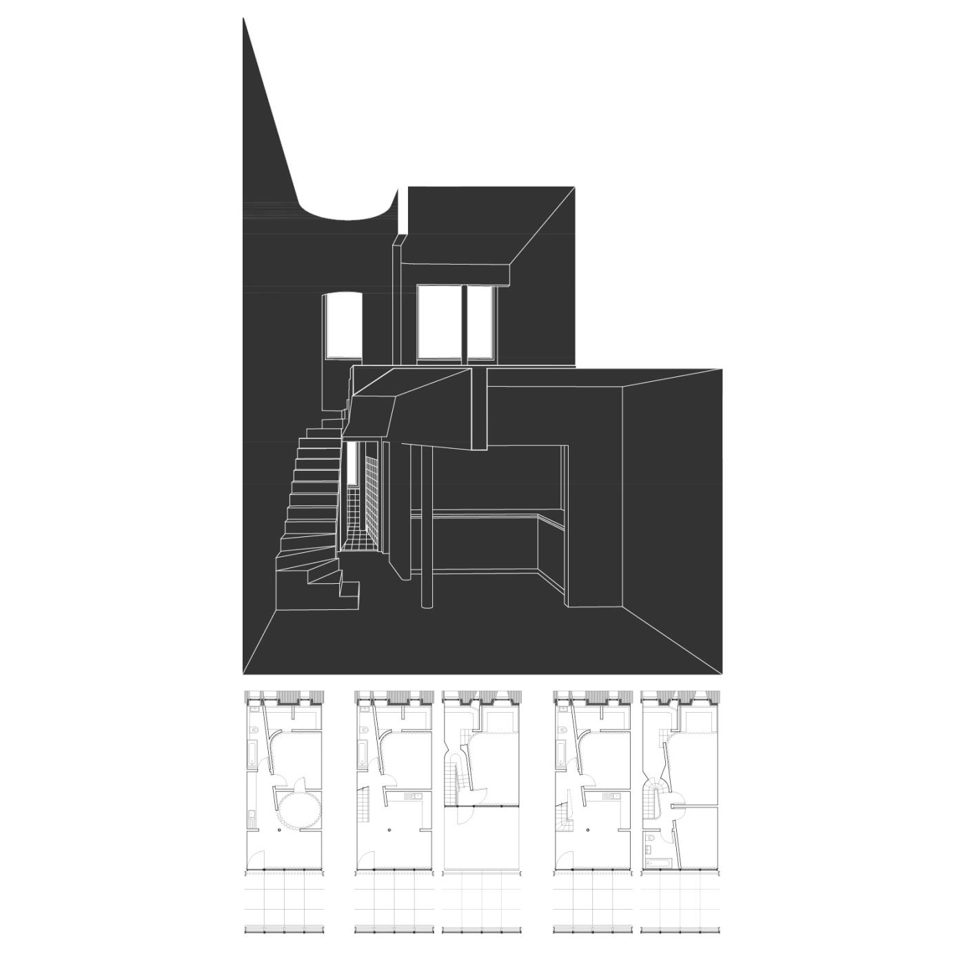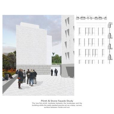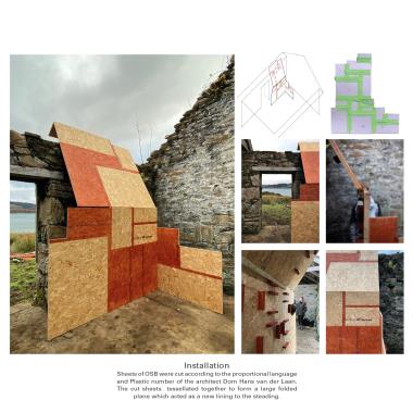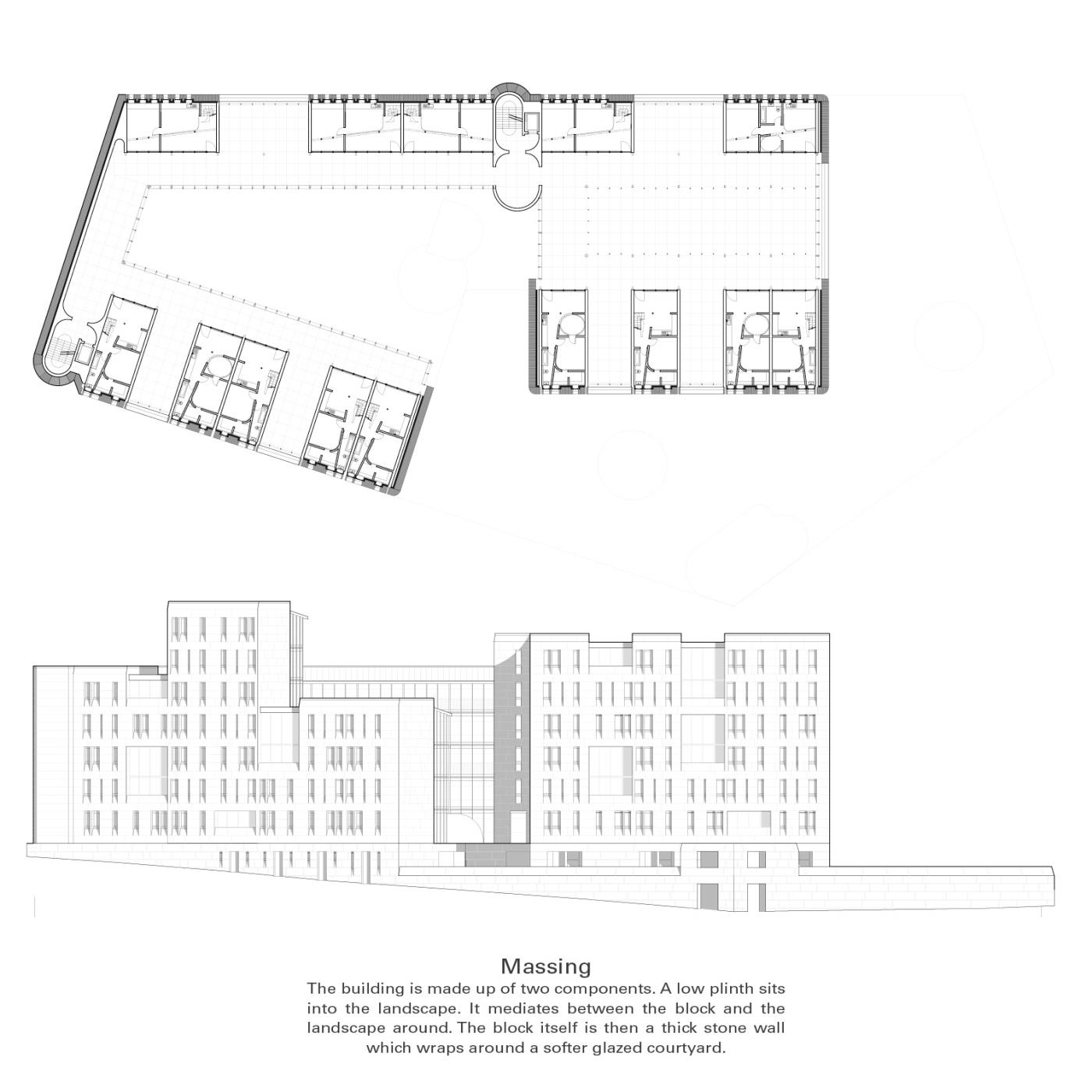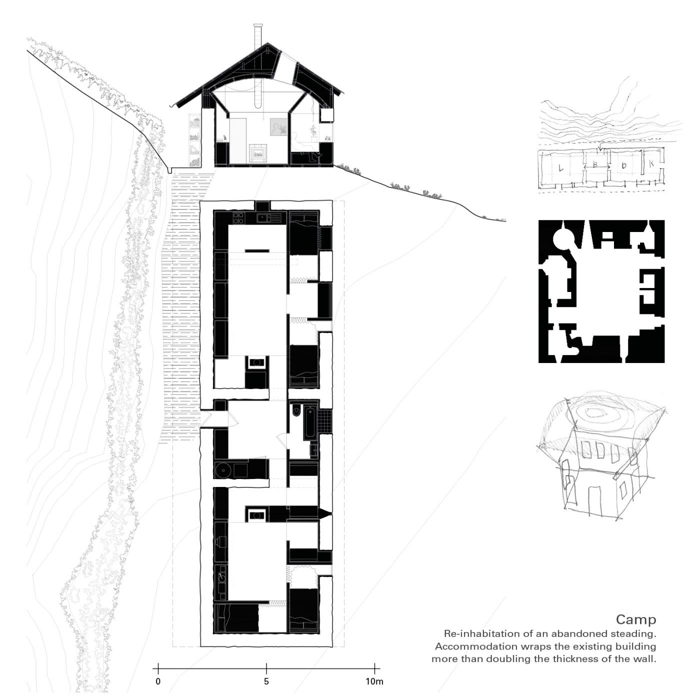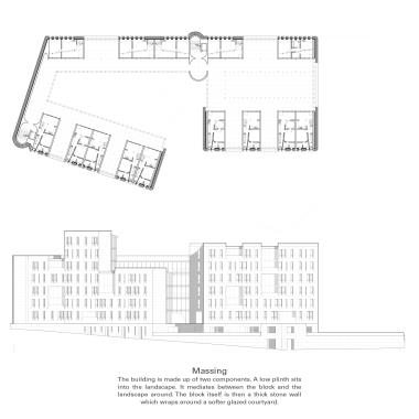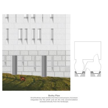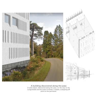 Lunga Castle Housing: An Examination of a New Settlement Within a Rural Landscape Part 2 Project 2020 Reuben Roberts Kingston University Kingston | UK Craignish Peninsula is a remote territory on the west coast of Scotland — a small spur of mainland before the islands of the Inner Hebrides.The thesis was to create a settlement within the landscape. The connection between the context and the home was modulated through inhabitation of the wall. This was examined with the temporary installation at Kirkton Steading. Pre-cut sheets of OSB were arranged into a large secondary lining, a doubling, of the existing wall. This was further developed to consider temporary living on the peninsula. The Camp project provided quarters for visiting workers. Accommodation lined the walls and defined communal spaces for living and dining in the centre.Viewed from a distance the settlement looks massive and faceted: drawing in morphology from the castles and defensive towers native to Scotland. The building is a single block, sitting within the landscape, focussed and intense, rather than the sprawl of the nearby villages.The 56 flats act as deep linings of the walls. These form large public rooms in the centre of scheme allowing people to congregate inside, away from the inclement climate of the site. The spaces within are graded from the lightweight frame of the communal decks through the flats to intensely private rooms carved into the lining of the windows looking out across the landscape. Tutor(s) Roz Barr Helen Thomas