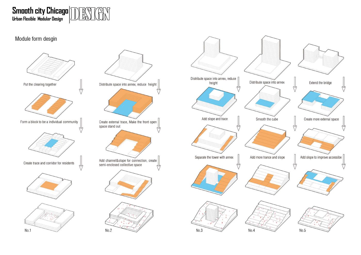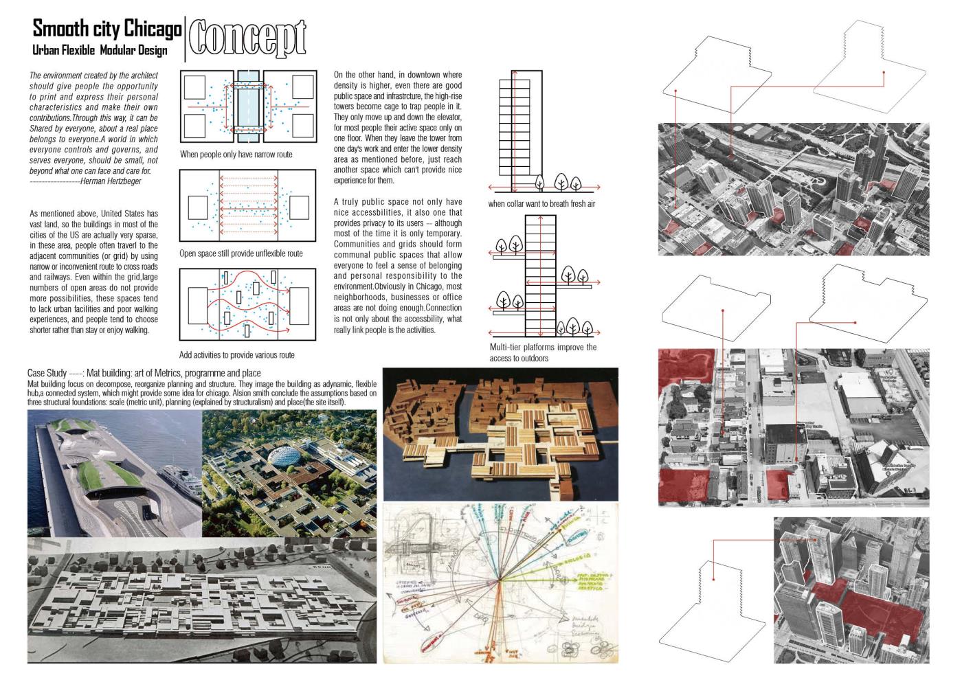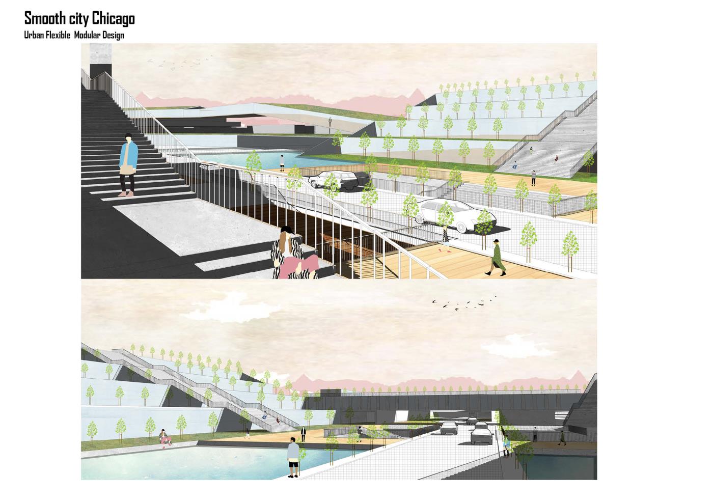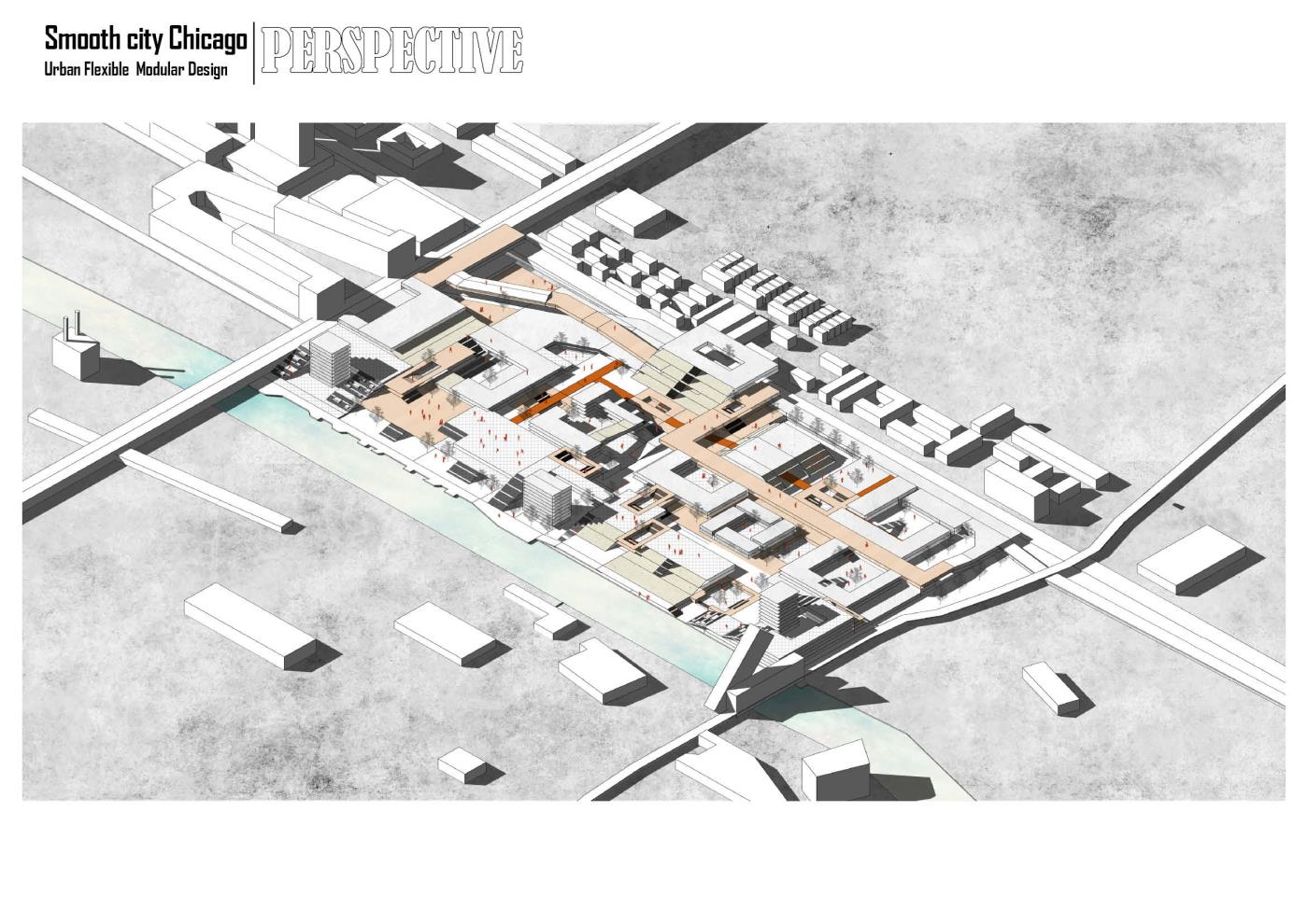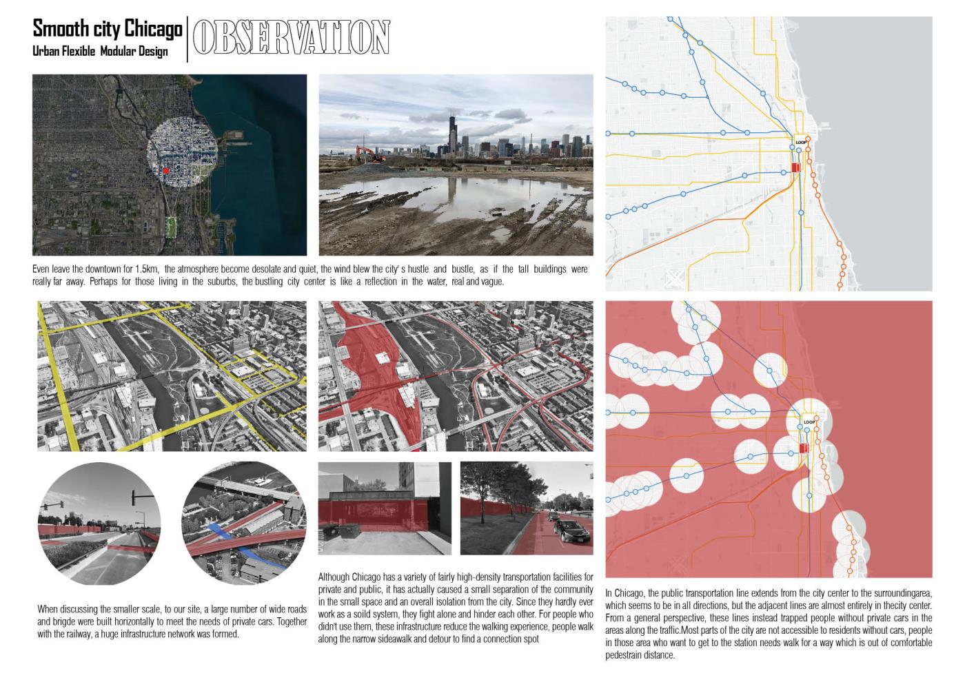 Smooth City Chicago - Urban Flexible Modular Design Part 2 Project 2020 Shize Yang Catholic University of Leuven | Belgium On a large scale, subject to the architectural trend of the United States during the urbanization process and the car-oriented planning concept, the slow development and the lack of connection between public transportation has not become a link between the various regions, but instead traps people In terms of transportation lines, most parts of the city are not accessible to residents without cars. The high-rise buildings also become prisoners for imprisonment. The range of movement of users is only one floor in the tower, and the traffic between the areas is all vertical And the open space with too small base cloth can't satisfy their activities at all.This paper focuses on analyzing the current problems, rather than the development of past history, aim at choose a compromise angle to define the function, but more importantly, it tries to create a relatively low and smooth continuous space by introducing infrastructure and changing the form of the building, while also allowing the area to be connected to the surrounding area. This kind of hub of public transportation network, on the scale of the whole city, helps the connectivity between regions in a larger area. Tutor(s) Martine De Maeseneer