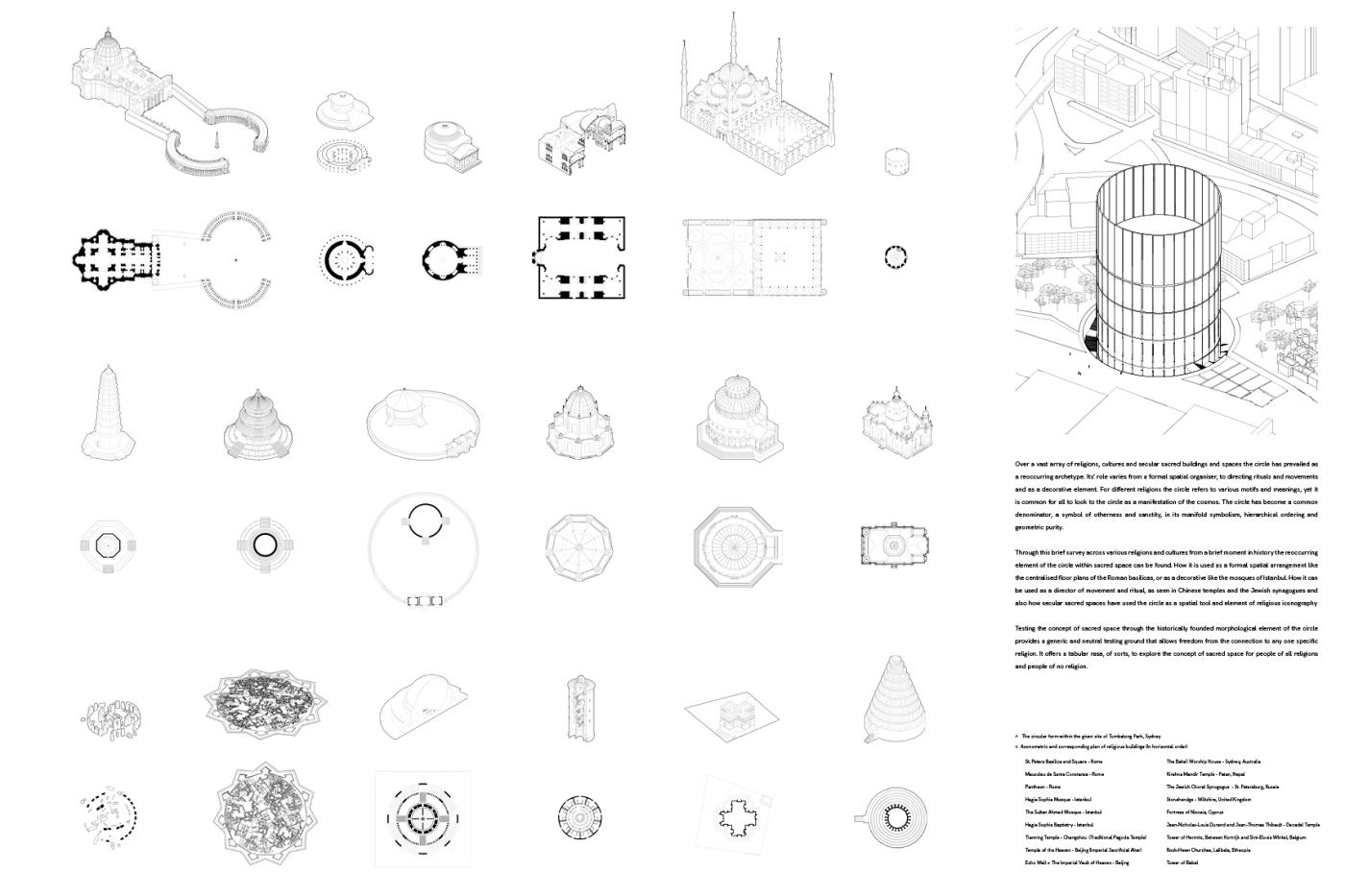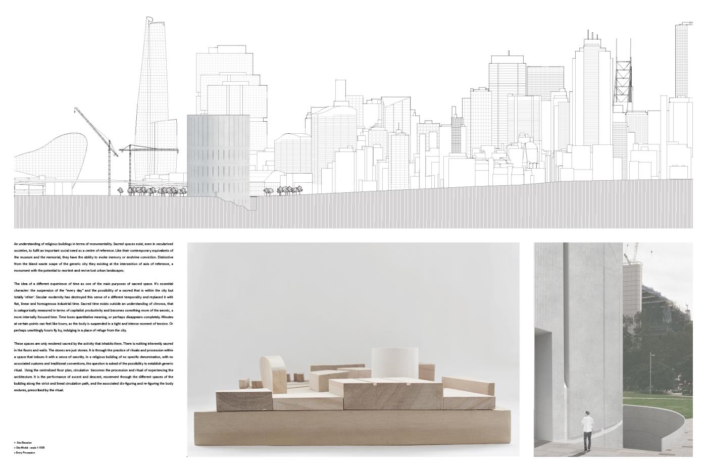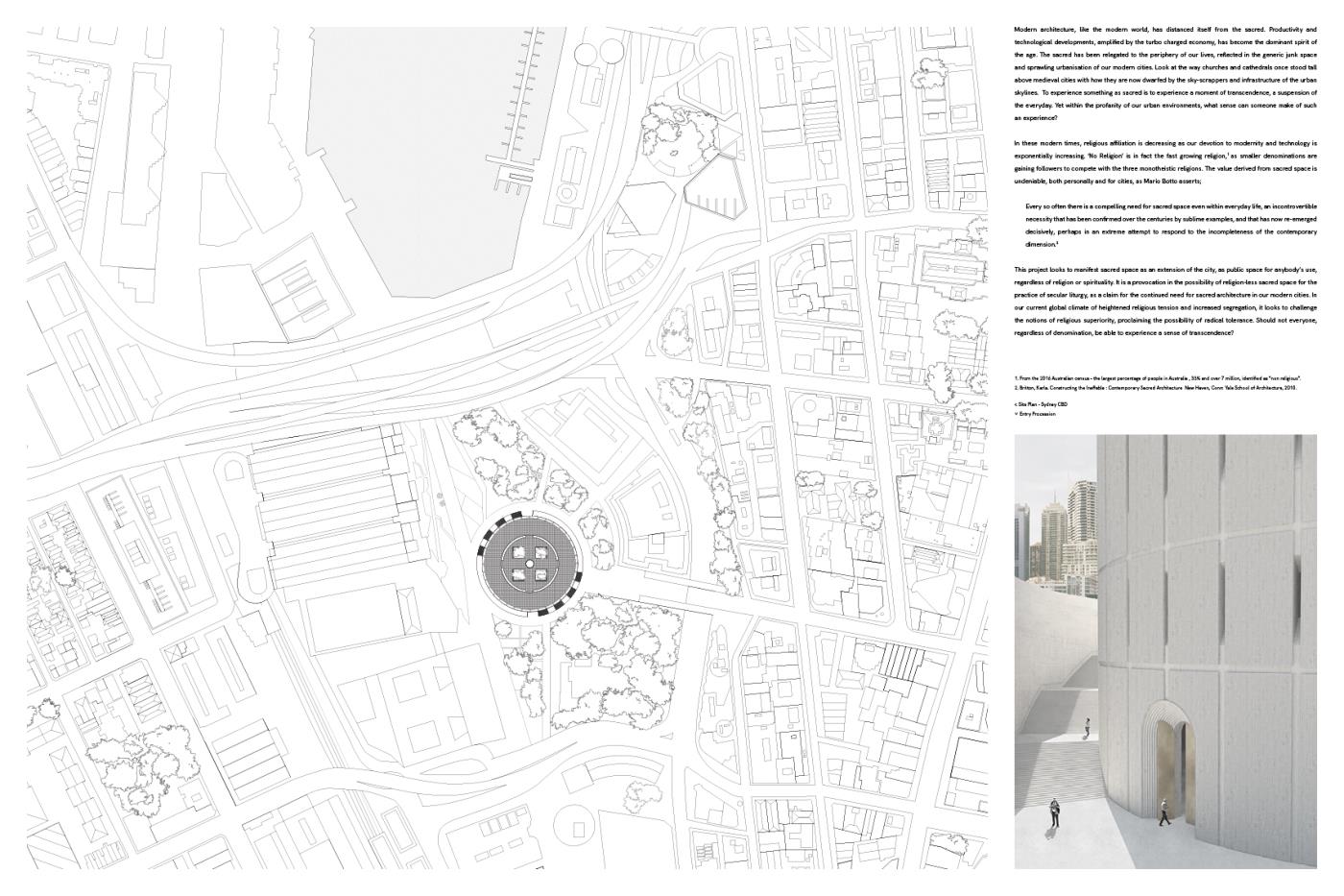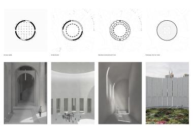 This project looks to manifest the continued need for sacred space, as an extension of the city. Public space for public use, regardless of religion or spirituality. As religious affiliation is decreasing globally, the project looks to the possibility of non-denominational sacred space for the practice of secular liturgy. Establishing the circle as an archetype of religious architecture, the specificity of the site and formal restraints became a testing ground for the project in an attempt to translate the notion of neutral and generic sacred space into built form. Amidst the tension of current global situations, this project is not an attempt to provide an escape from reality, but rather an invitation to deeply engage with it.