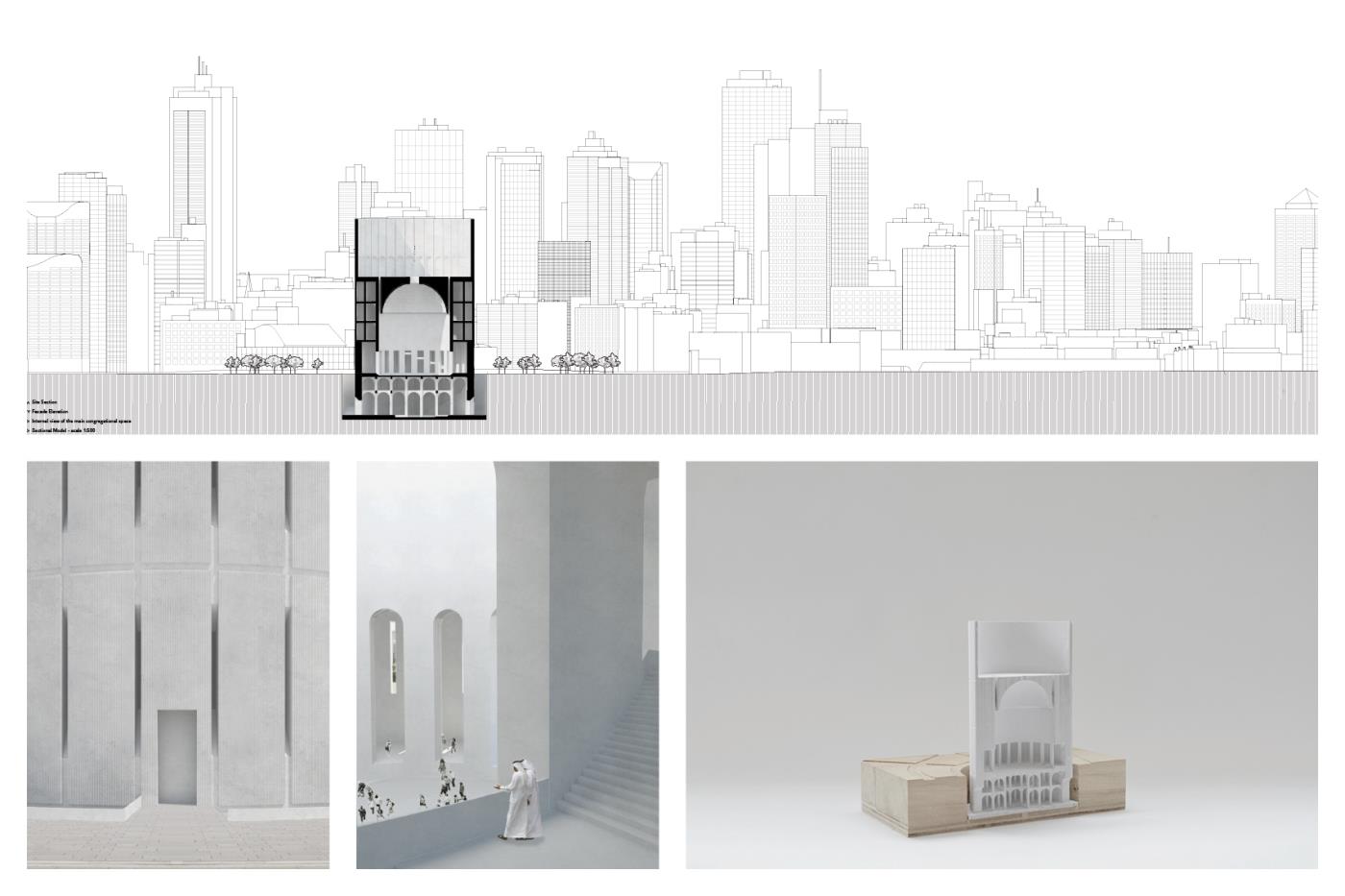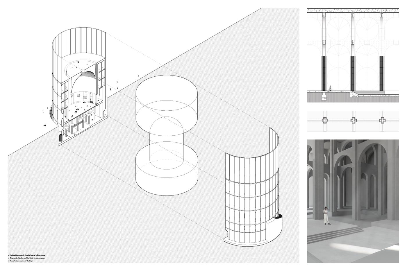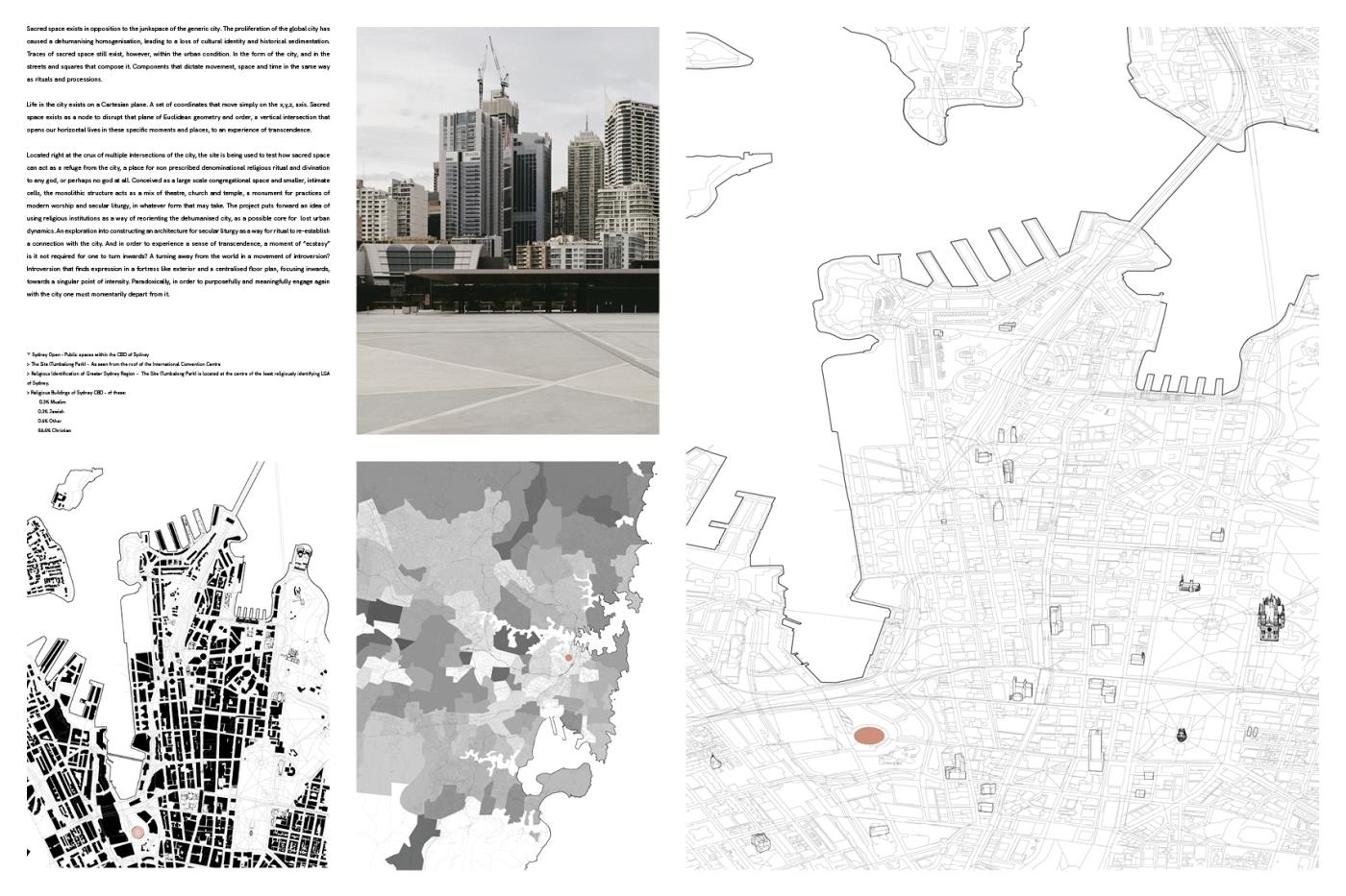This project looks to manifest the continued need for sacred space, as an extension of the city. Public space for public use, regardless of religion or spirituality. As religious affiliation is decreasing globally, the project looks to the possibility of non-denominational sacred space for the practice of secular liturgy. Establishing the circle as an archetype of religious architecture, the specificity of the site and formal restraints became a testing ground for the project in an attempt to translate the notion of neutral and generic sacred space into built form. Amidst the tension of current global situations, this project is not an attempt to provide an escape from reality, but rather an invitation to deeply engage with it.